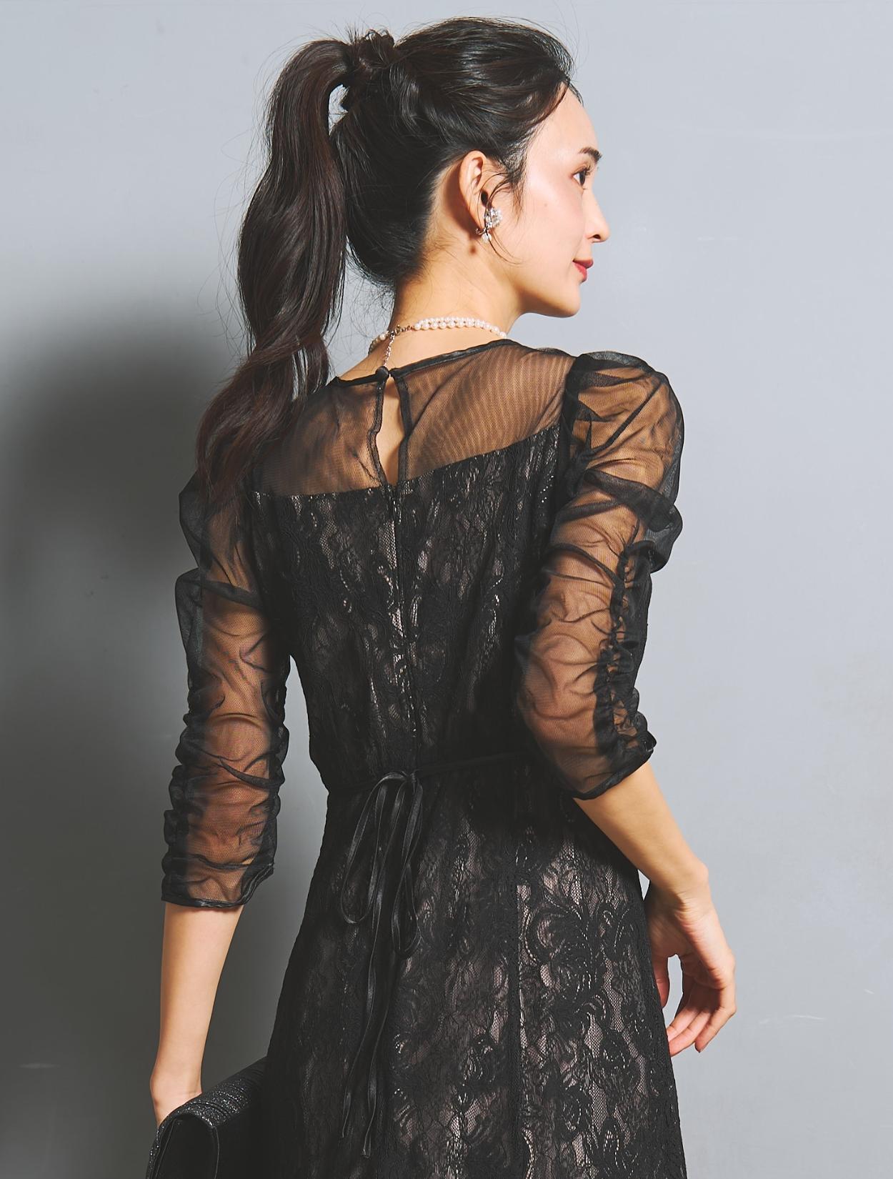 高級感のある上品なレースが目を惹くドレス。デコルテからお袖にかけてはシンプルなシアーチュールが使われているので、レースドレスでも甘くなり過ぎず幅広い年代におすすめです。ギャザーを寄せたお袖のデザインはお顔周りを華やかに見せてくれて、写真写りも良くSNS映えします◎。肩幅が気になる方でも着こなしやすい、控えめなボリューム感なのも嬉しいポイントです。ウエストには華奢なリボン紐が付いているので、キュッと絞って細身の方でもキレイに着こなせます。さりげなくウエストマークできるのでスタイルアップ効果もあり。首元も開きすぎないデザインなので、Sサイズや低身長の方でも着こなしやすいドレスです。ボリュームを落としたフレアスカートは、全体のバランスをすっきり大人っぽく見せてくれます。