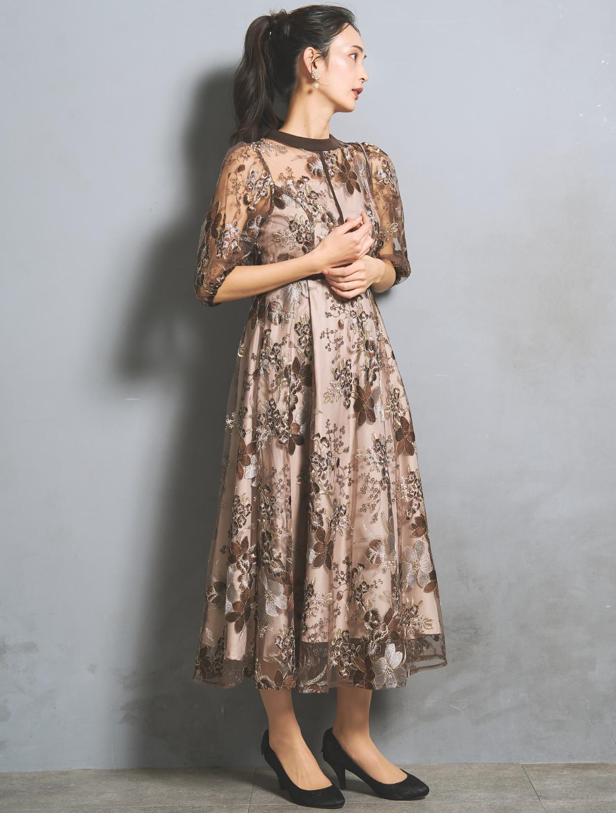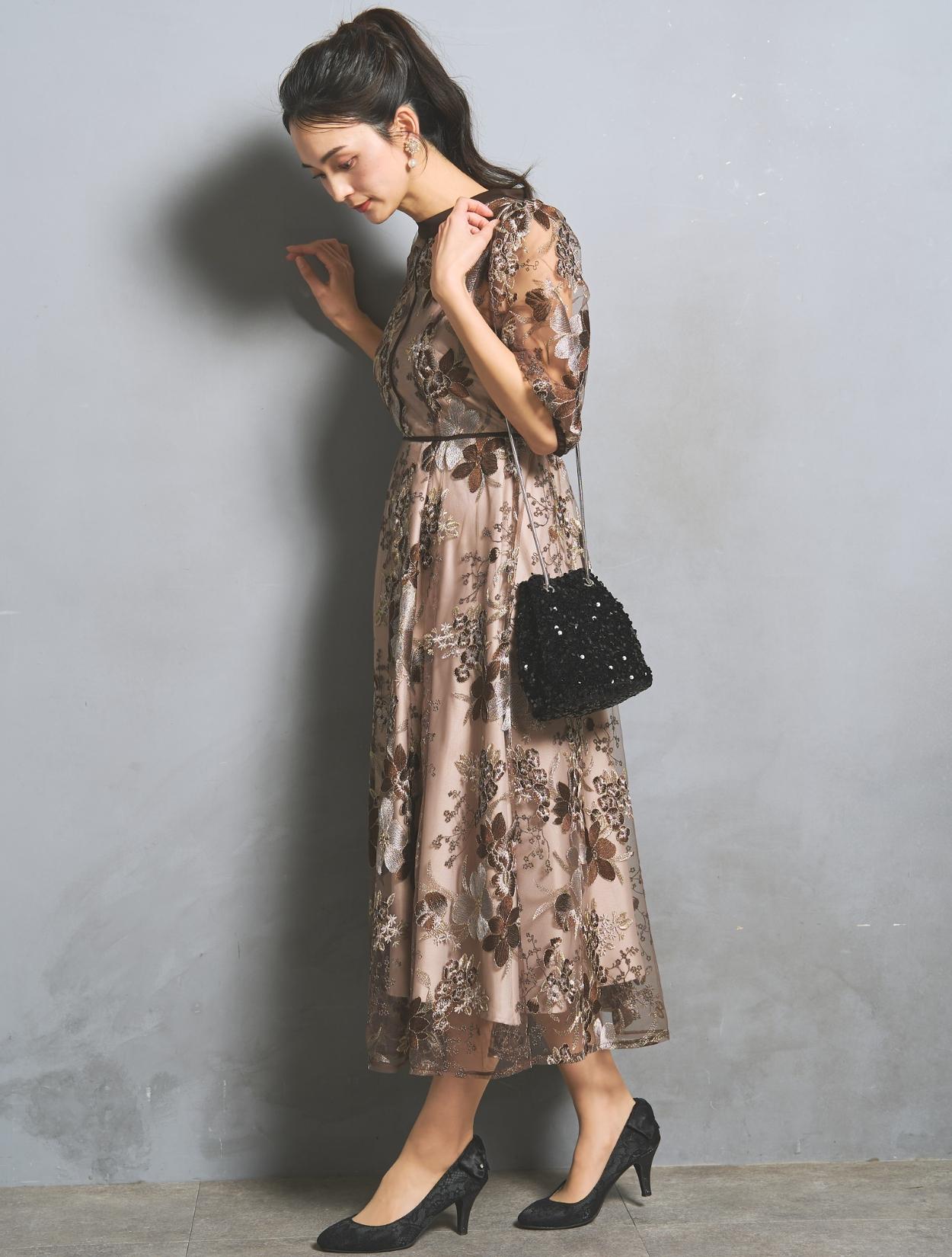 フラワー刺繍レースが華やかなオケージョンドレス。程よい大きさのフラワー柄は、上品な存在感もありパーティーシーンにもぴったりです。刺繍糸には光沢もあり、高級感があるのもポイント。着丈が長過ぎないミニマルなシルエットで、低身長さんにもおすすめのドレスです。