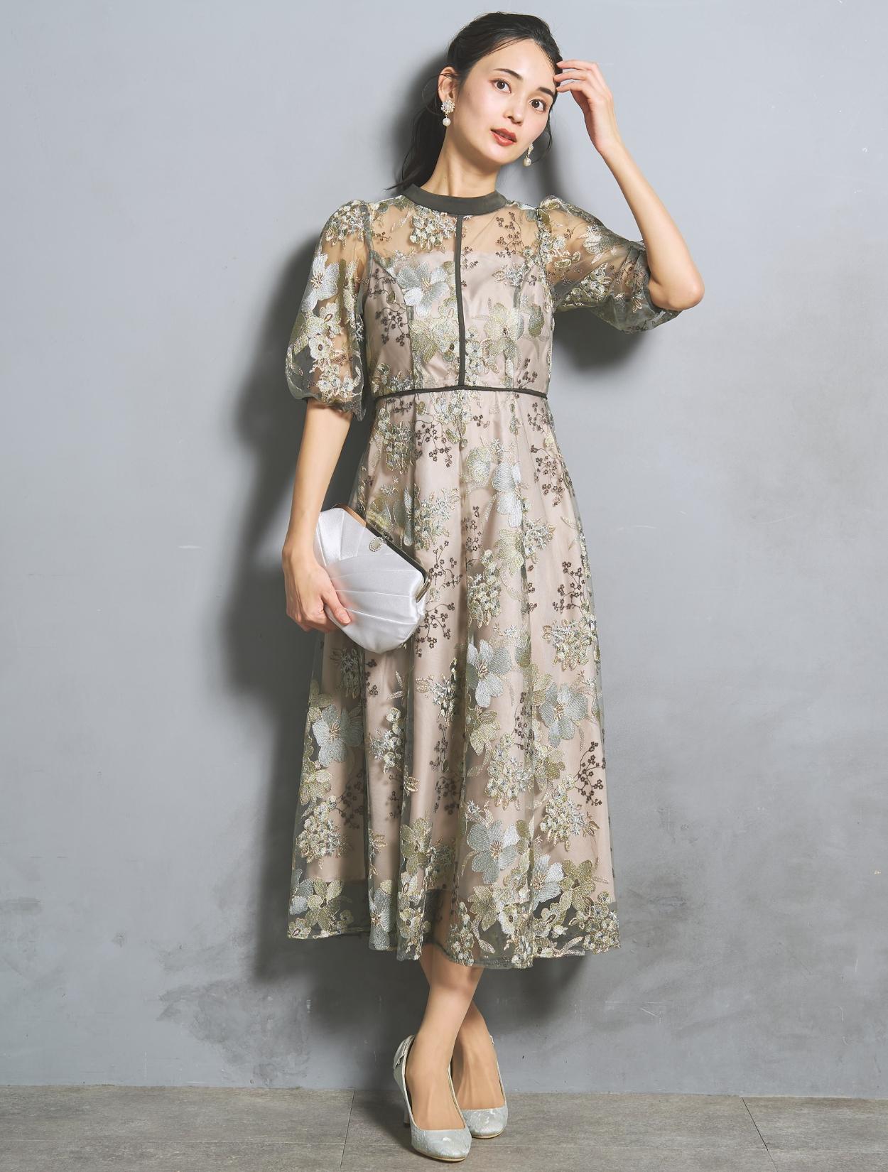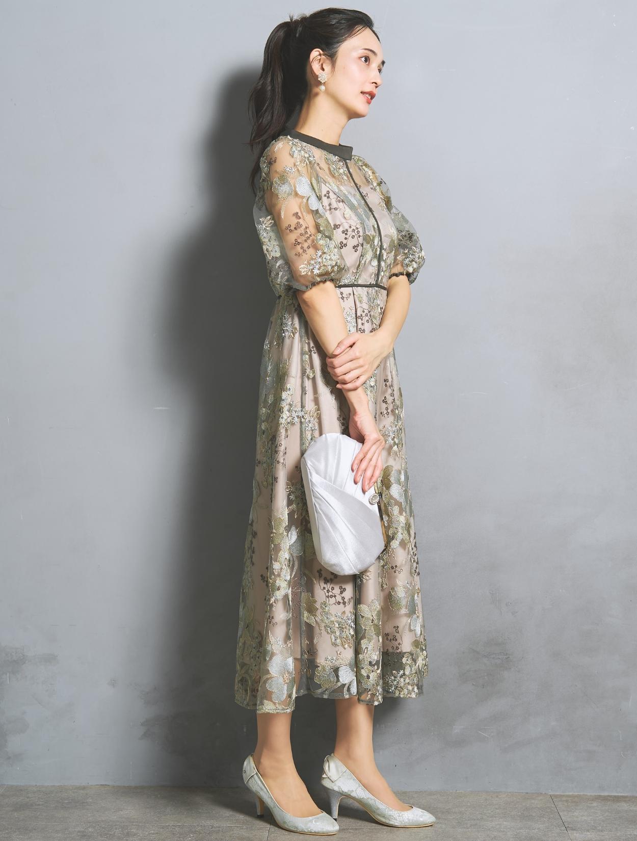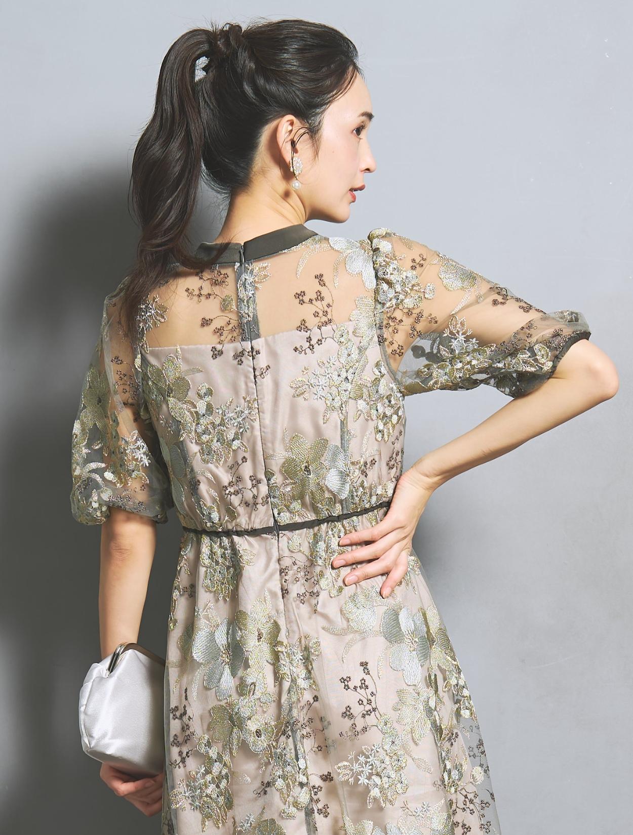 フラワー刺繍レースが華やかなオケージョンドレス。程よい大きさのフラワー柄は、上品な存在感もありパーティーシーンにもぴったりです。刺繍糸には光沢もあり、高級感があるのもポイント。着丈が長過ぎないミニマルなシルエットで、低身長さんにもおすすめのドレスです。