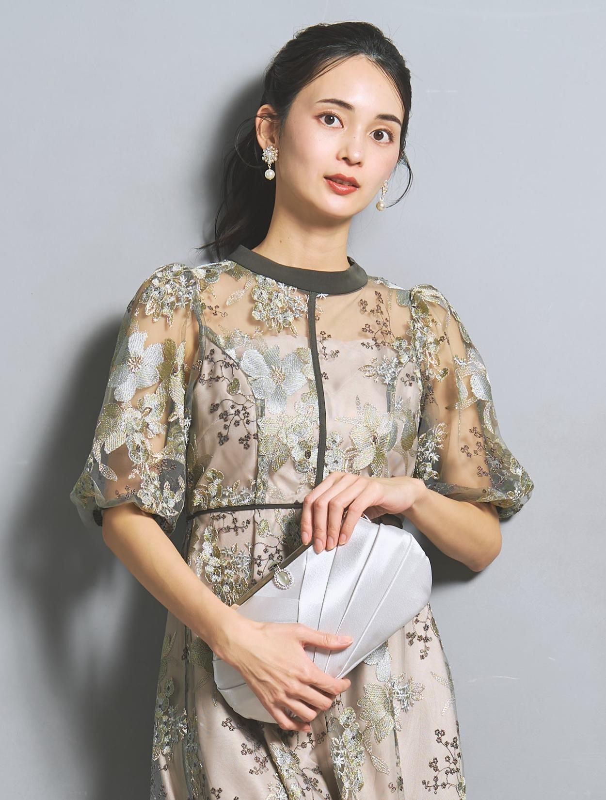 グリーンのドレスにシルバーのバッグを合わせた、スッキリとした清涼感を感じるコーディネート。丸みのあるシルエットのバッグは、どこか柔らかな雰囲気もあり全体のバランスも◎。お顔周りを華やかに見せてくれるフラワーモチーフのイヤリングは、フラワー刺繍にもリンクして全体の雰囲気も格上げしてくれます。