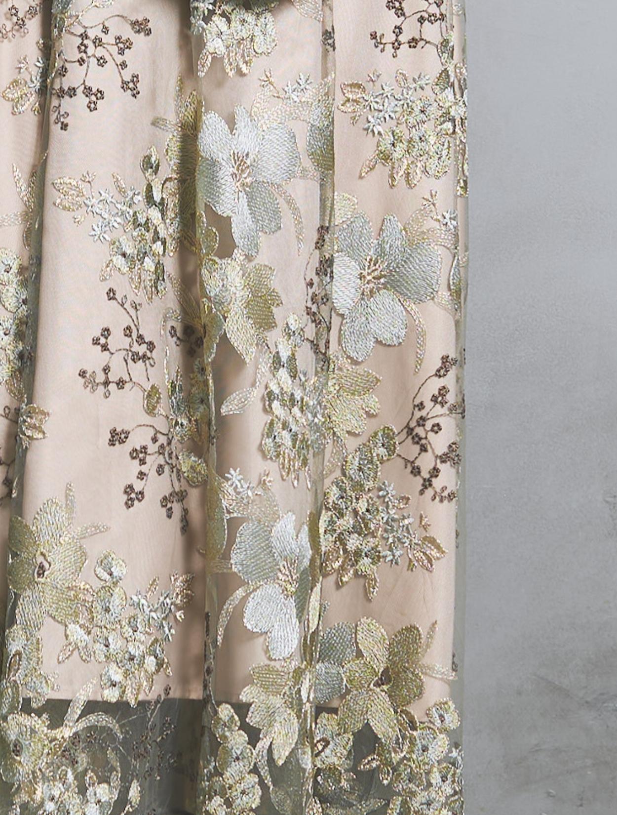 モスグリーンのパイピングが、可憐なフラワー刺繍レースのアクセントになります。淡く爽やかな薄いグリーン系の刺繍に、アイスブルーのフラワー柄が映えてメリハリに。優しい配色で着こなしやすいのもポイント。