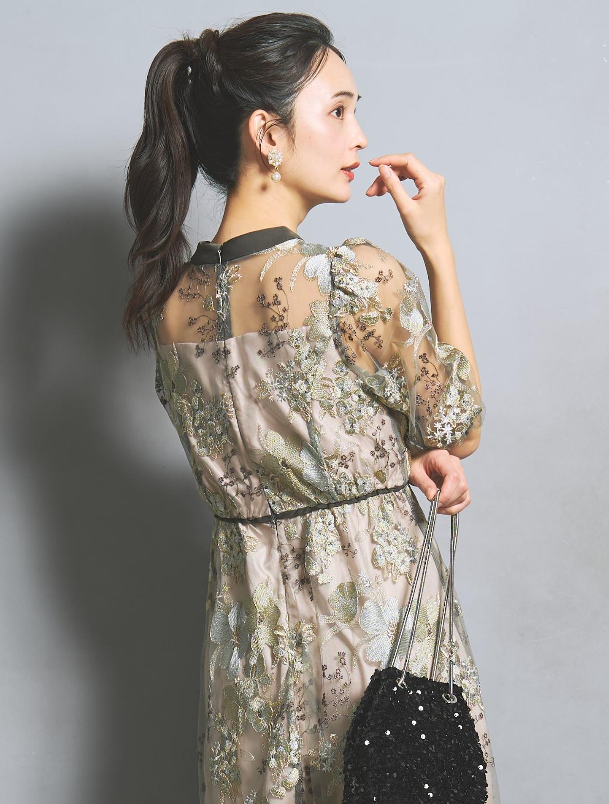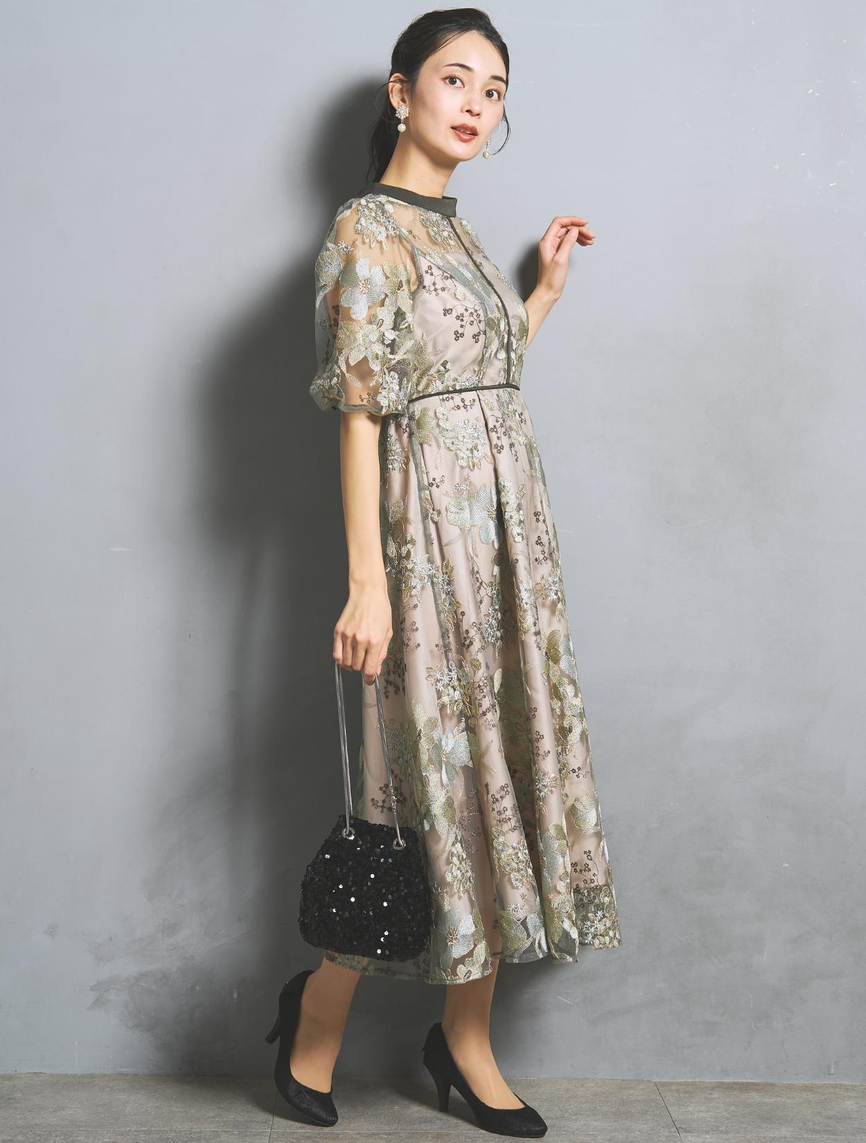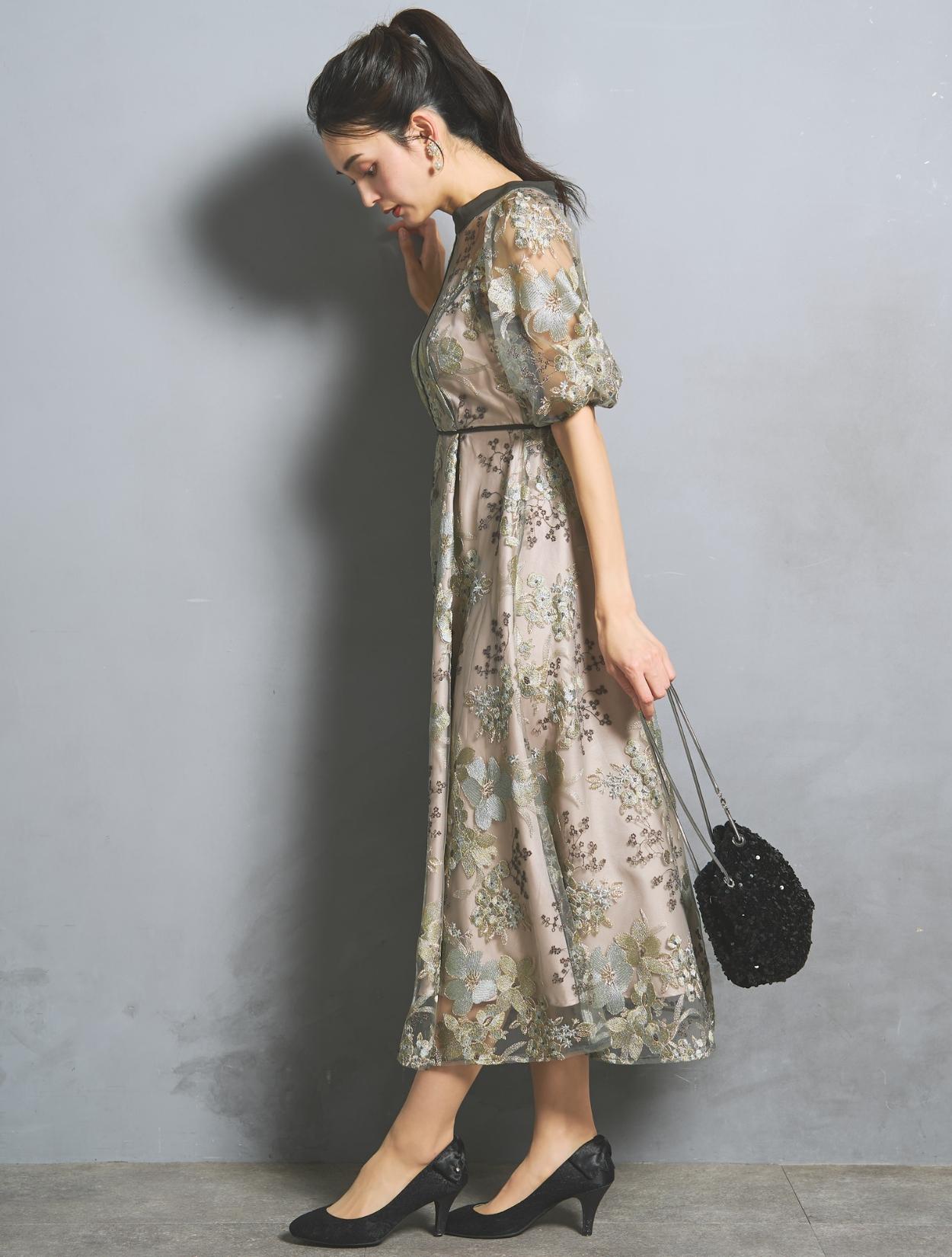 フラワー刺繍レースが華やかなオケージョンドレス。程よい大きさのフラワー柄は、上品な存在感もありパーティーシーンにもぴったりです。刺繍糸には光沢もあり、高級感があるのもポイント。着丈が長過ぎないミニマルなシルエットで、低身長さんにもおすすめのドレスです。