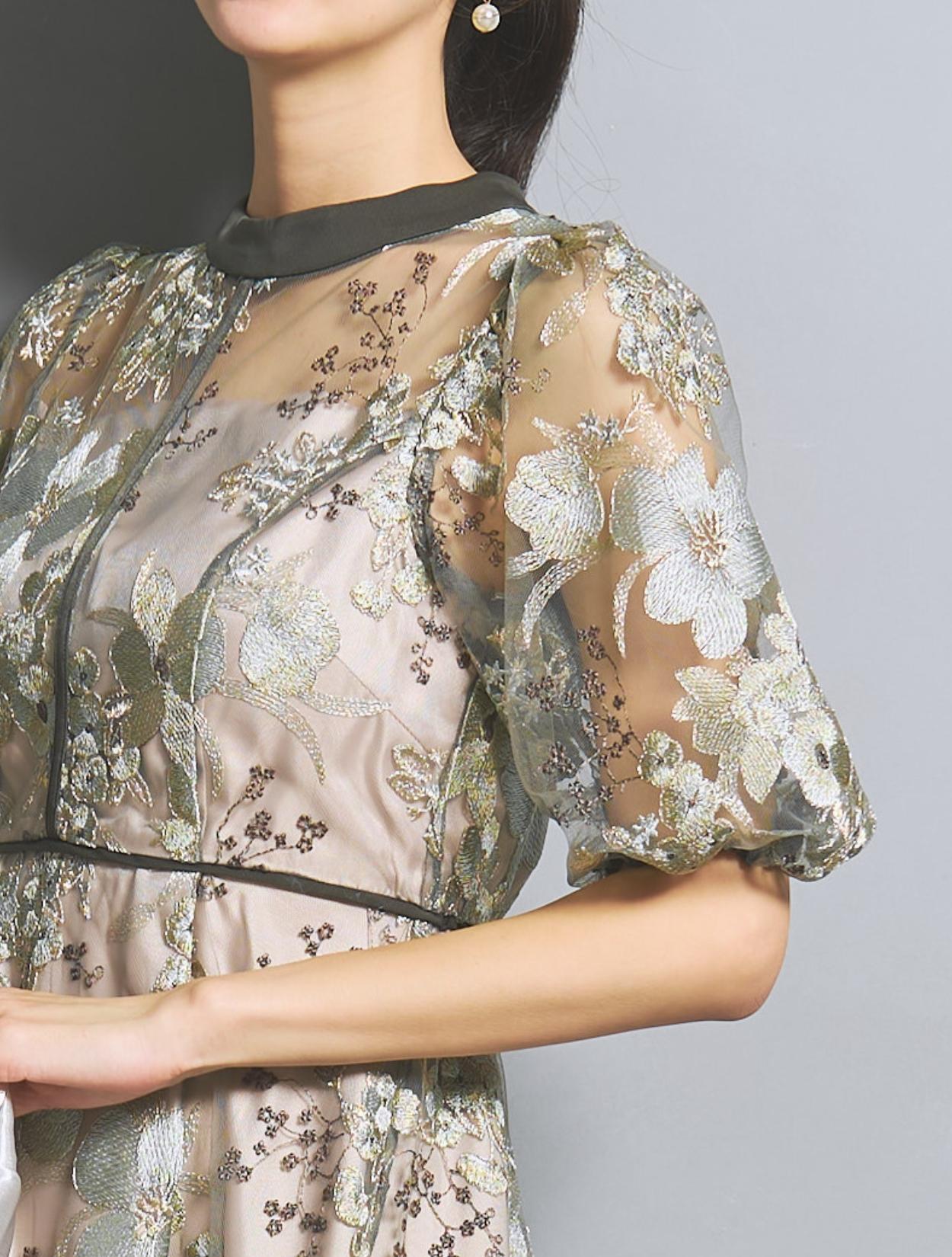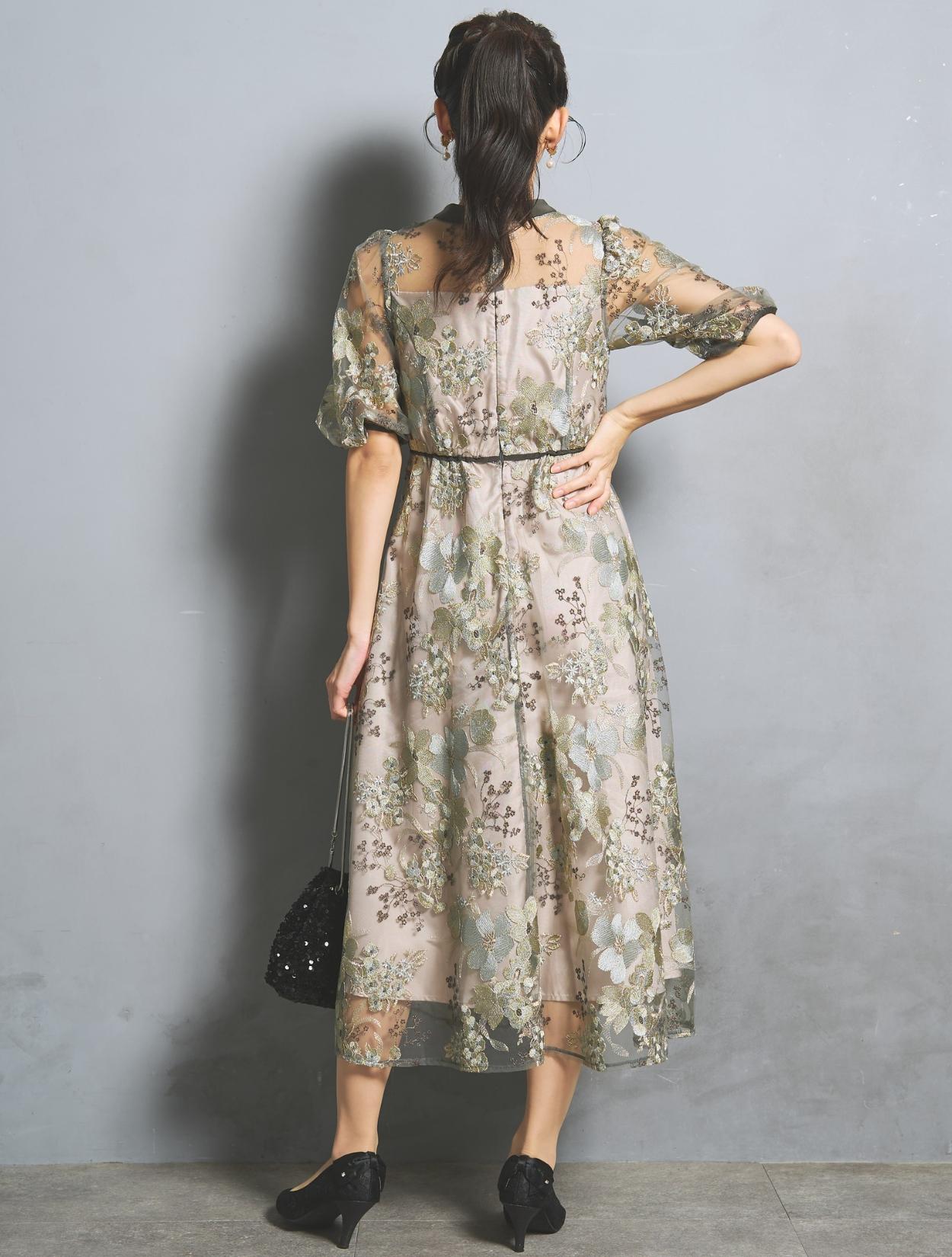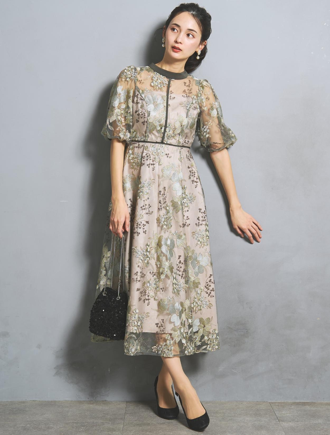フラワー刺繍レースが華やかなオケージョンドレス。程よい大きさのフラワー柄は、上品な存在感もありパーティーシーンにもぴったりです。刺繍糸には光沢もあり、高級感があるのもポイント。着丈が長過ぎないミニマルなシルエットで、低身長さんにもおすすめのドレスです。