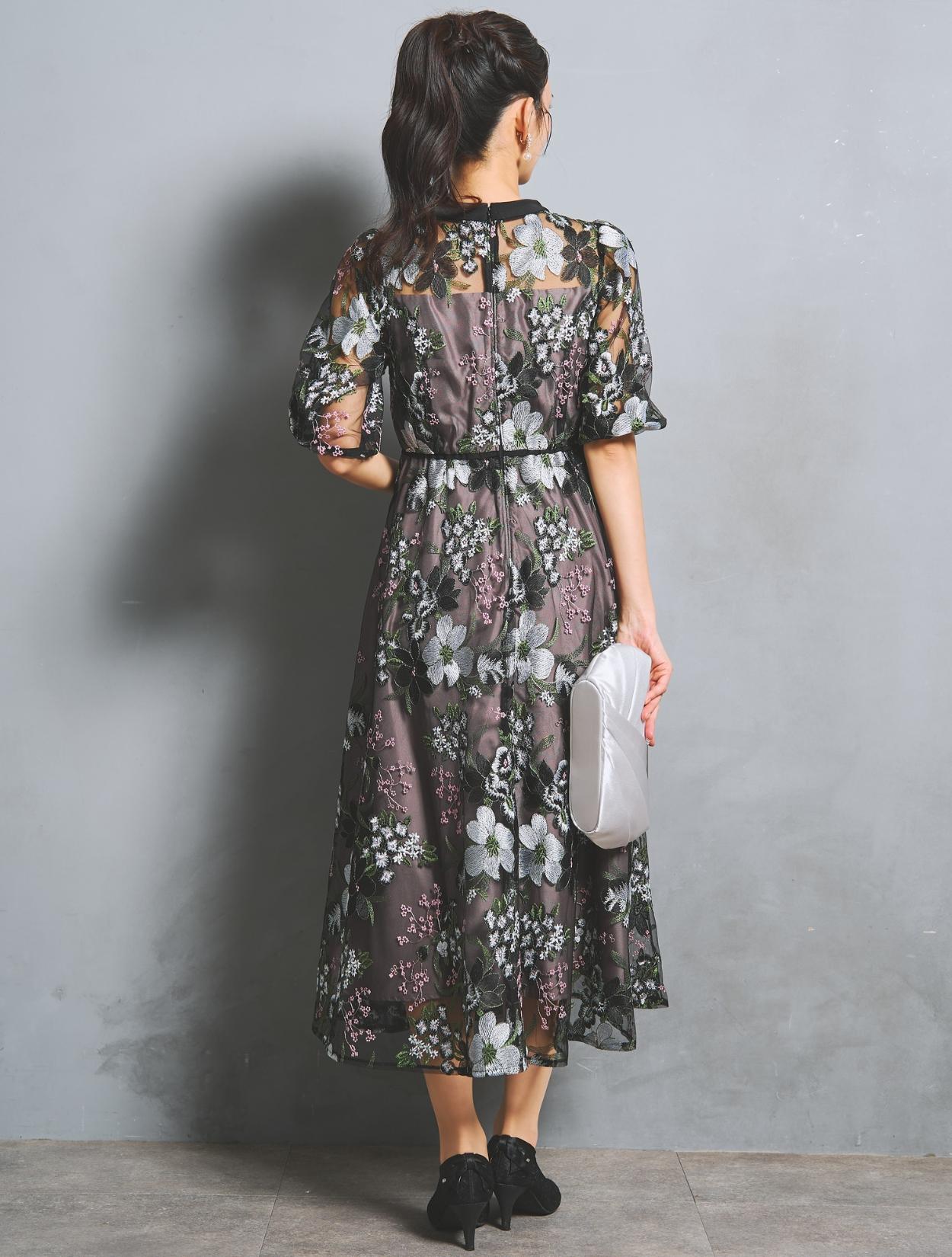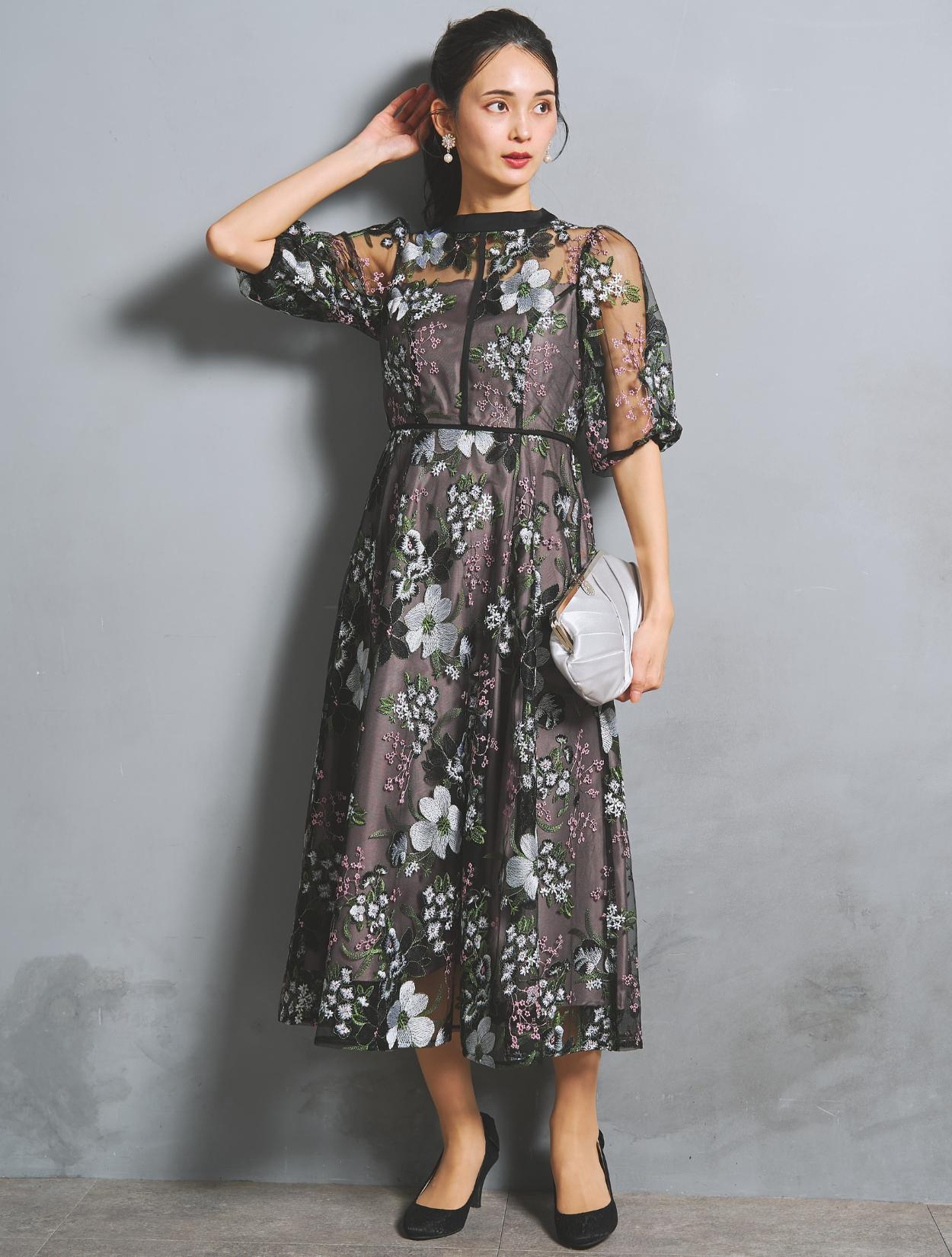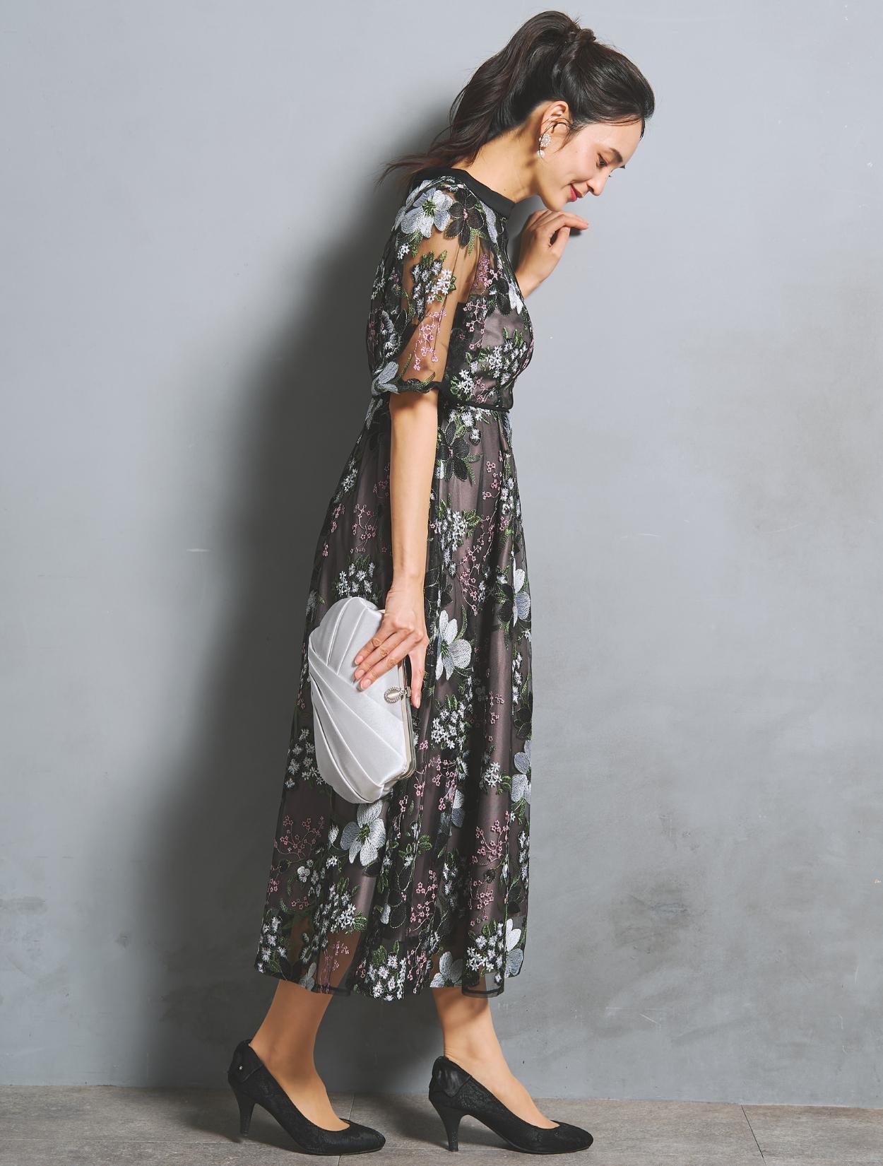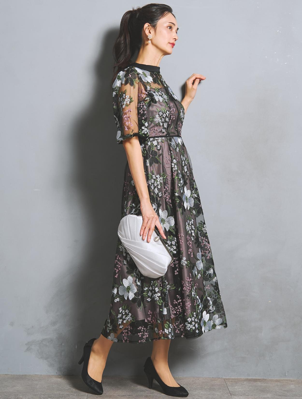 フラワー刺繍レースが華やかなオケージョンドレス。程よい大きさのフラワー柄は、上品な存在感もありパーティーシーンにもぴったりです。刺繍糸には光沢もあり、高級感があるのもポイント。着丈が長過ぎないミニマルなシルエットで、低身長さんにもおすすめのドレスです。