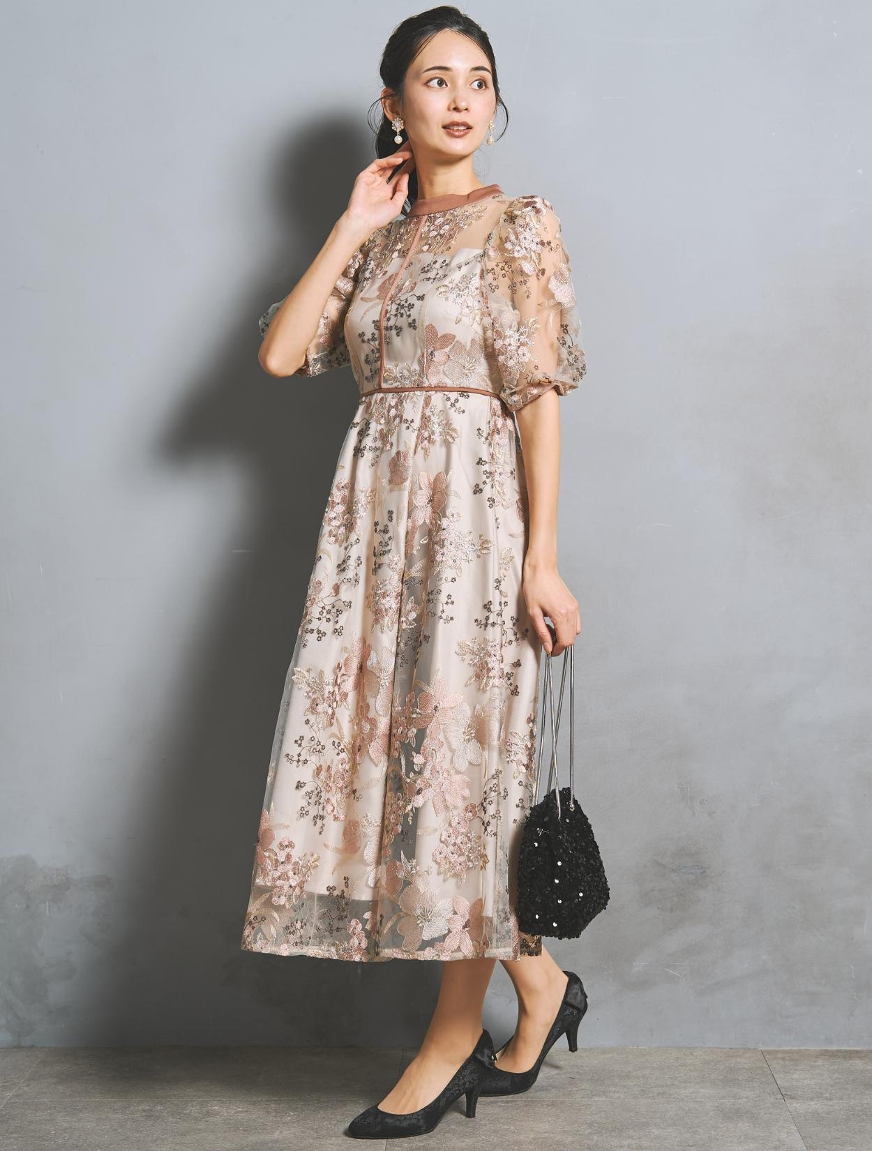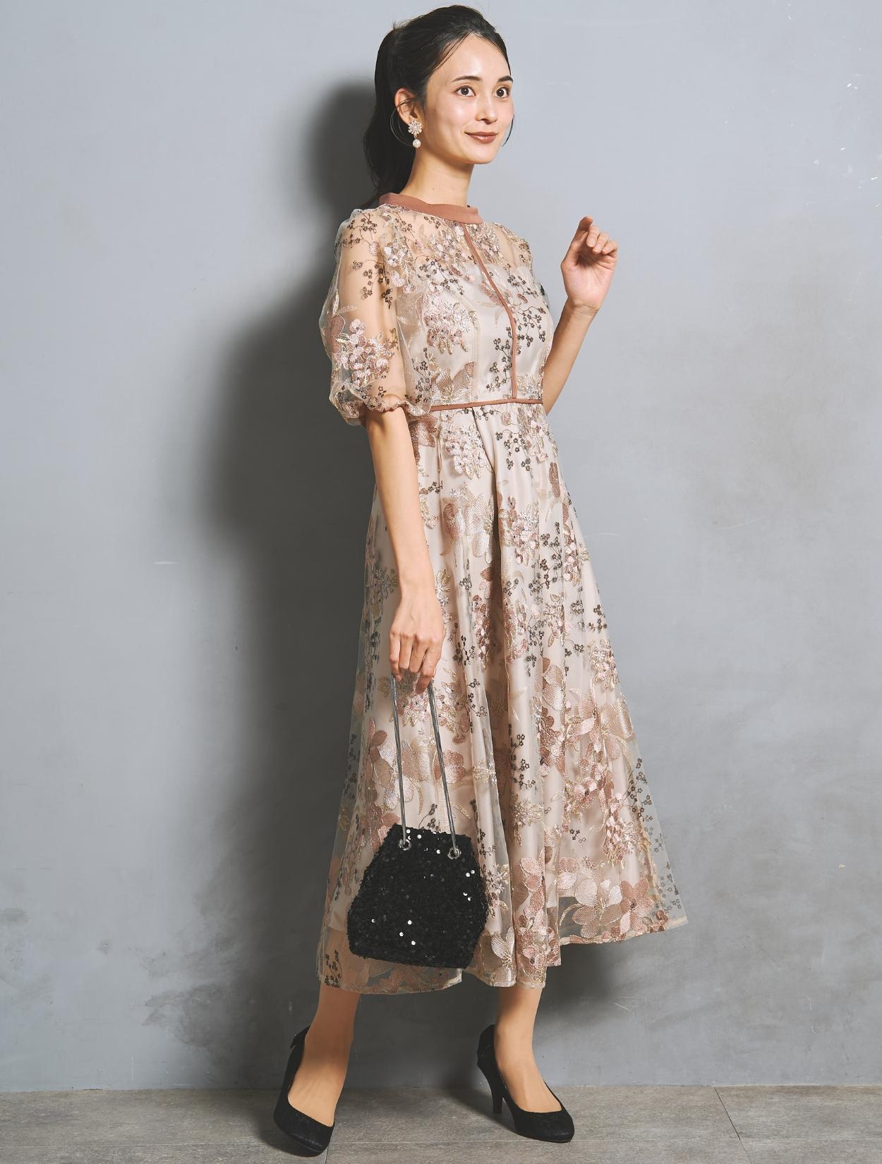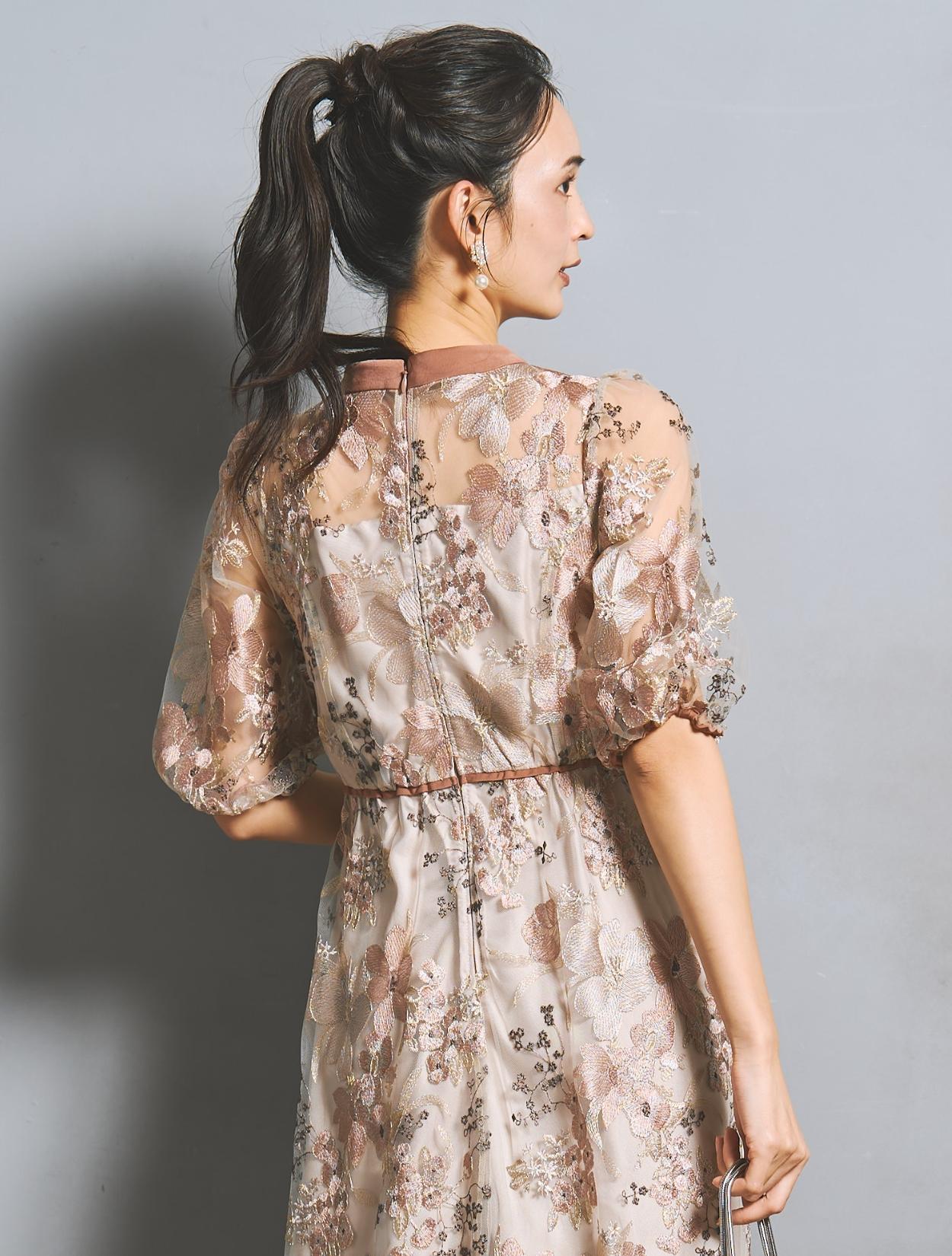 フラワー刺繍レースが華やかなオケージョンドレス。程よい大きさのフラワー柄は、上品な存在感もありパーティーシーンにもぴったりです。刺繍糸には光沢もあり、高級感があるのもポイント。着丈が長過ぎないミニマルなシルエットで、低身長さんにもおすすめのドレスです。