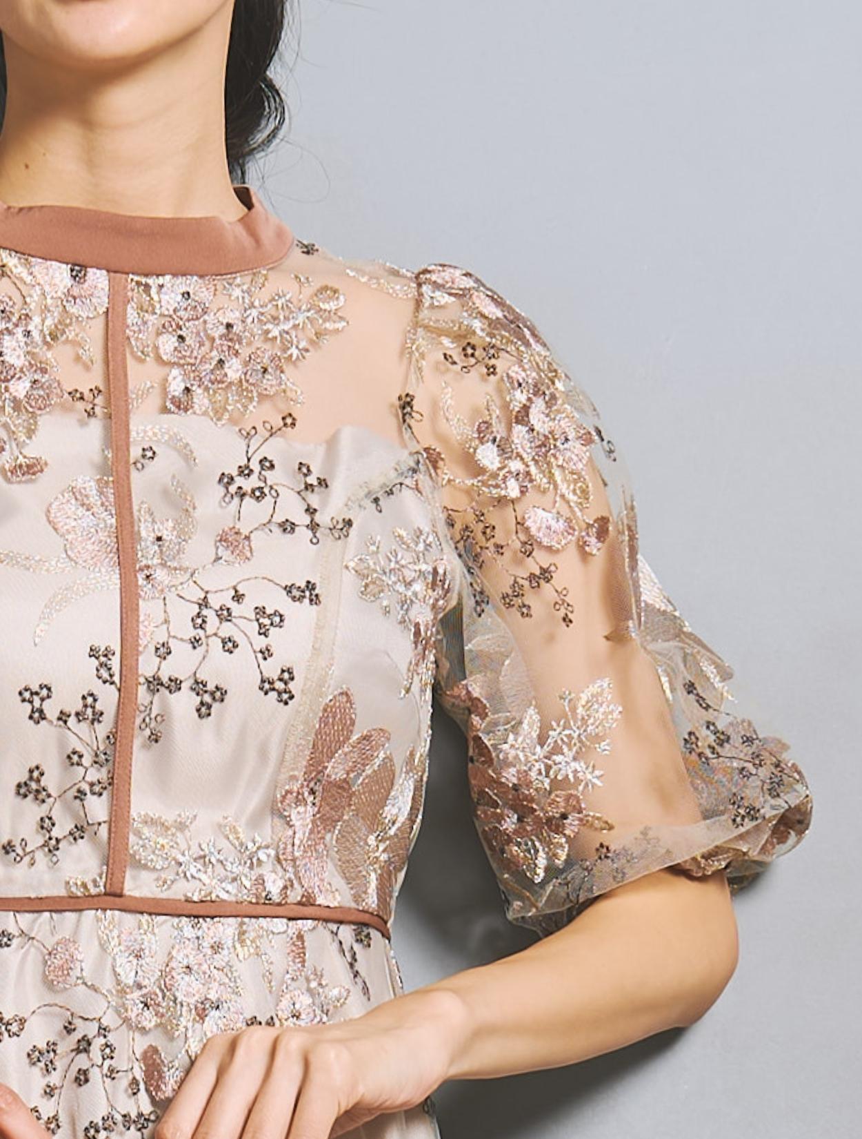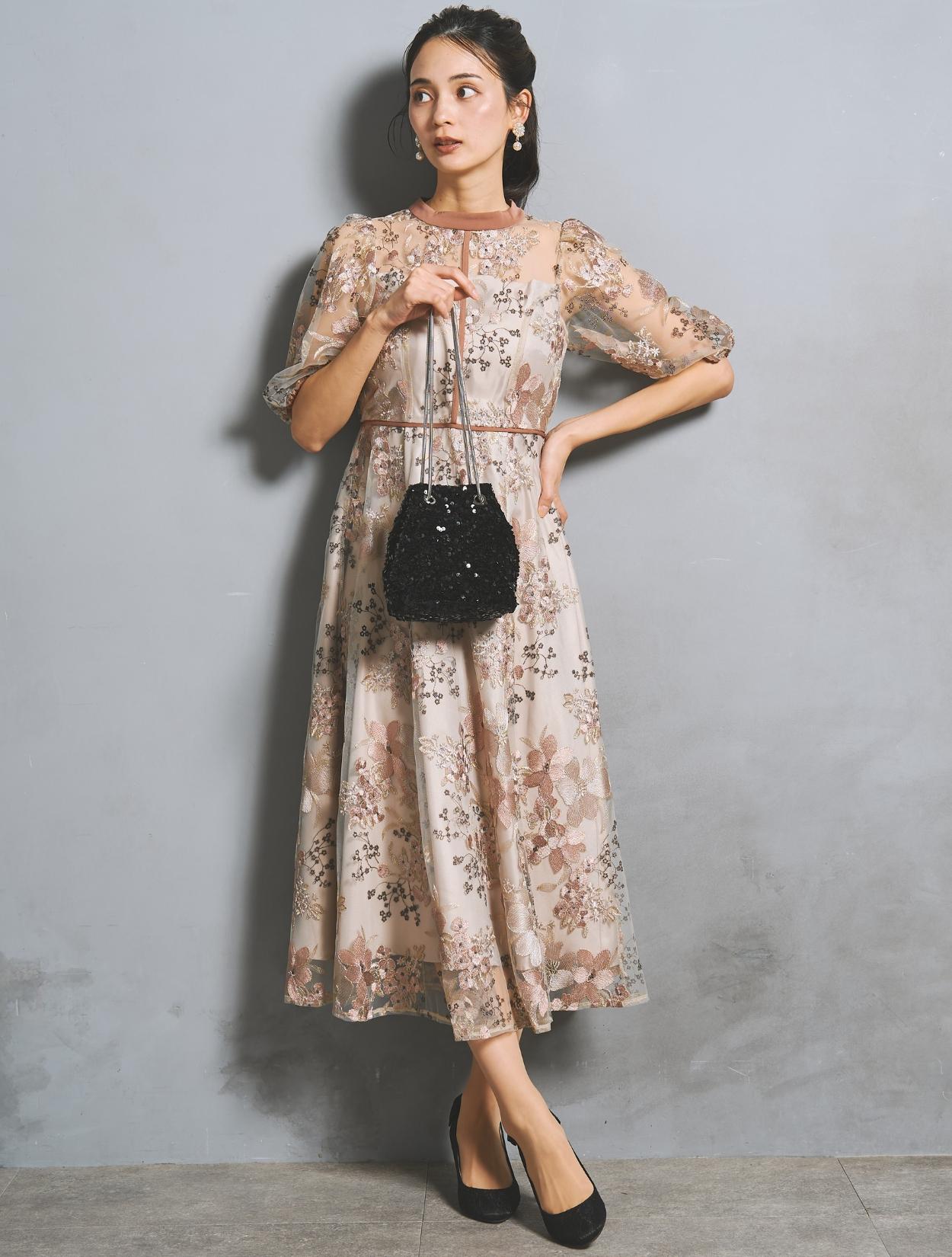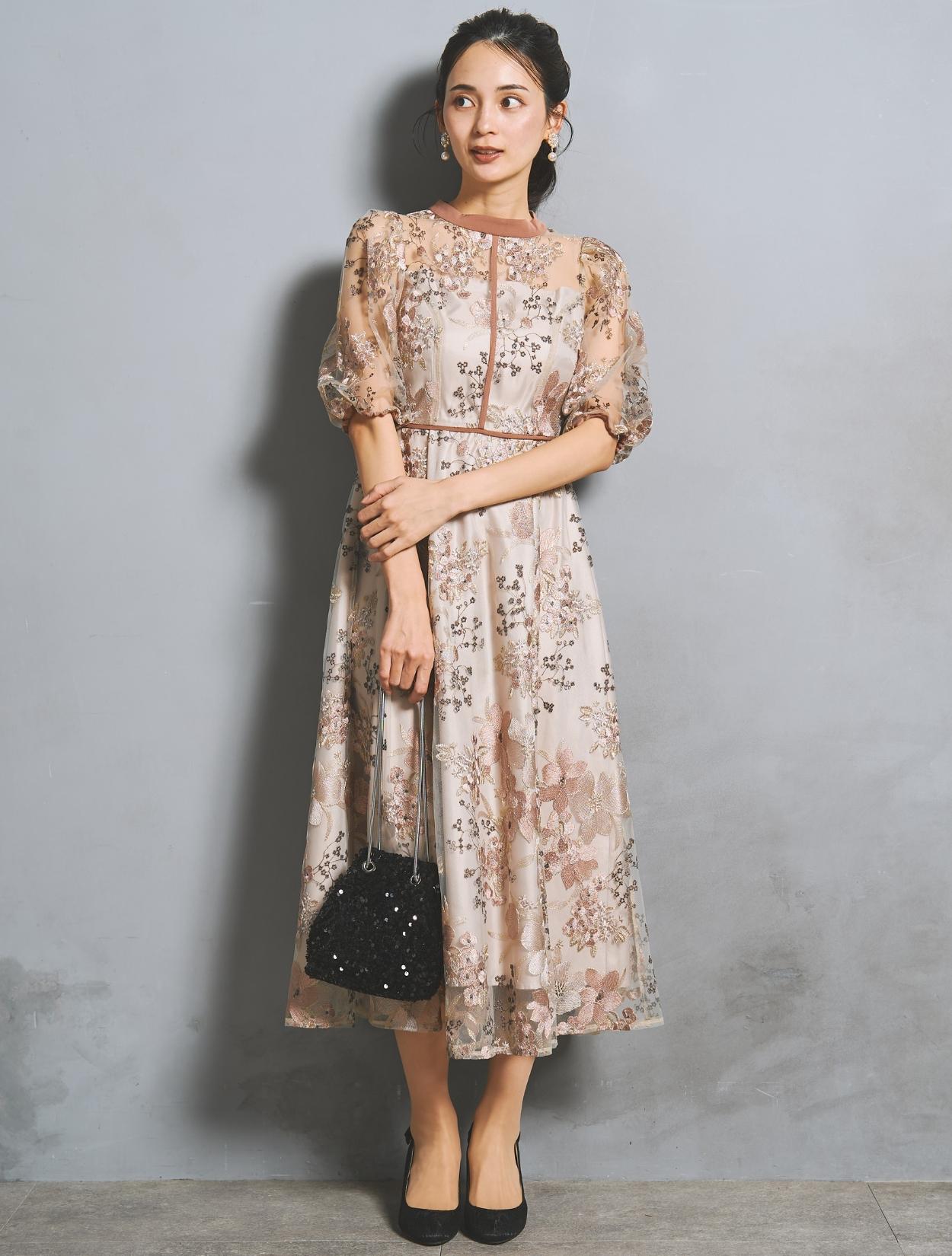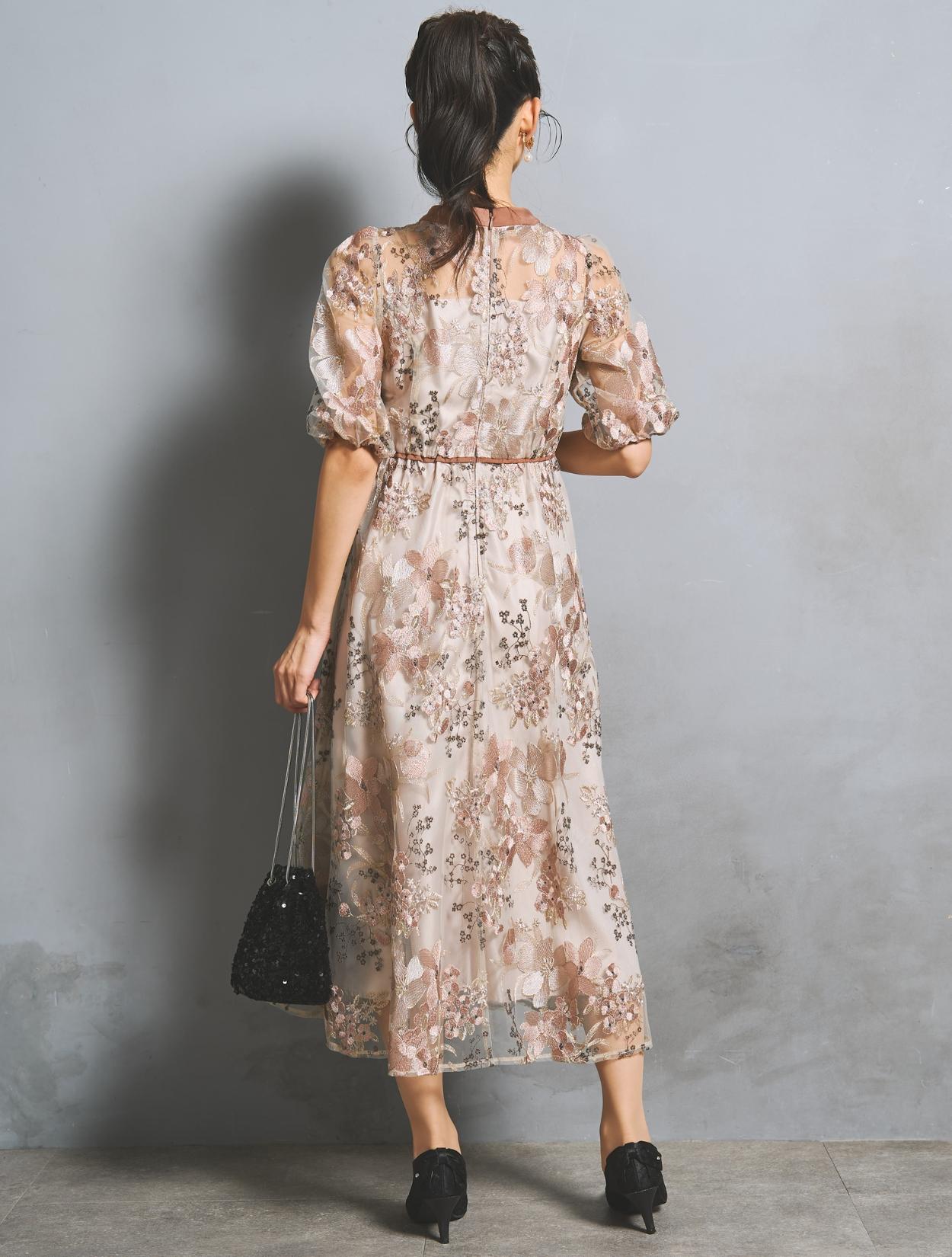 フラワー刺繍レースが華やかなオケージョンドレス。程よい大きさのフラワー柄は、上品な存在感もありパーティーシーンにもぴったりです。刺繍糸には光沢もあり、高級感があるのもポイント。着丈が長過ぎないミニマルなシルエットで、低身長さんにもおすすめのドレスです。