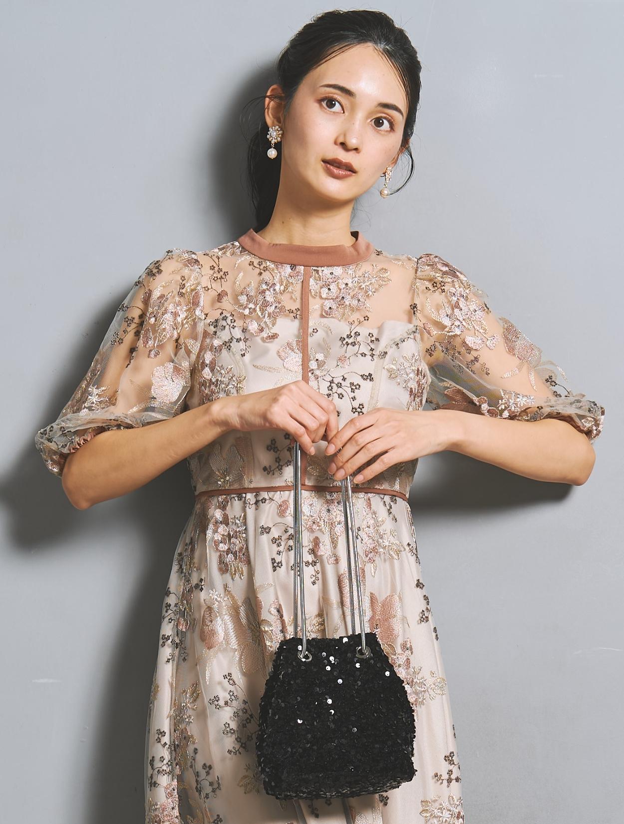 人気のスパンコールバッグを合わせて、フェミニンなピンクドレスにあえて辛さをプラスしたコーディネート。今っぽい雰囲気もありメリハリが出ます。お顔周りを華やかに見せてくれるフラワーモチーフのイヤリングは、フラワー刺繍にもリンクして全体の雰囲気も格上げしてくれます。