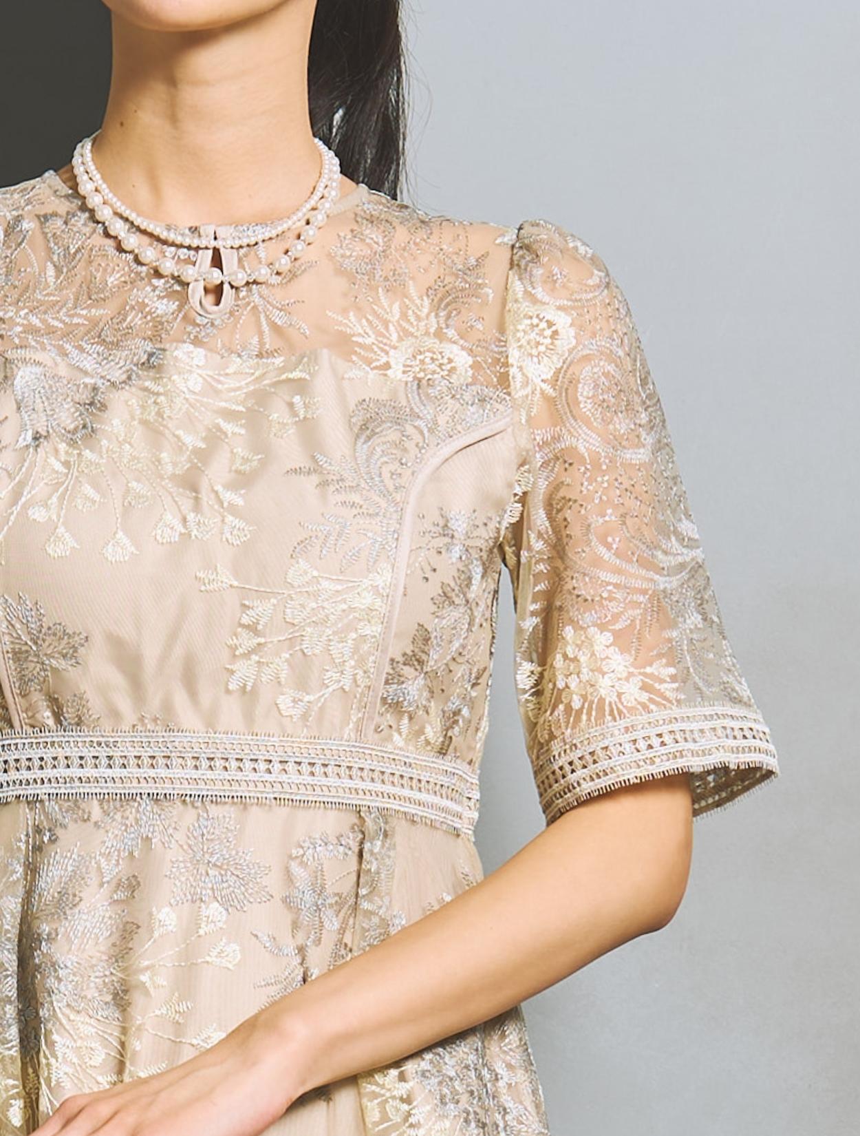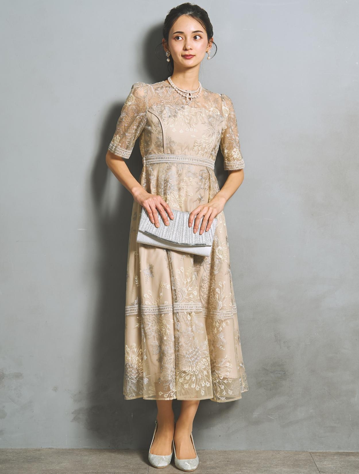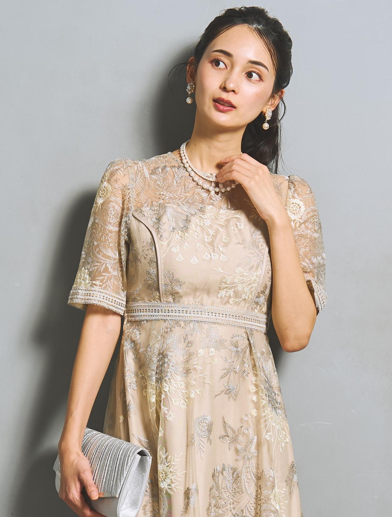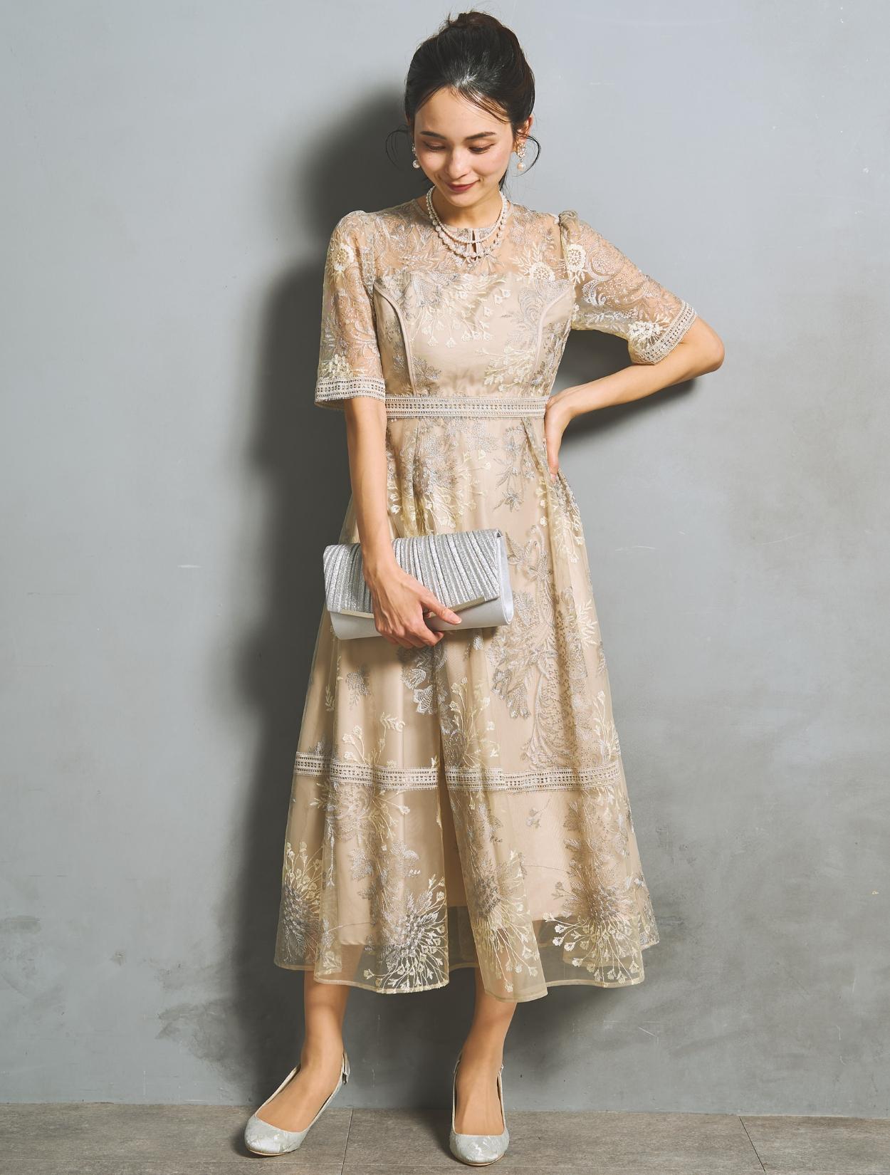 様々なフラワー柄の刺繍は、多色使いで華やかな雰囲気。単調にならない刺繍柄は立体感があり、パッと目を惹く褒められドレスです。総刺繍レースの生地をしっかり使用したスカートは、ふんわりフレアライン。軽やかなエアリー感もアップ。スカート裾には透け感があり、足元も重たく見えません。