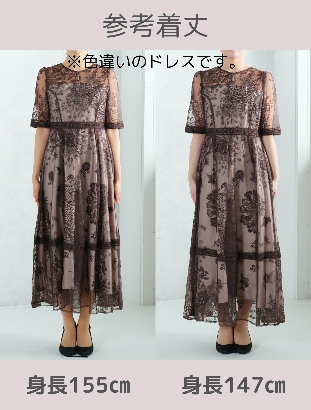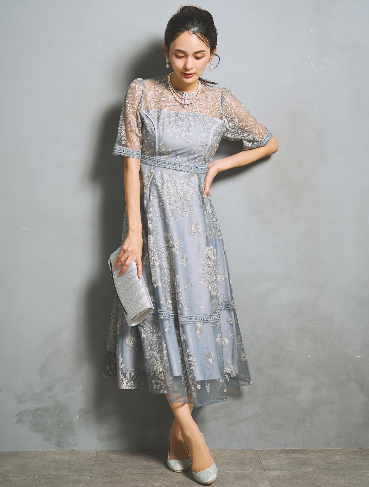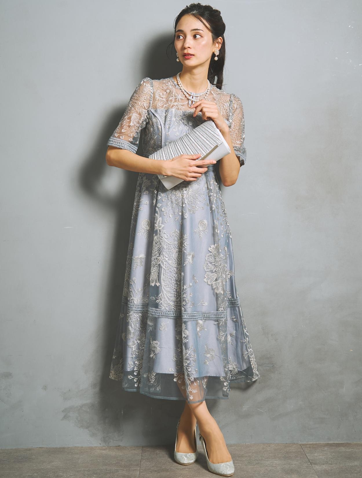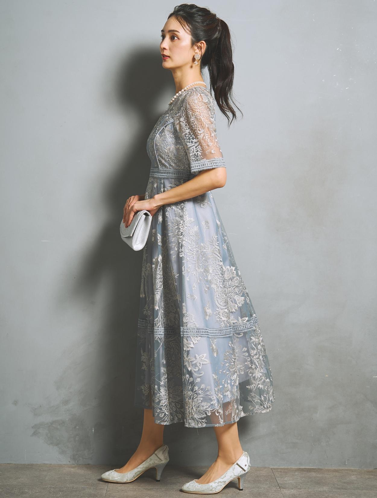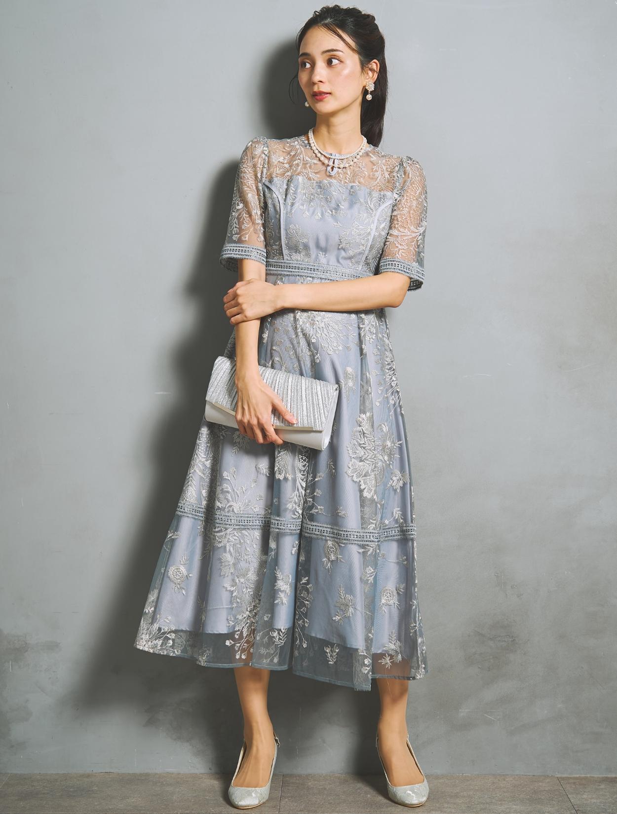 様々なフラワー柄の刺繍は、多色使いで華やかな雰囲気。単調にならない刺繍柄は立体感があり、パッと目を惹く褒められドレスです。総刺繍レースの生地をしっかり使用したスカートは、ふんわりフレアライン。軽やかなエアリー感もアップ。スカート裾には透け感があり、足元も重たく見えません。