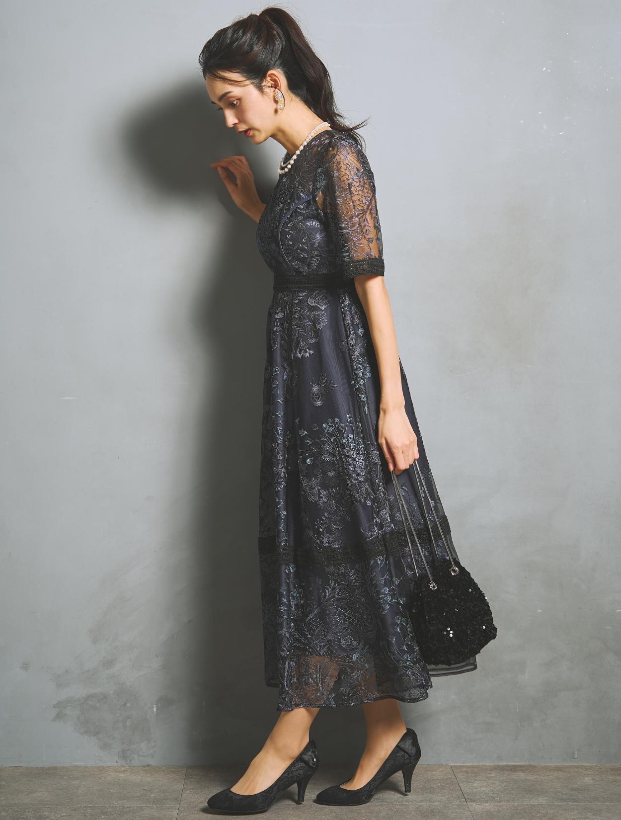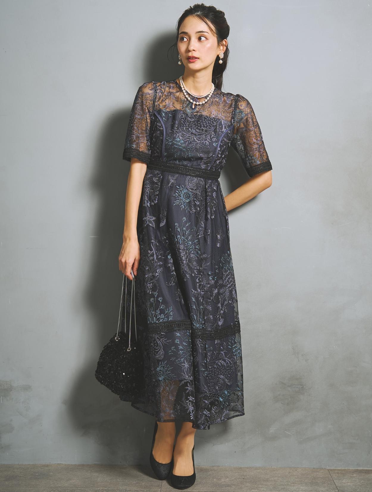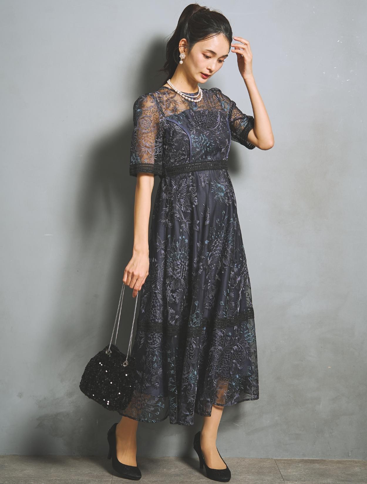 パープルやブルーなど青味系の刺繍レースが、ネイビードレスを華やかにアップデート。裏地のネイビーも濃くはっきりした色味で、地味見えしません。ブラックのレースパイピングがアクセントになります。