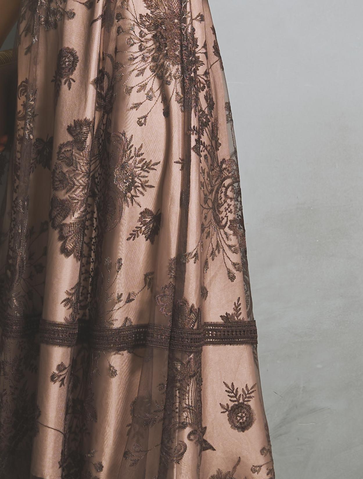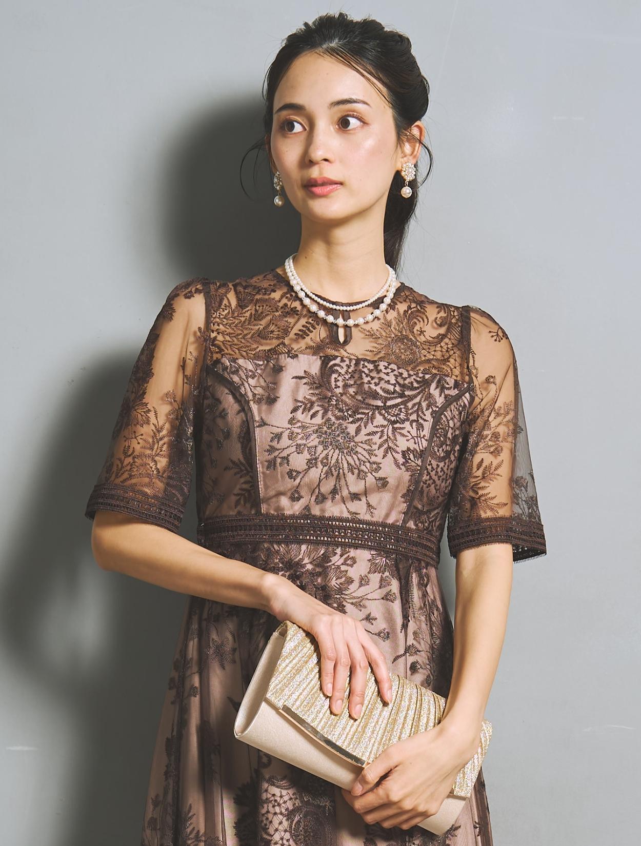 刺繍レースとレースパイピングは同色のブラウンで、落ち着いたフォーマル見えするカラー。裏地は明るいベージュ系のカラーで、レースの柄をしっかり引き立ててくれます。