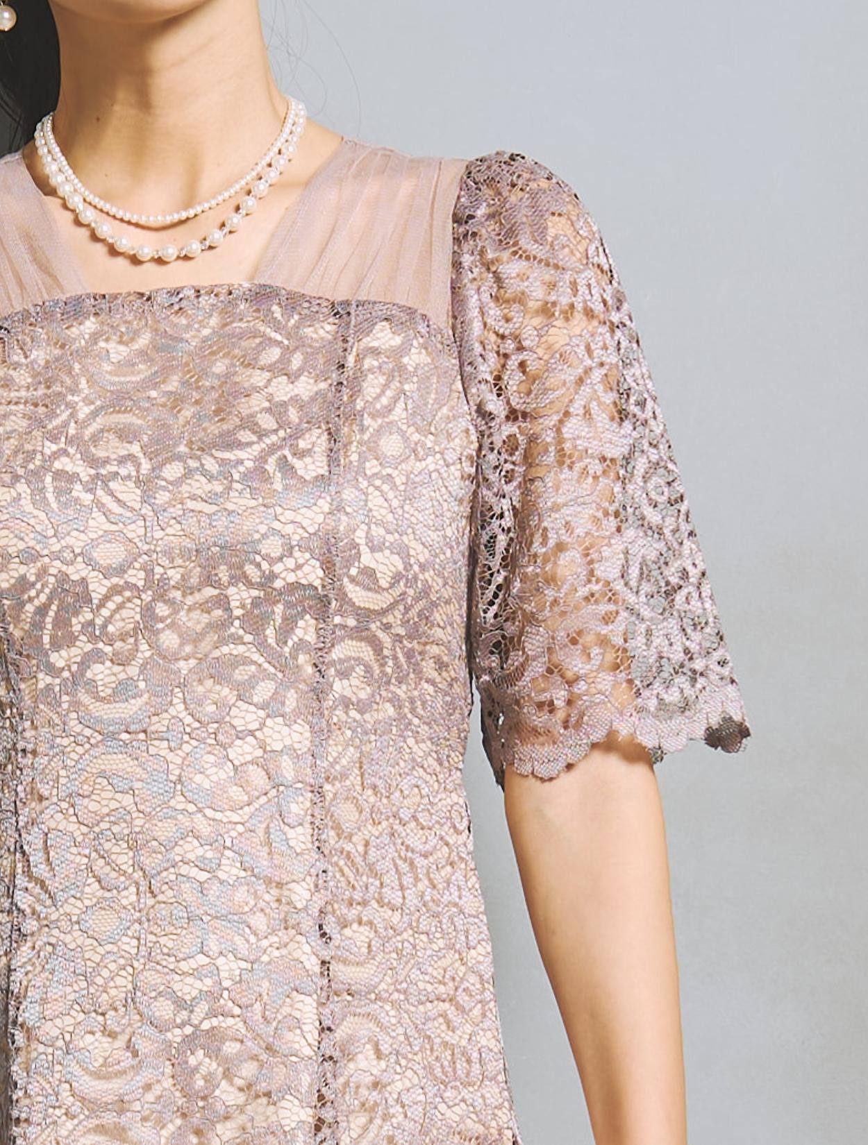 上品に露出を抑えつつも首元をスッキリ見せてくれるスクエアネックのドレス。ネックレスが映えるデザインでもあります。レースと裏地のコントラストで柄が引き立ち、華やかな結婚式やパーティーシーンにぴったりです。