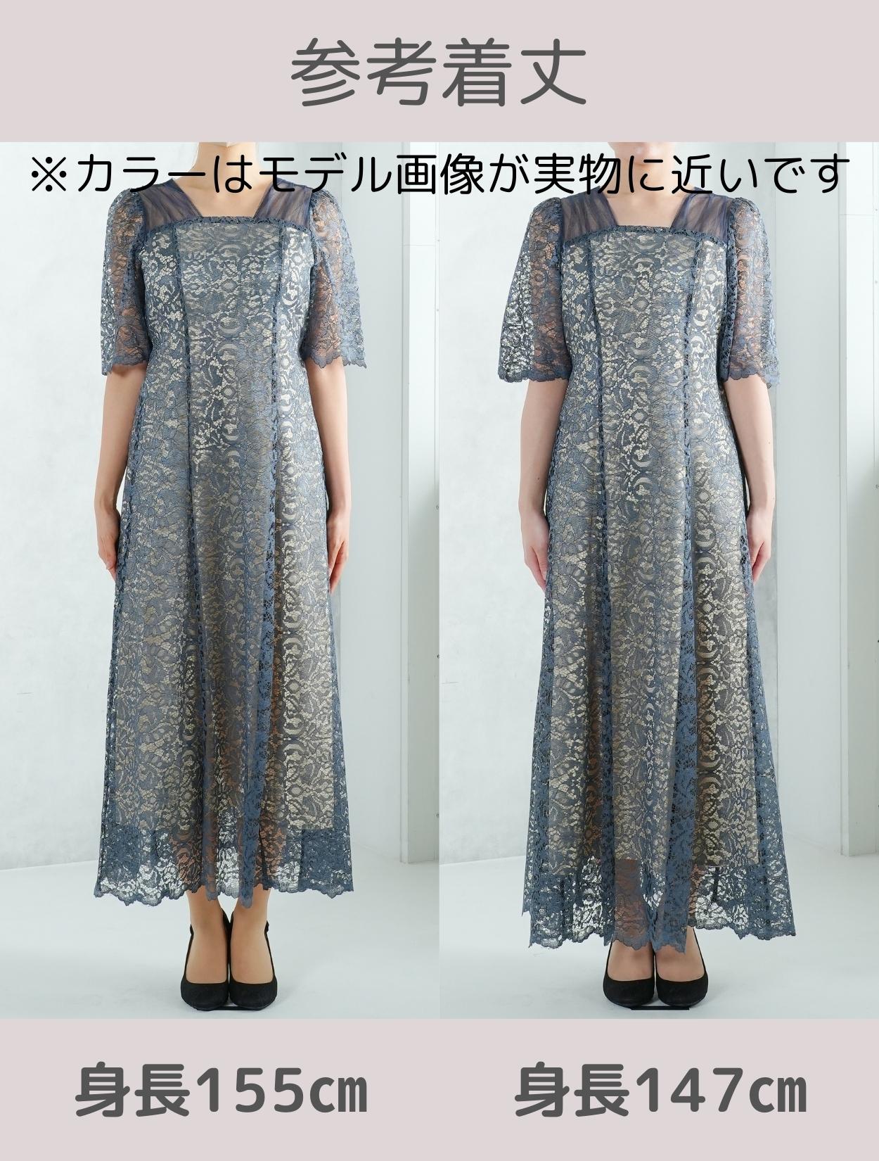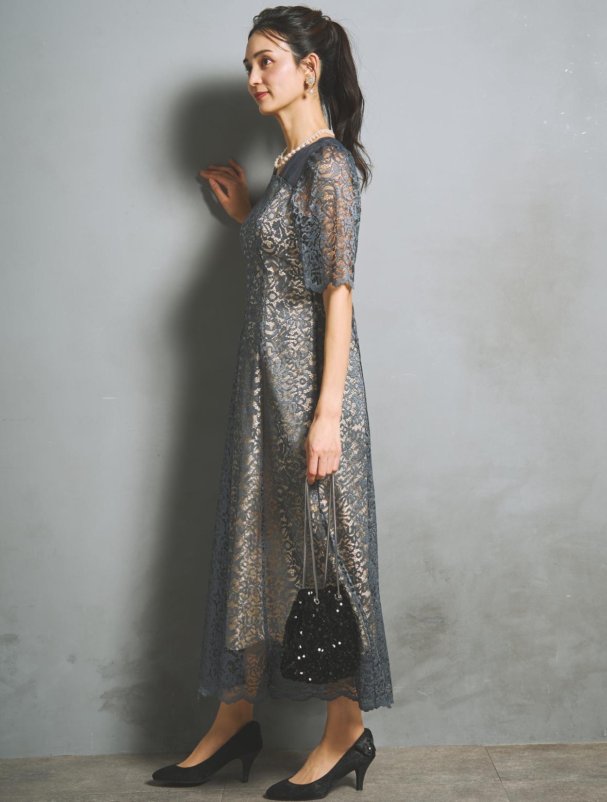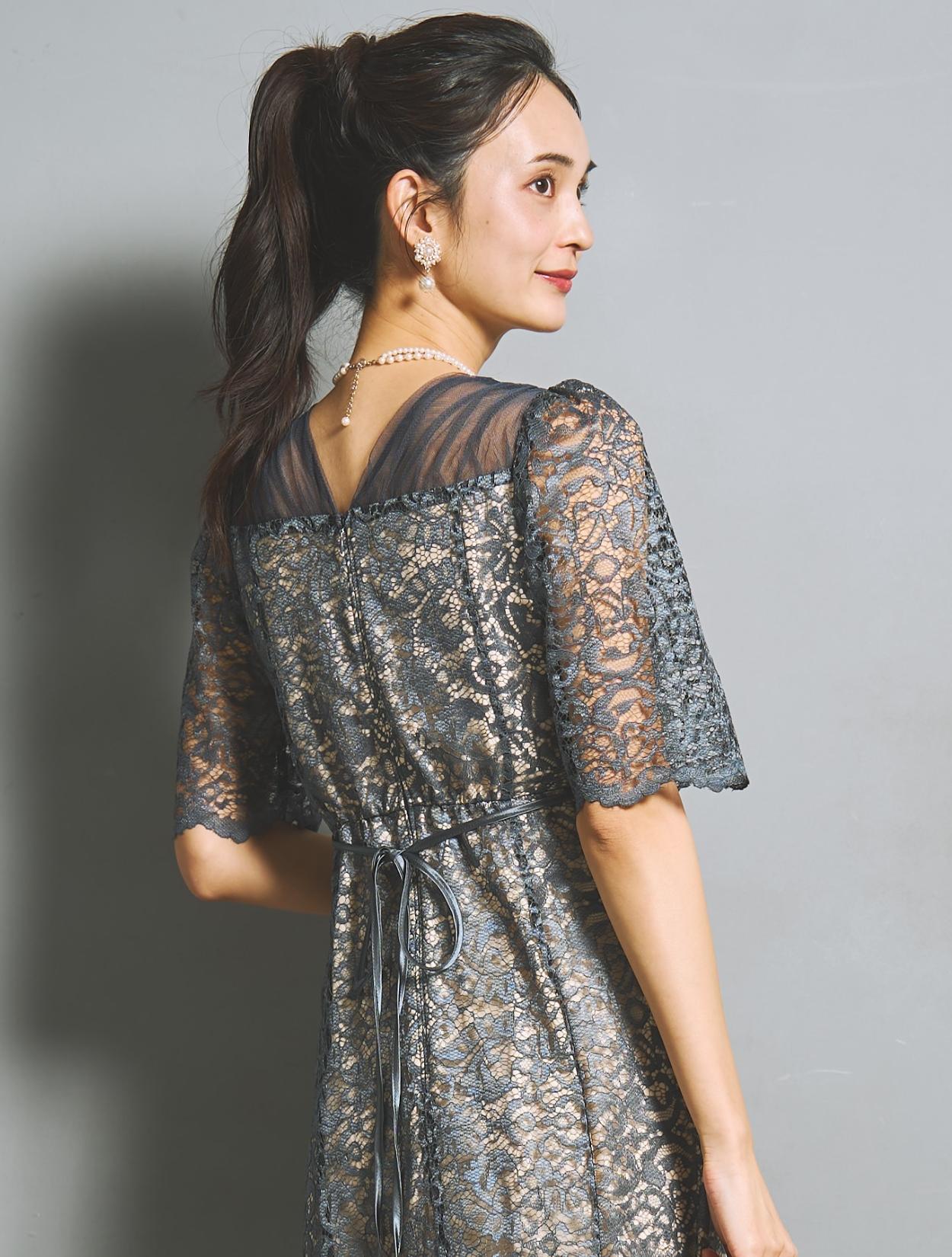 レースのネイビーは、青味を抑えたグレーを混ぜた様なくすみネイビー。濃い印象のネイビーですが、優しく柔らかい雰囲気で着こなせる色合いです。デコルテのチュールは、はっきりとしたネイビーで、お顔映りにメリハリを出してくれます。