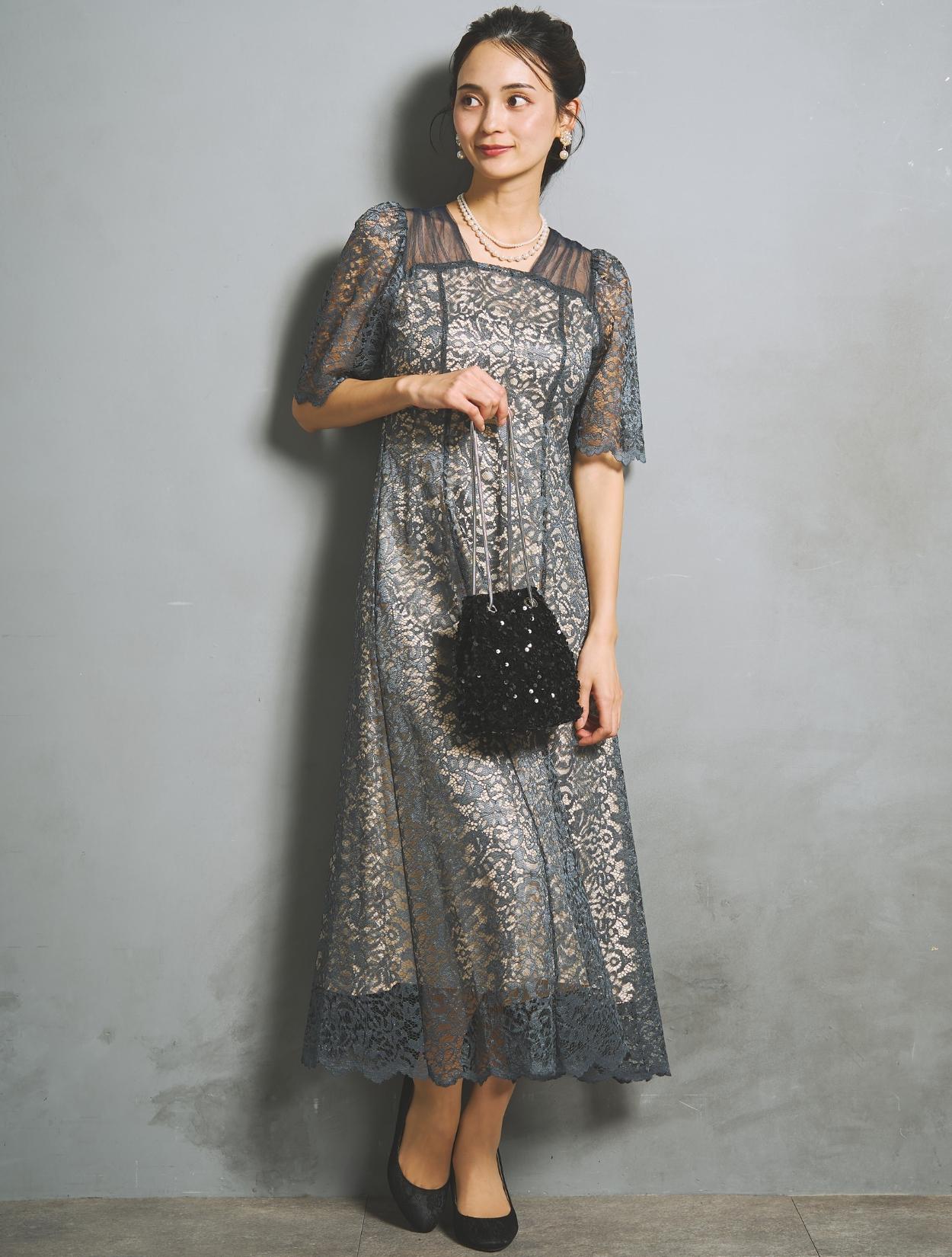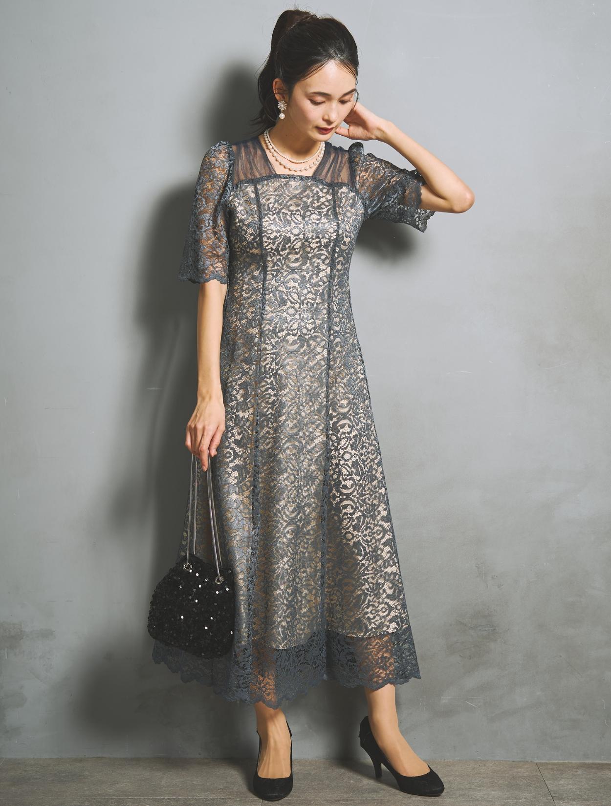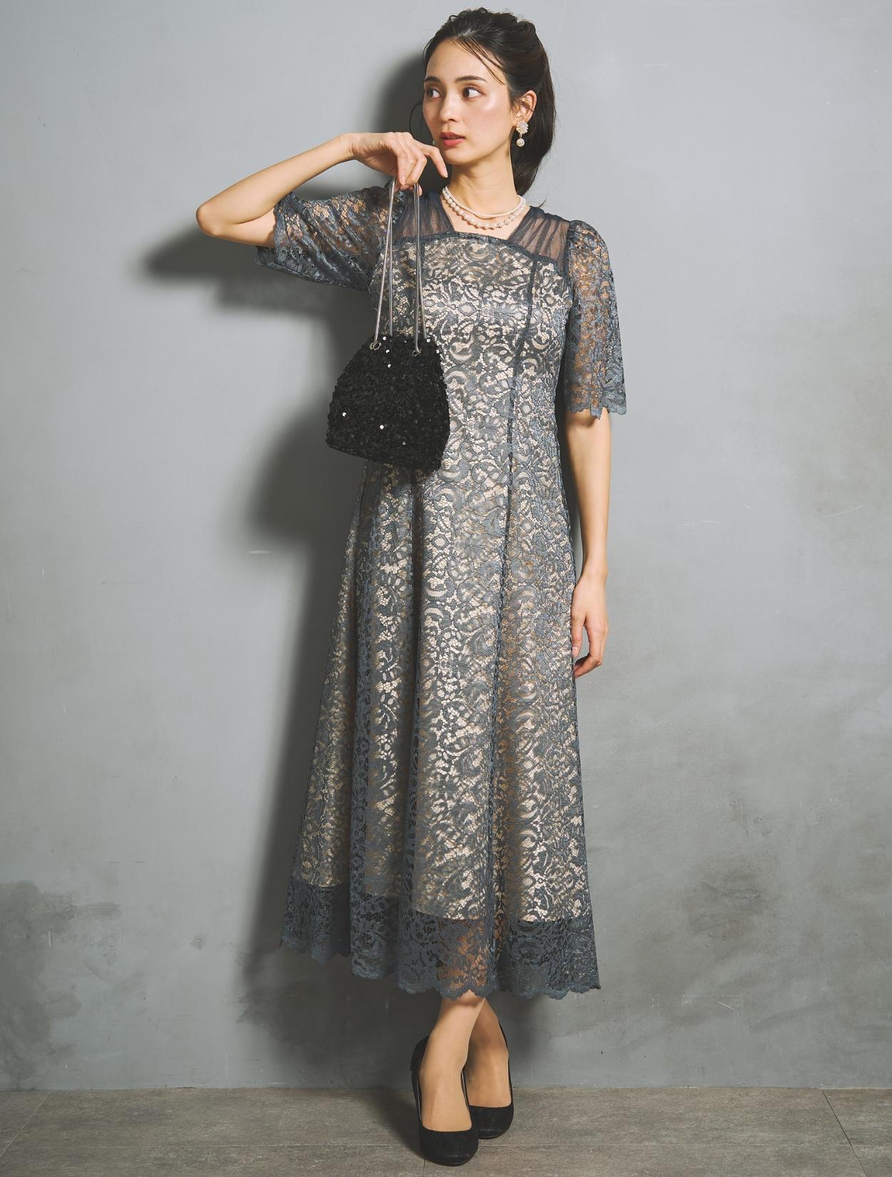 上品に露出を抑えつつも首元をスッキリ見せてくれるスクエアネックのドレス。ネックレスが映えるデザインでもあります。レースと裏地のコントラストで柄が引き立ち、華やかな結婚式やパーティーシーンにぴったりです。