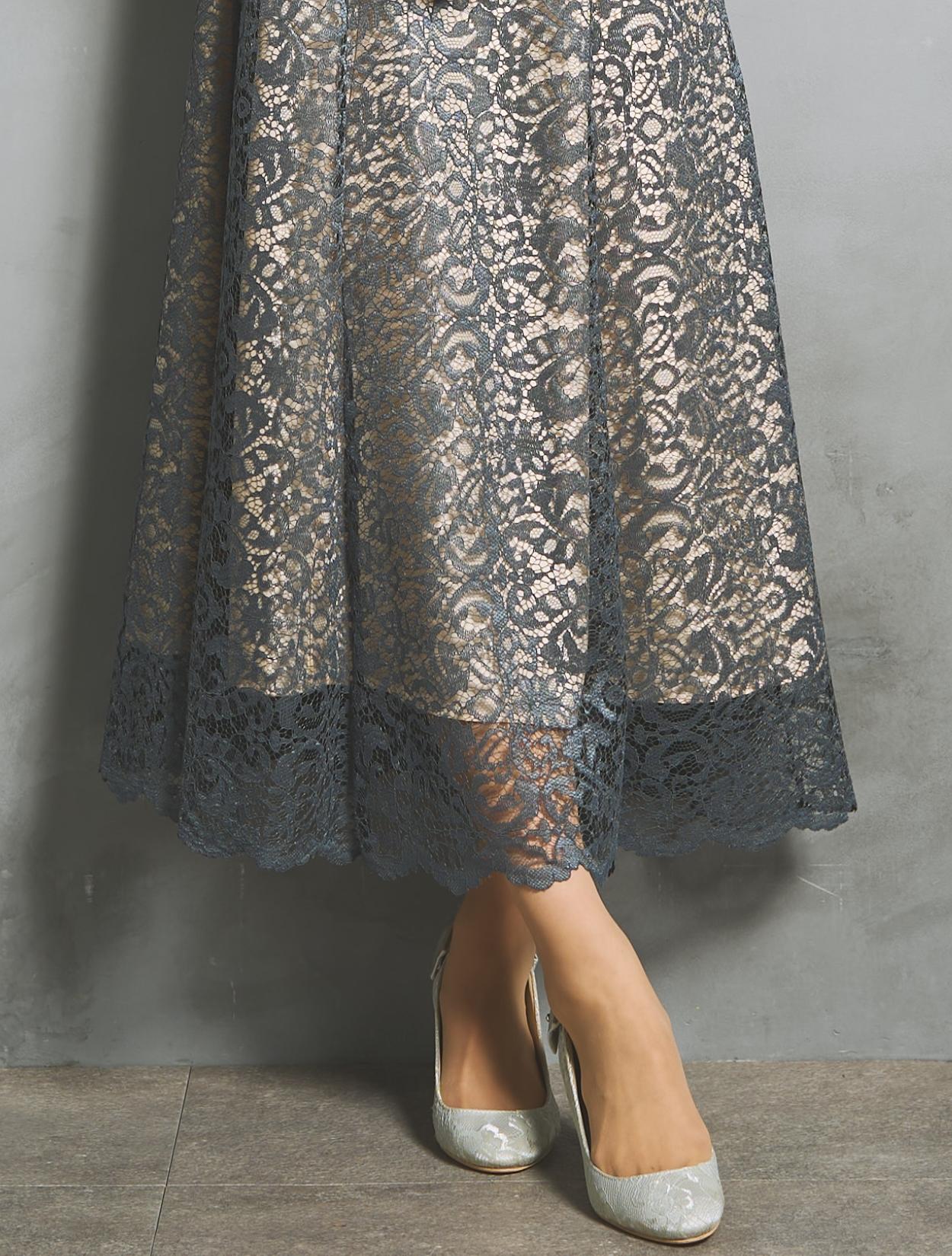 袖とスカート裾のレースはスカラップ調にカットされているのもさり気ないポイント。フェミニンで動きのある華やかさをプラスしてくれます。スカートの裾には透け感があり、軽やかな足元を演出。