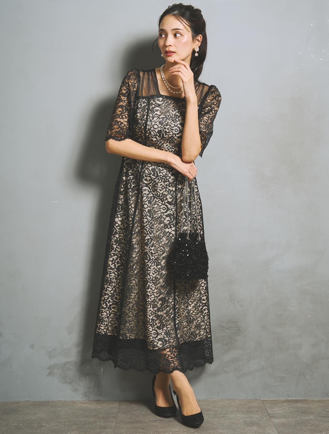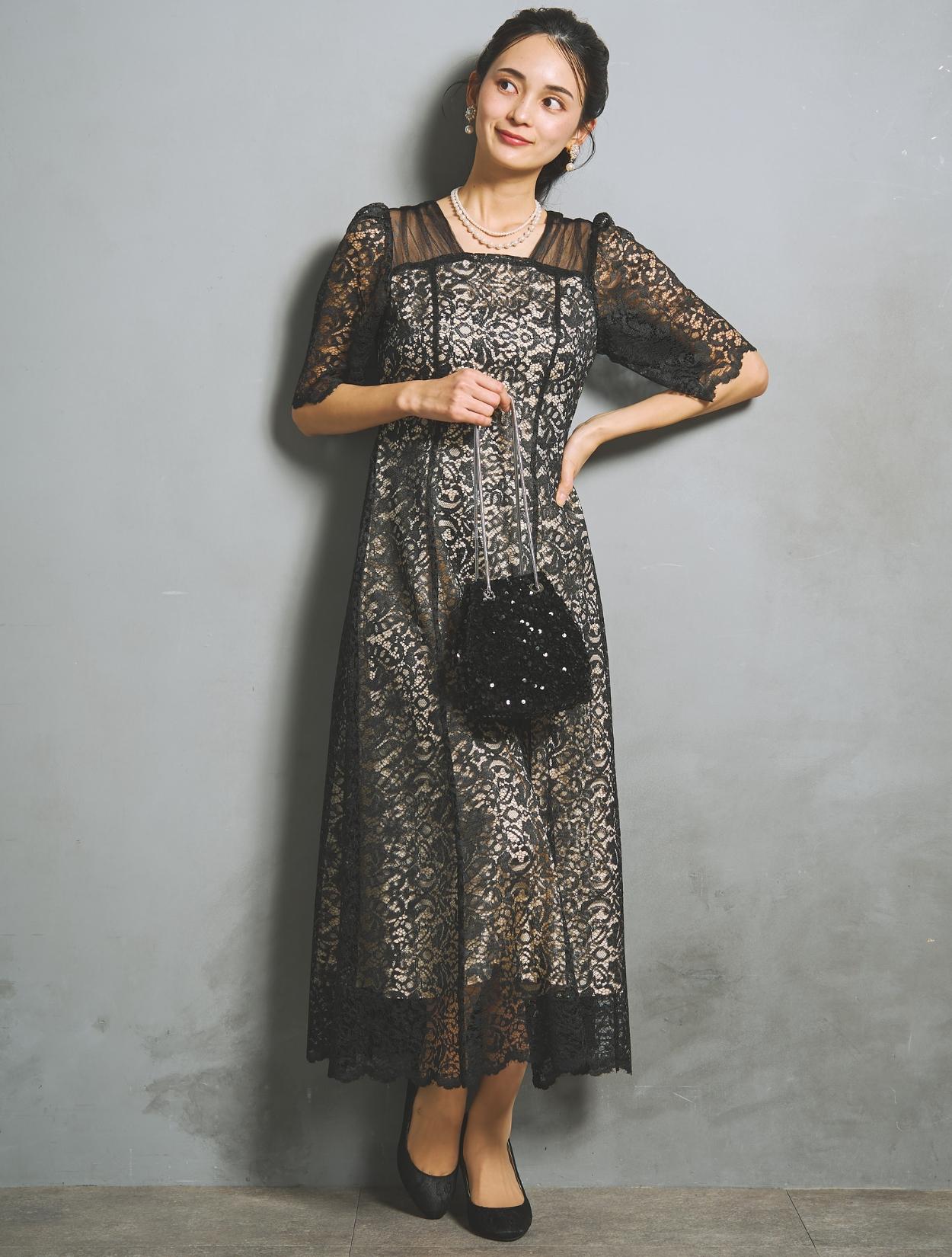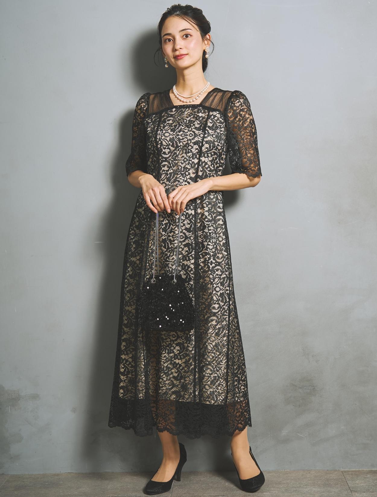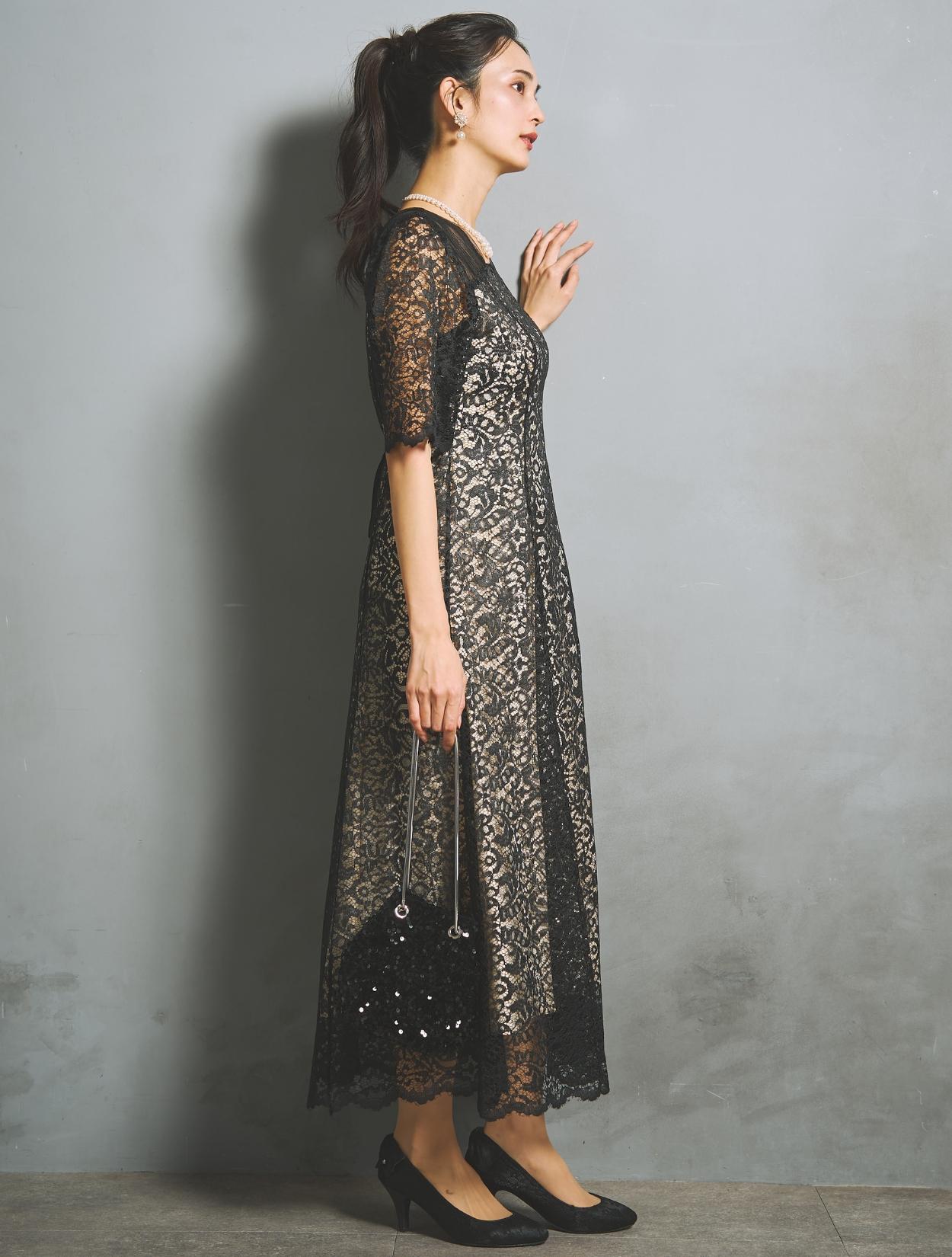 ブラックドレスですが、レースの柄が透けて華やかさがあります。ご親族におすすめのカラーですが、お呼ばれゲストが着てもパーティー感がある着こなしができるブラックドレスです。