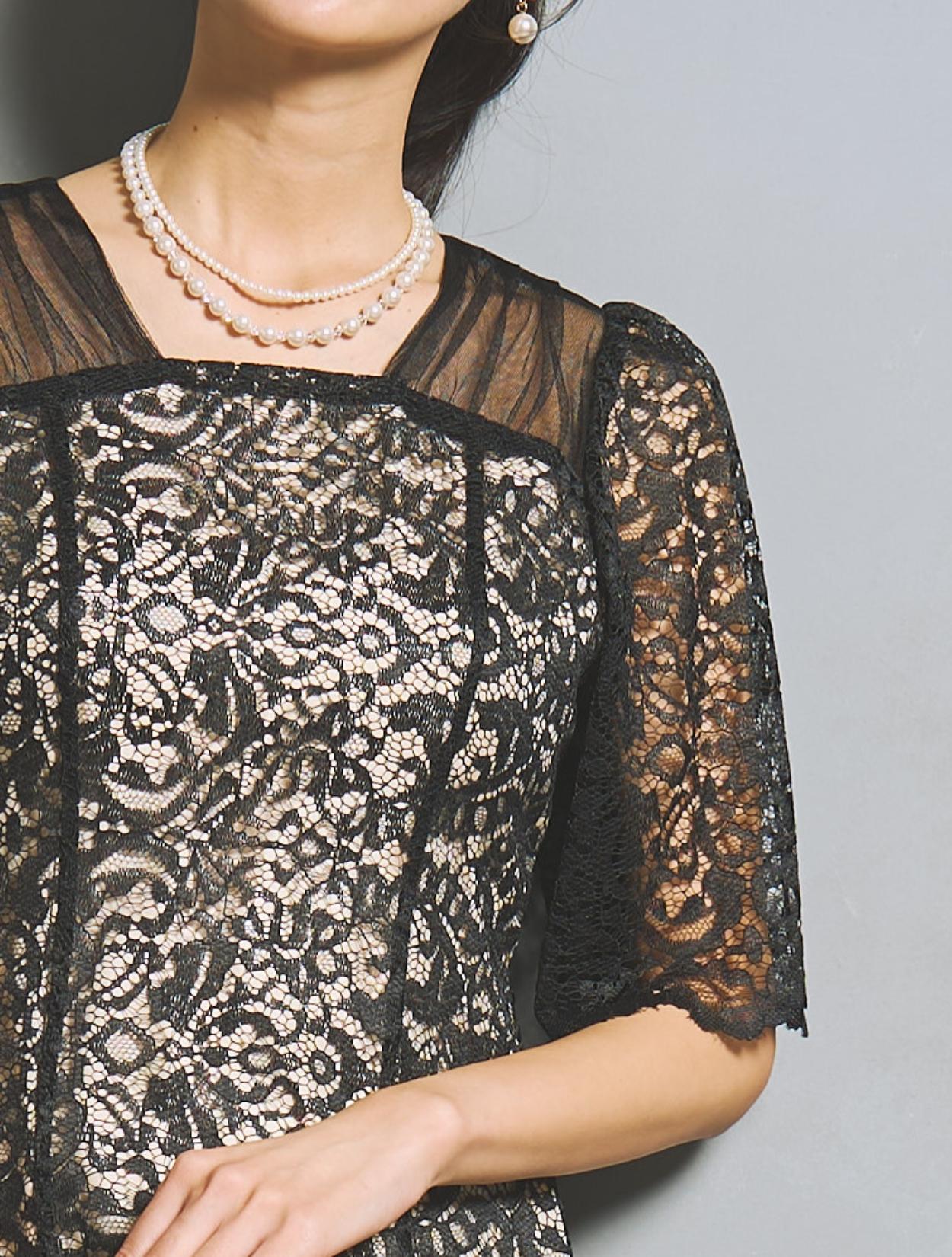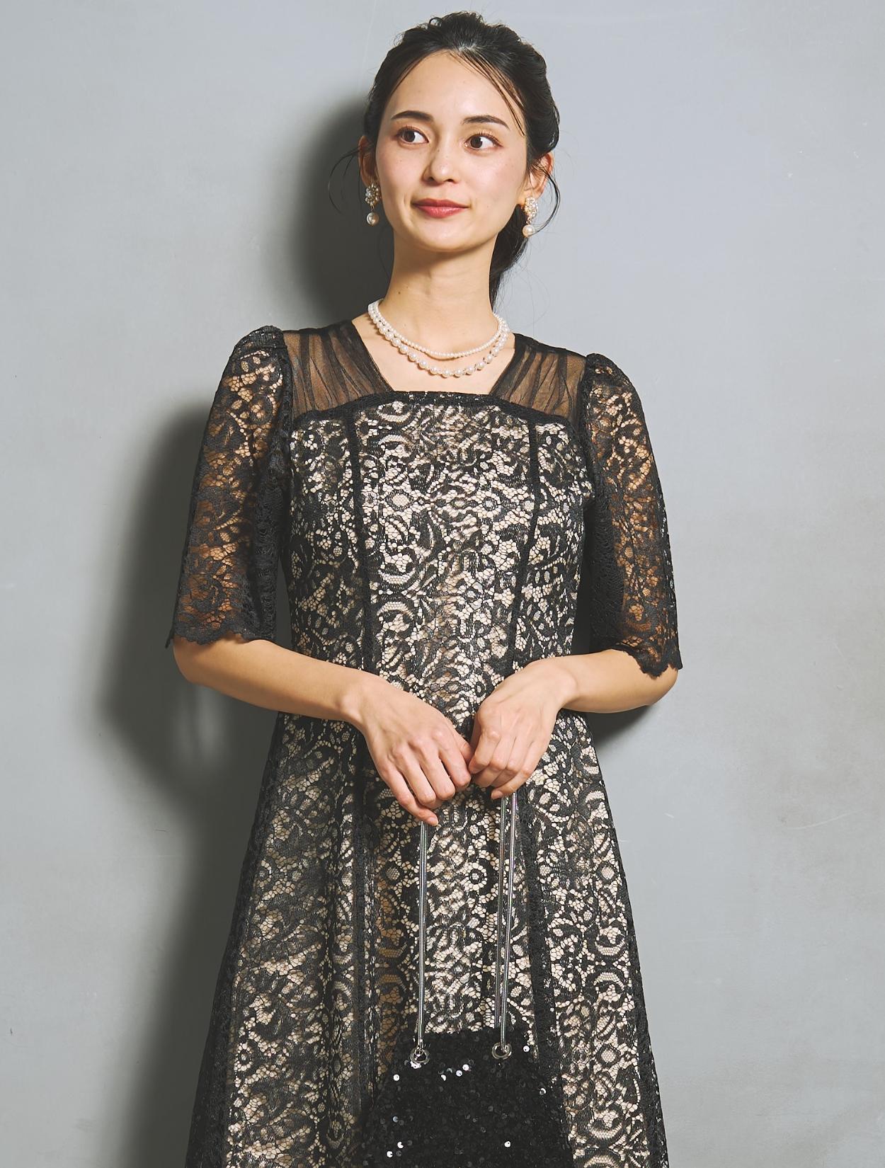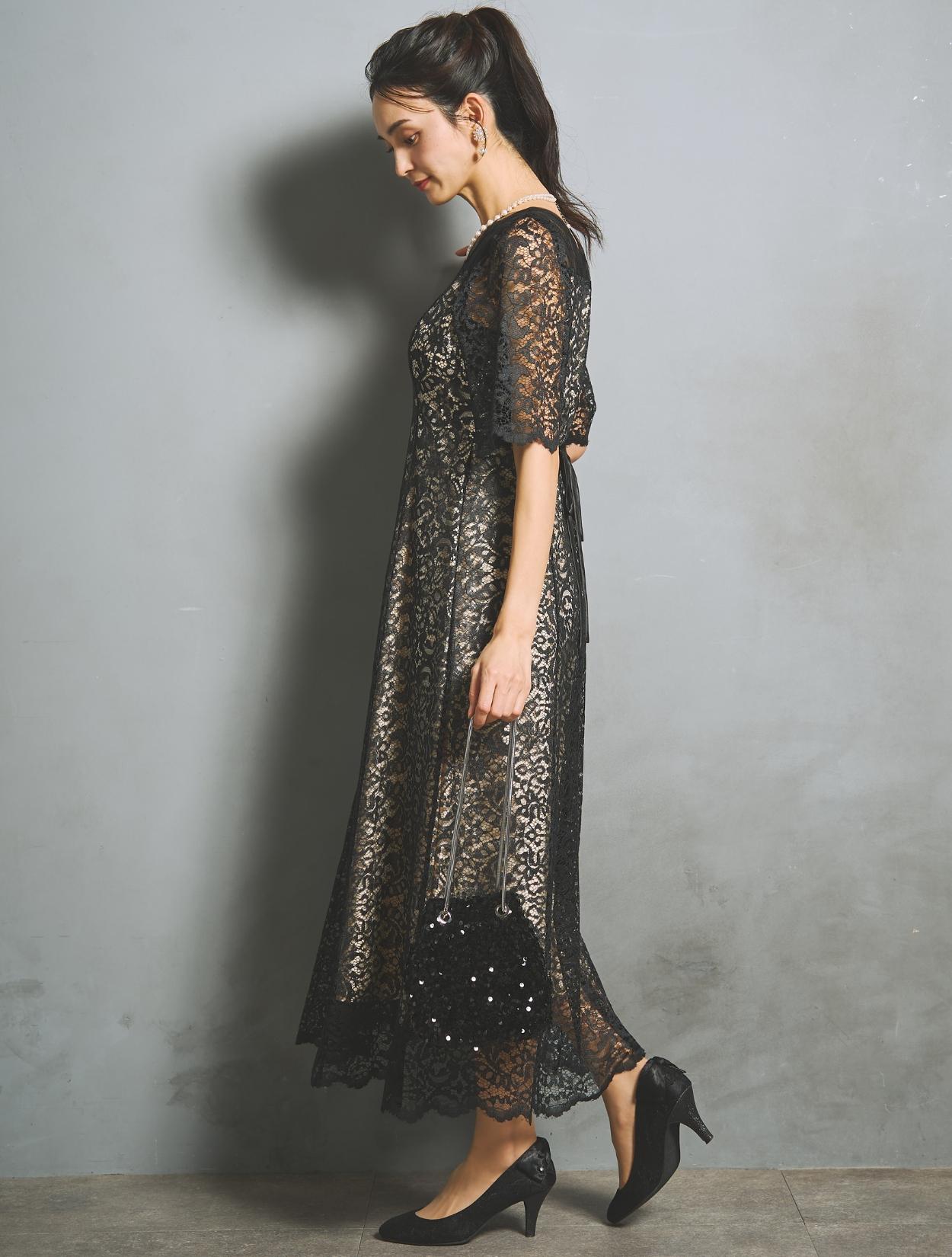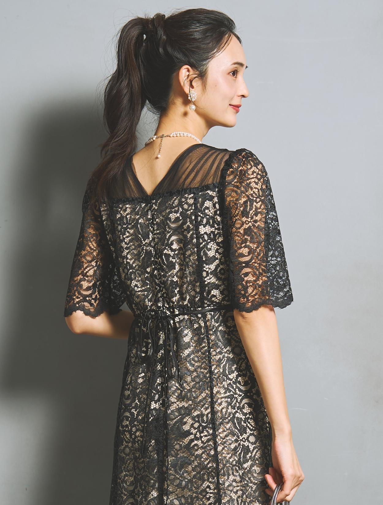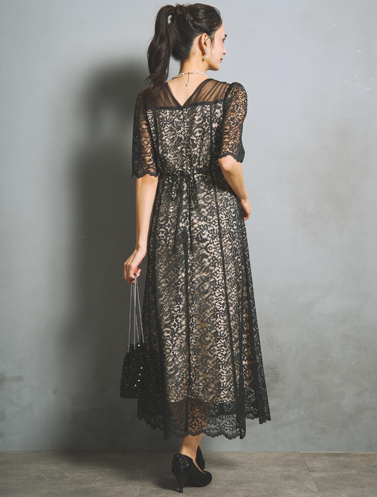ブラックドレスですが、レースの柄が透けて華やかさがあります。ご親族におすすめのカラーですが、お呼ばれゲストが着てもパーティー感がある着こなしができるブラックドレスです。