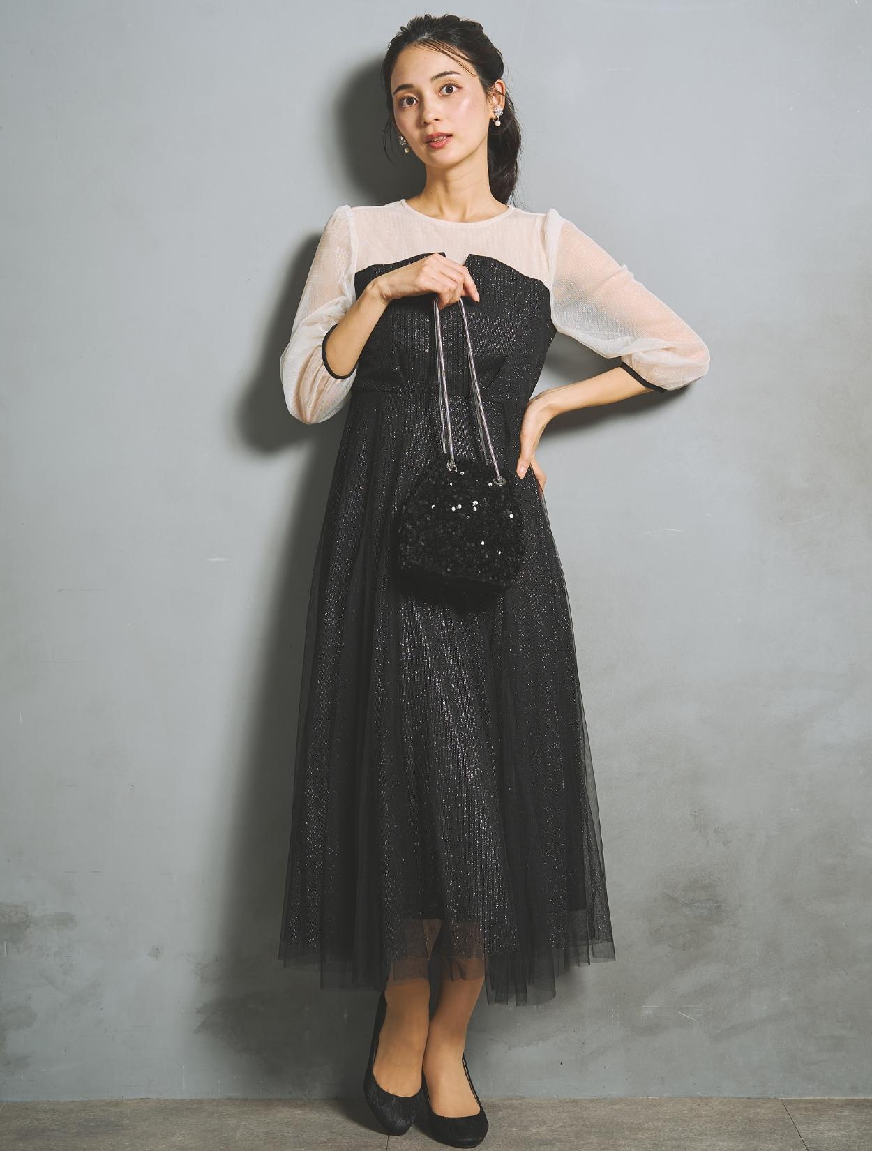 ラメチュールとスパンコールバッグのキラキラが、ブラックドレスにクラシカルな華やかさを出してくれます。シックなカラーですがしっかり華やかさもあるので、結婚式はもちろん、様々なシーンで活躍するコーデです。クリスタルとパールのビジューイヤリングは、上品なフォーマル感と程よい映え感があるアイテム。大ぶりすぎないですが、付けるだけでしっかり写真写りを良く見せてくれます。