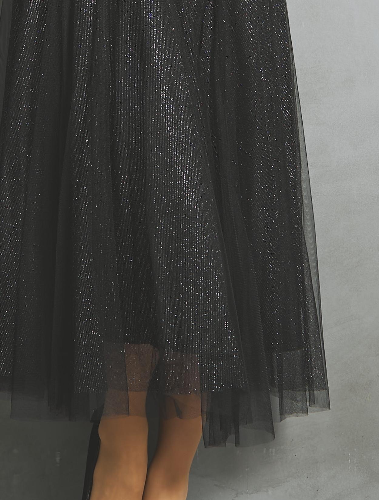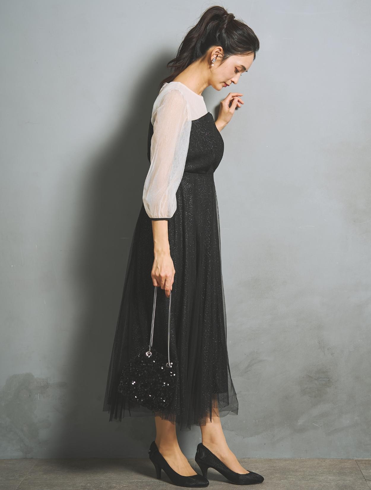 ラメチュールと無地チュールを重ねた、華やかでエアリー感たっぷりのドレス。歩くたびスカートがフワッと揺れて、軽やかに広がります。