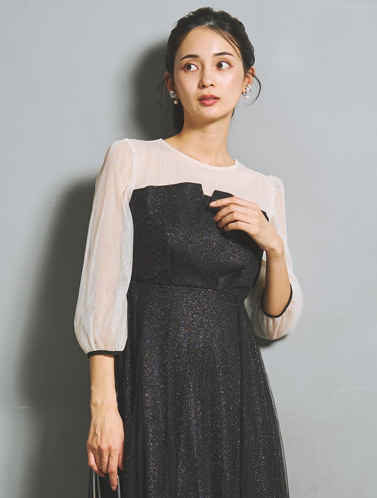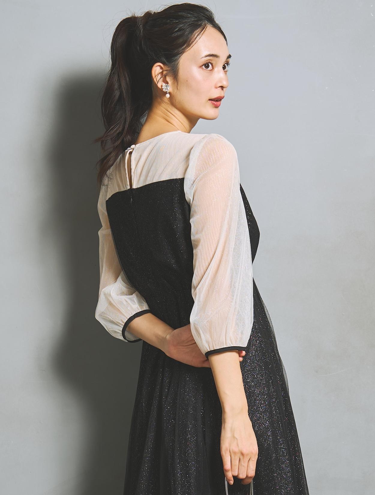 ビスチェ風のデザインにハイウエスト切り替えで、スタイルにメリハリが出ます。ビスチェデザインは立体感があり、上半身が華奢な方でも上品に盛れて◎。フワッとした七分袖は、気になる二の腕をカバーしつつ、手首を覗かせて華奢見えします。袖部分のシアー感で抜け感もあり。