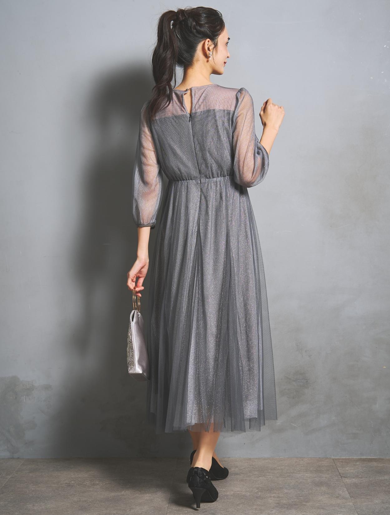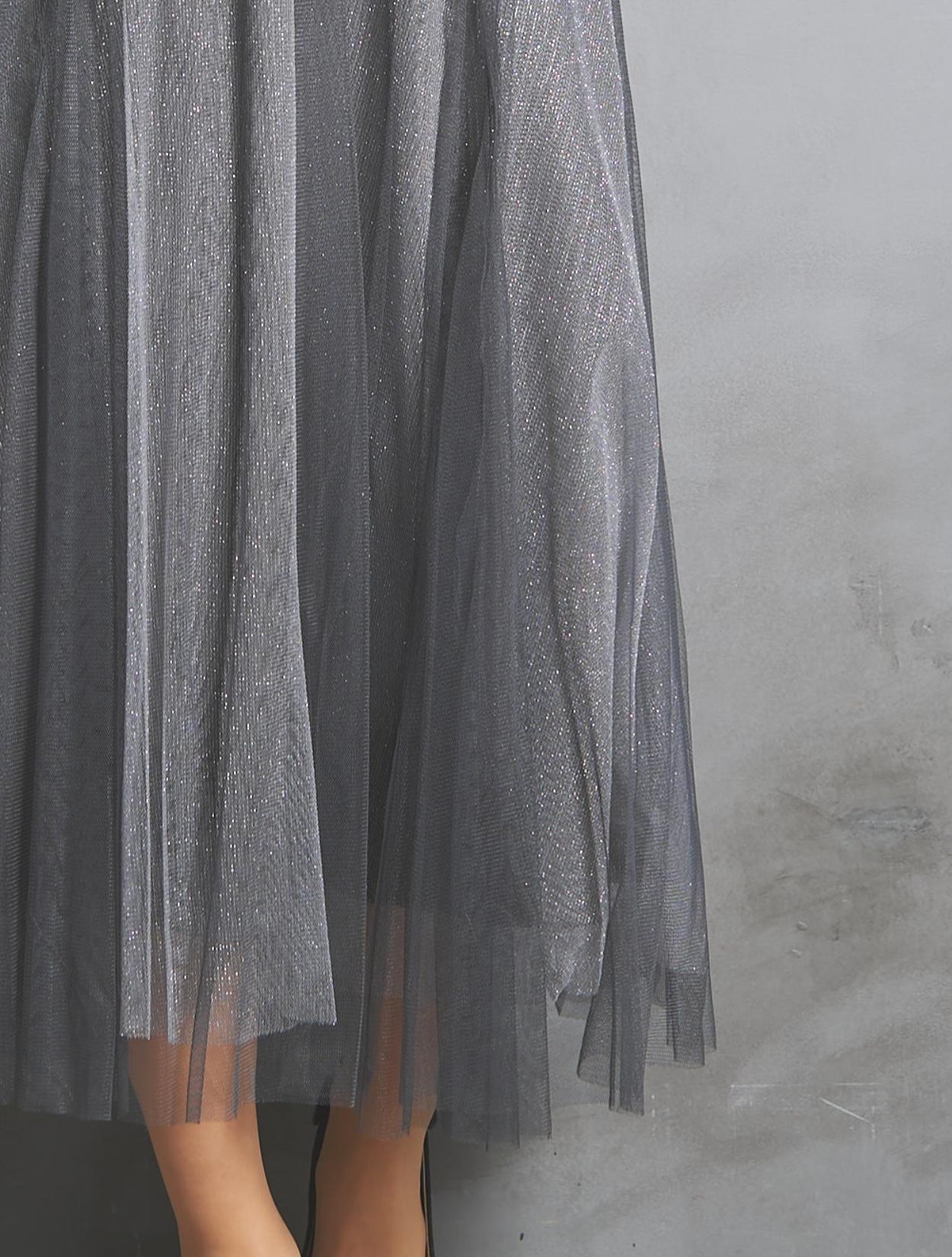 ラメチュールと無地チュールを重ねた、華やかでエアリー感たっぷりのドレス。歩くたびスカートがフワッと揺れて、軽やかに広がります。