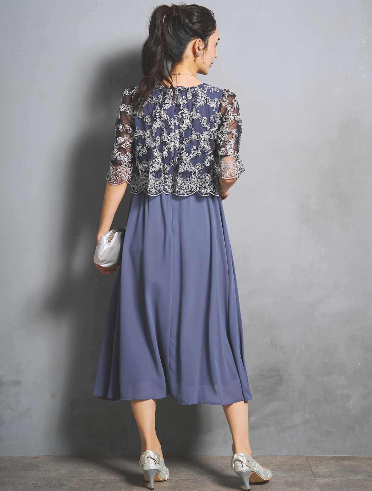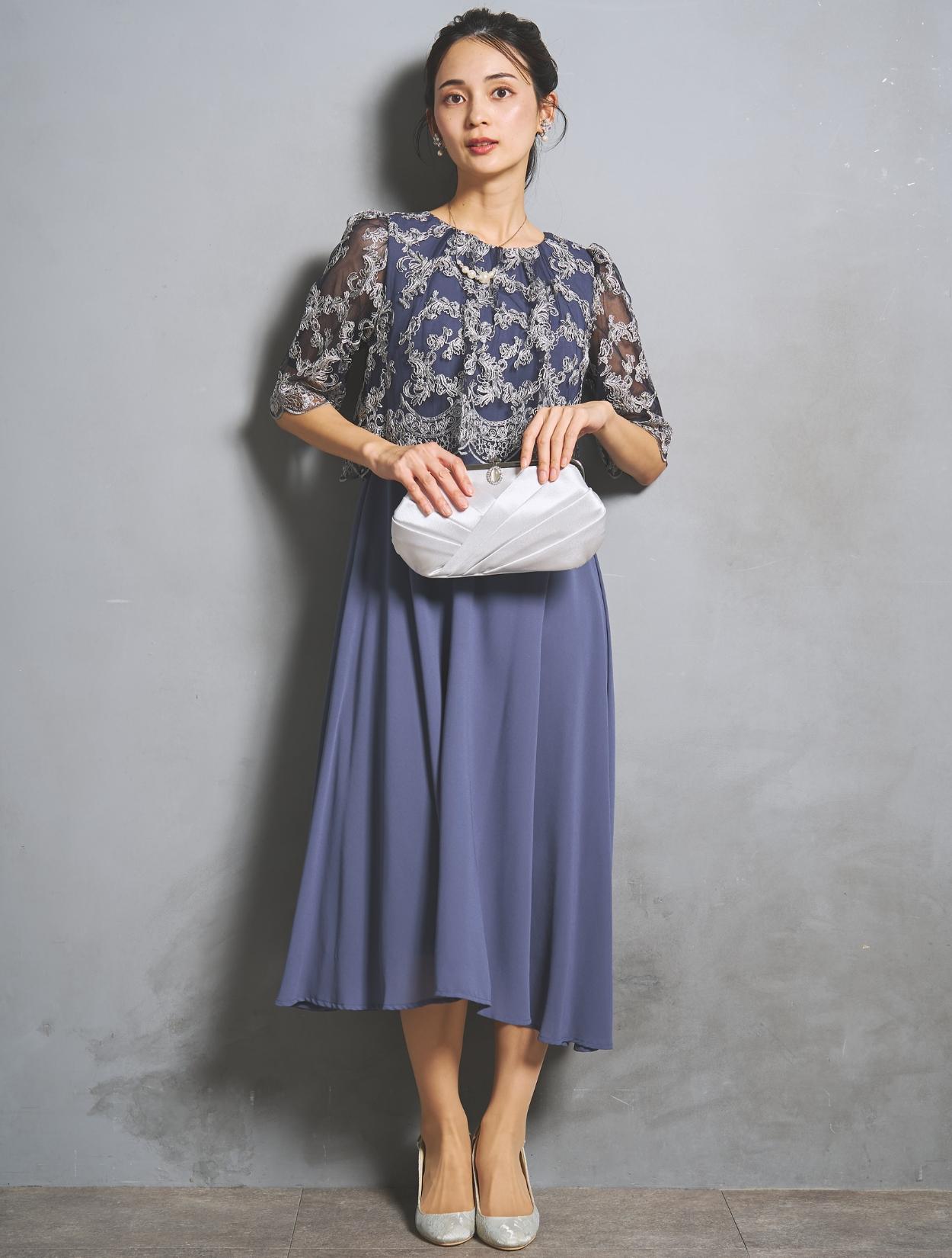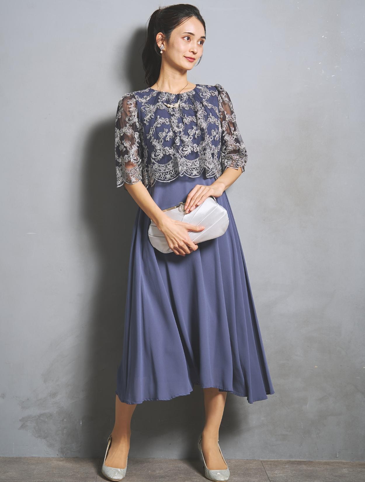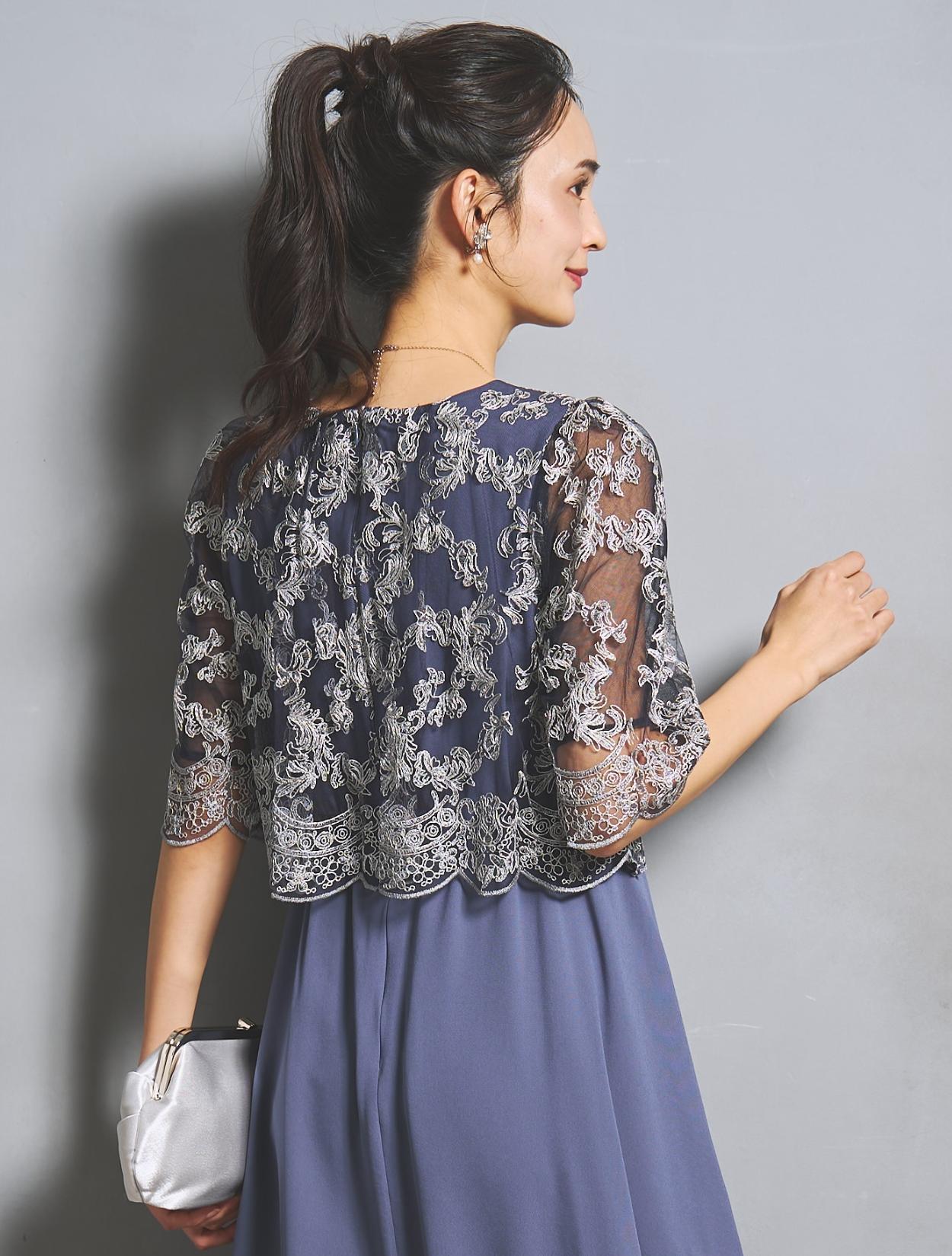オーバーブラウスのレースは、華やかな刺繍のスカラップレース。派手過ぎないドレスですが、華やかさはあります。様々な年代の方に着ていただけるドレスです。