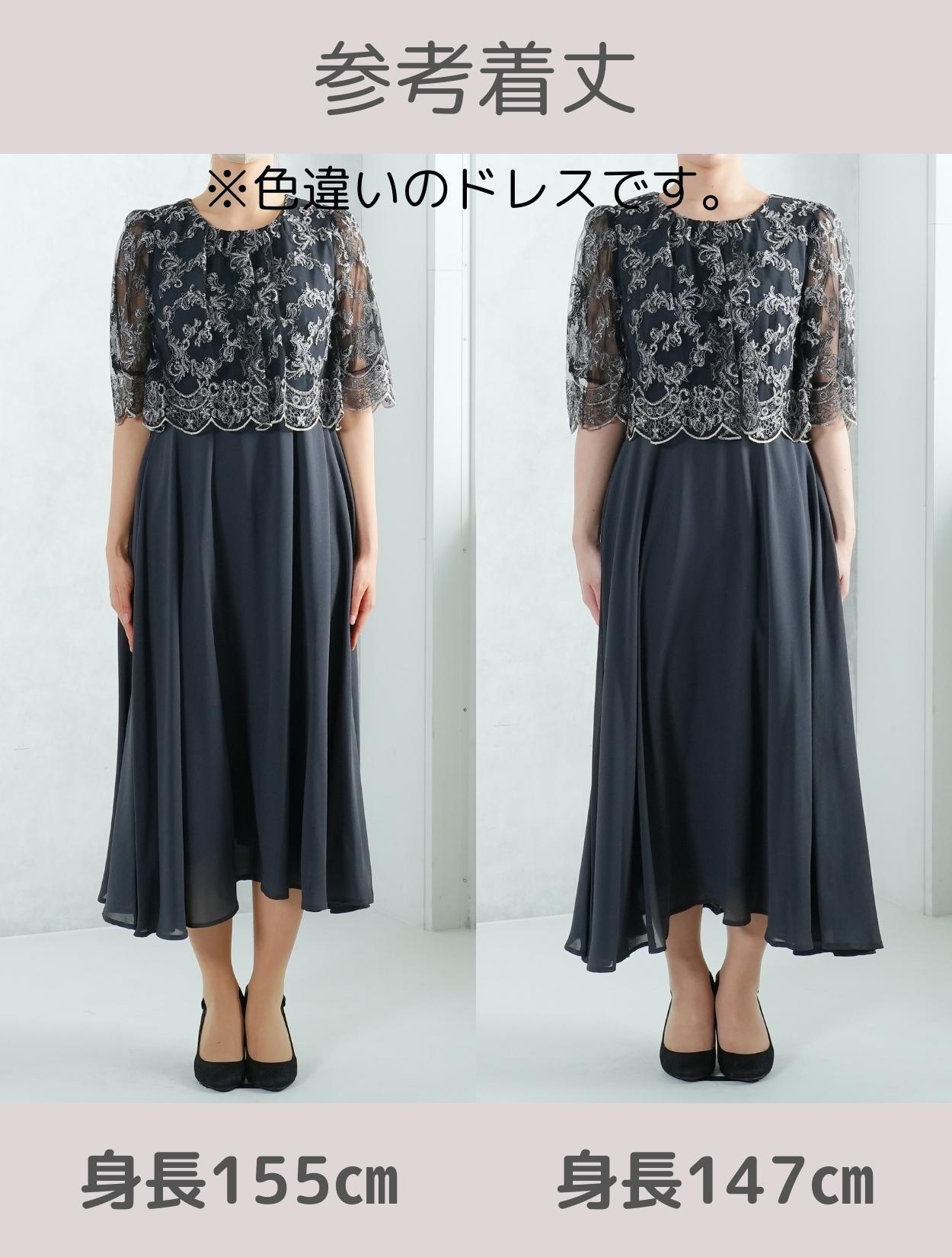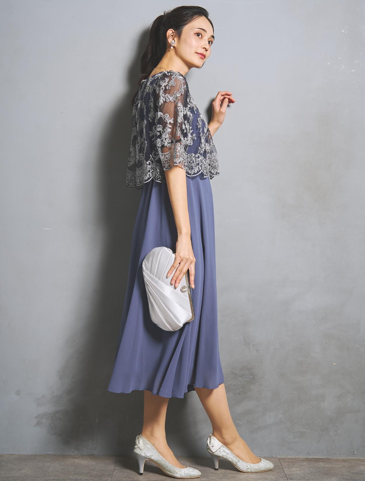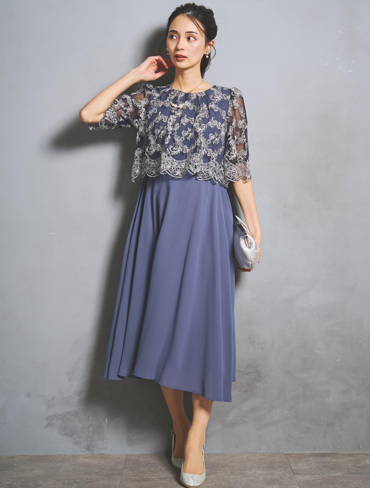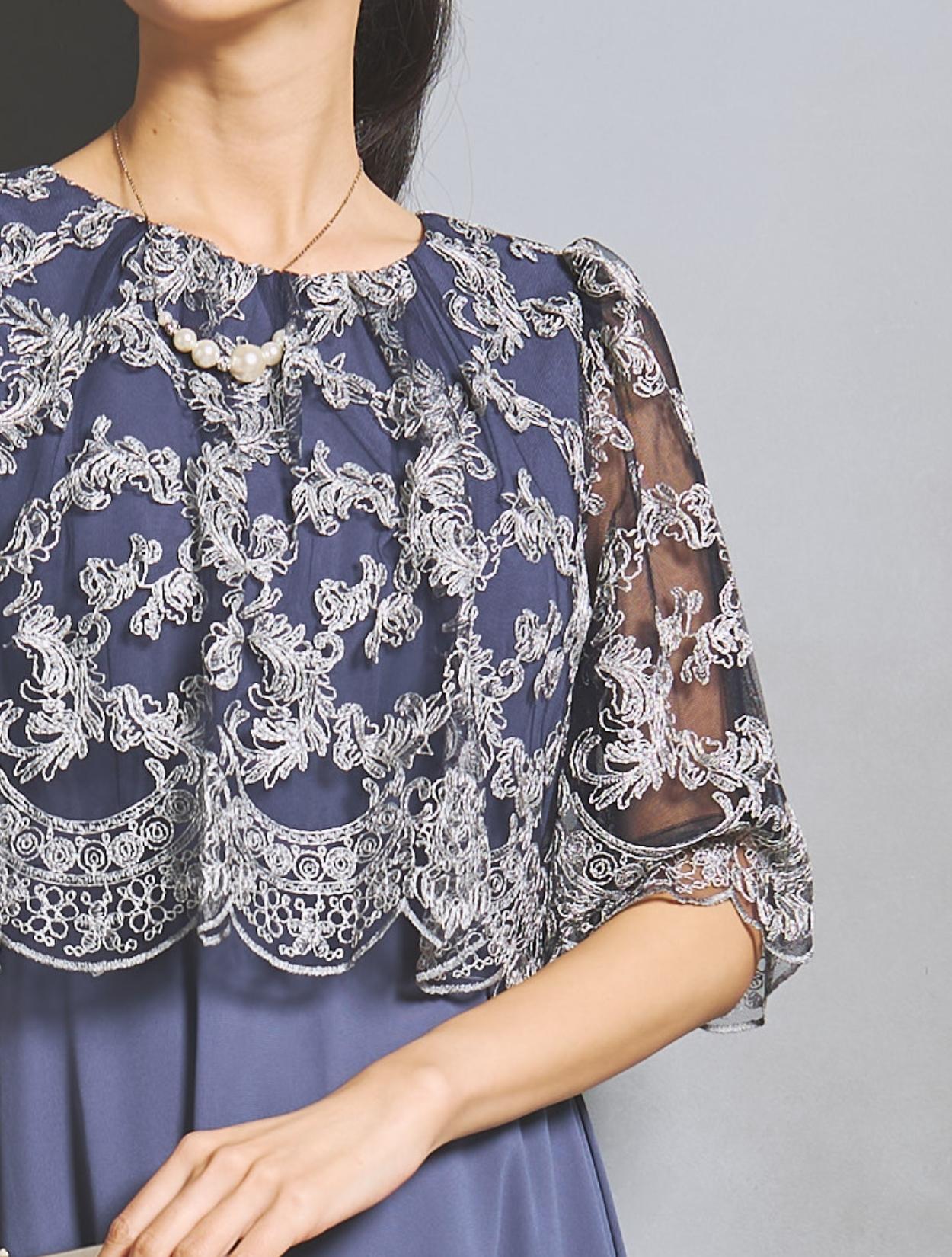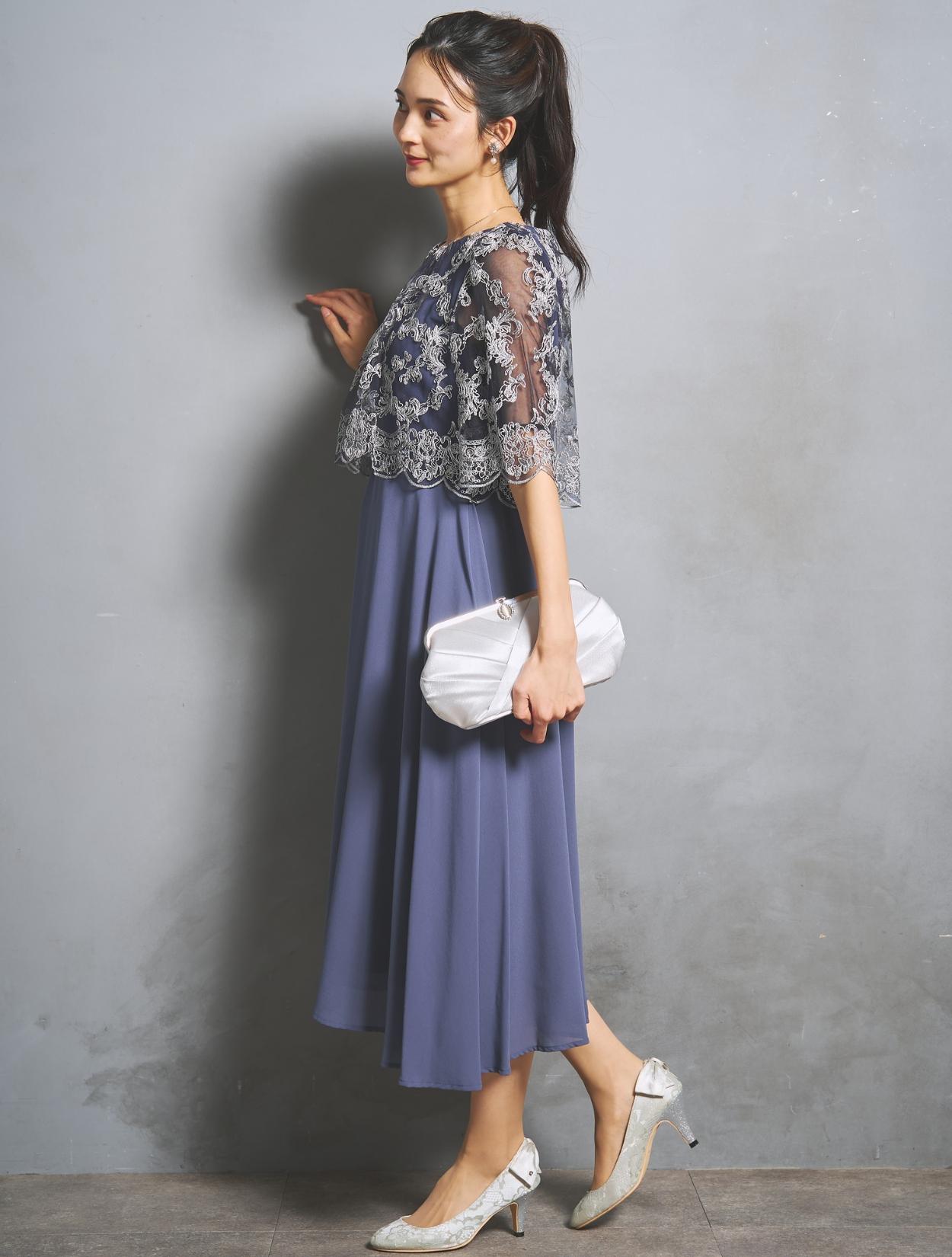 オーバーブラウスのレースは、華やかな刺繍のスカラップレース。派手過ぎないドレスですが、華やかさはあります。様々な年代の方に着ていただけるドレスです。
