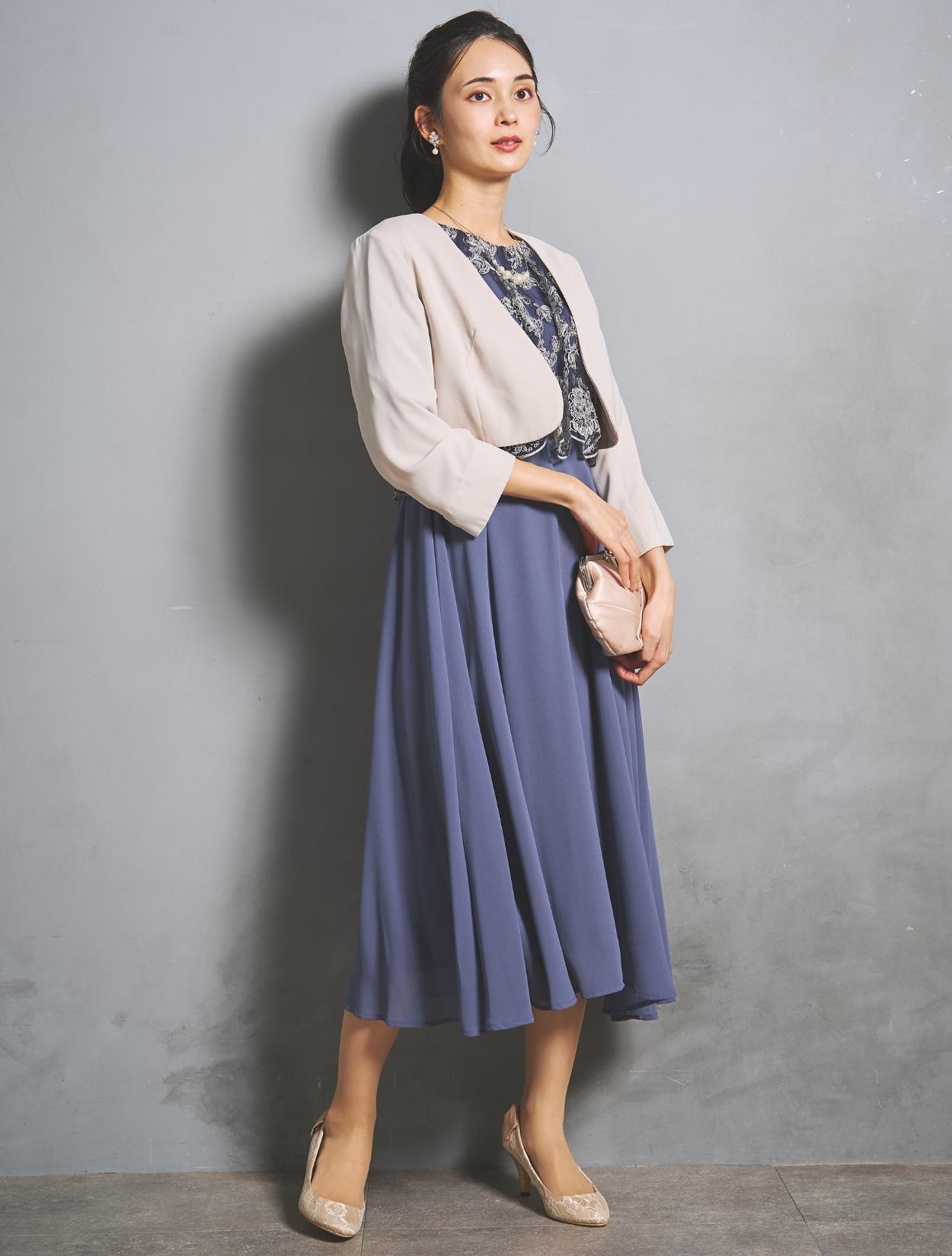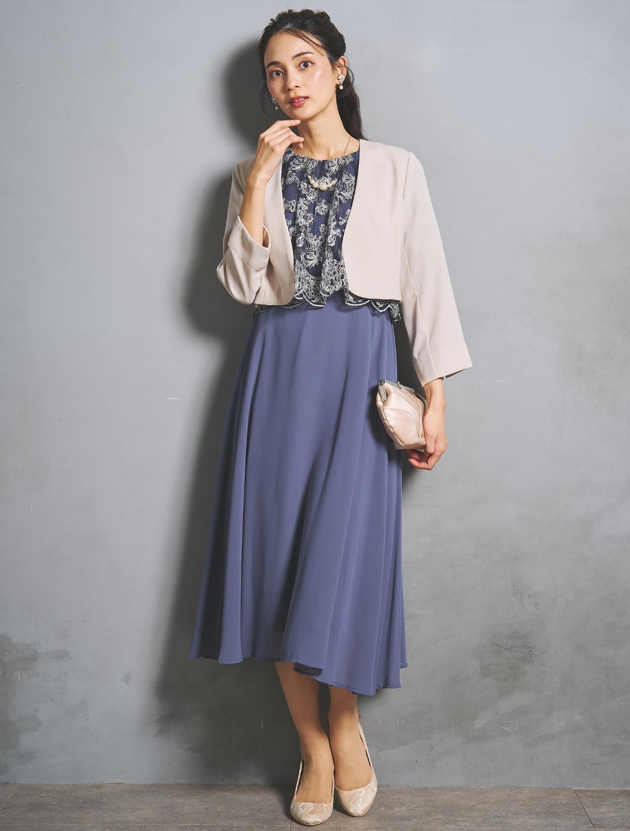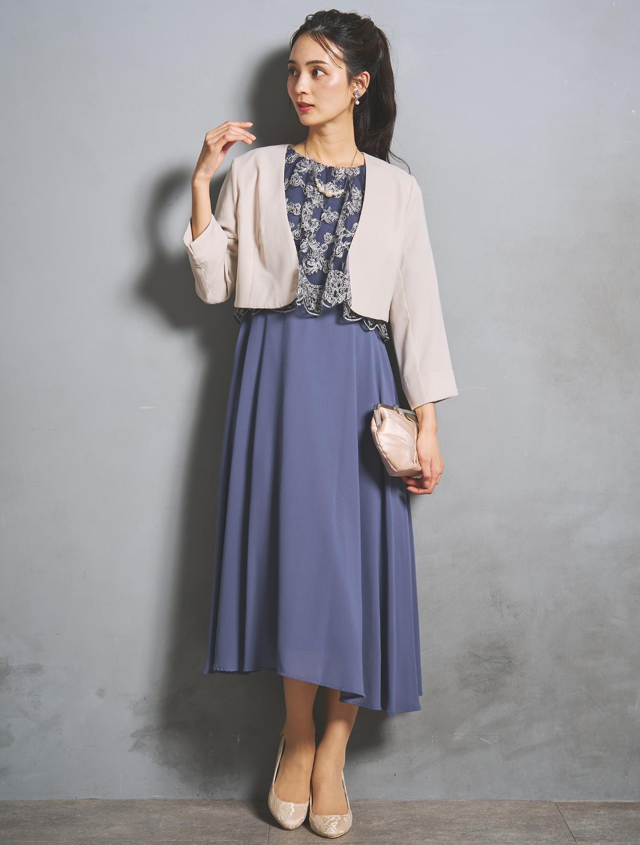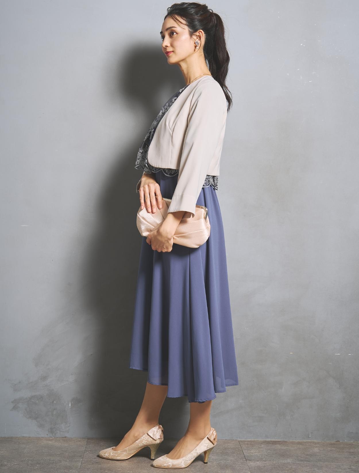 オーバーブラウスのレースは、華やかな刺繍のスカラップレース。派手過ぎないドレスですが、華やかさはあります。様々な年代の方に着ていただけるドレスです。