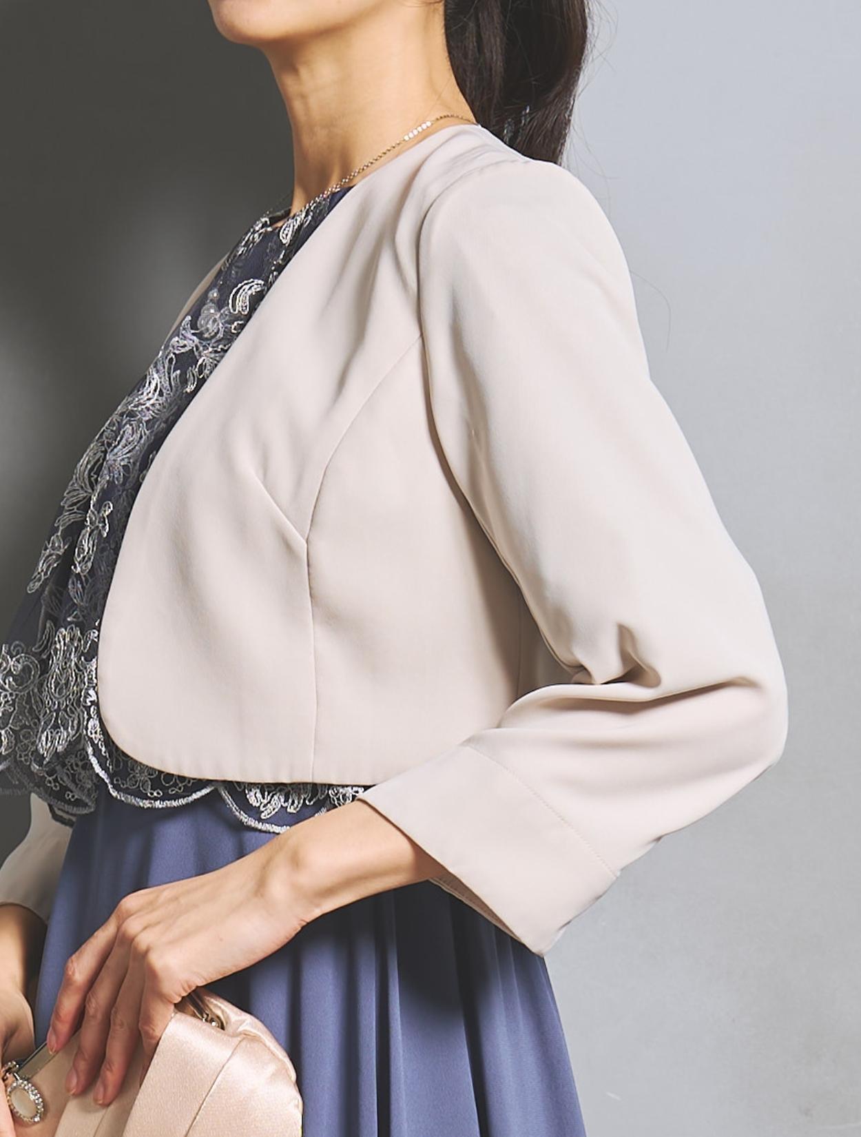 肘までの袖ありドレスで、一枚で着ても上品。袖は二枚仕立てで、二の腕の透け感を抑えてくれるのも嬉しいポイント。