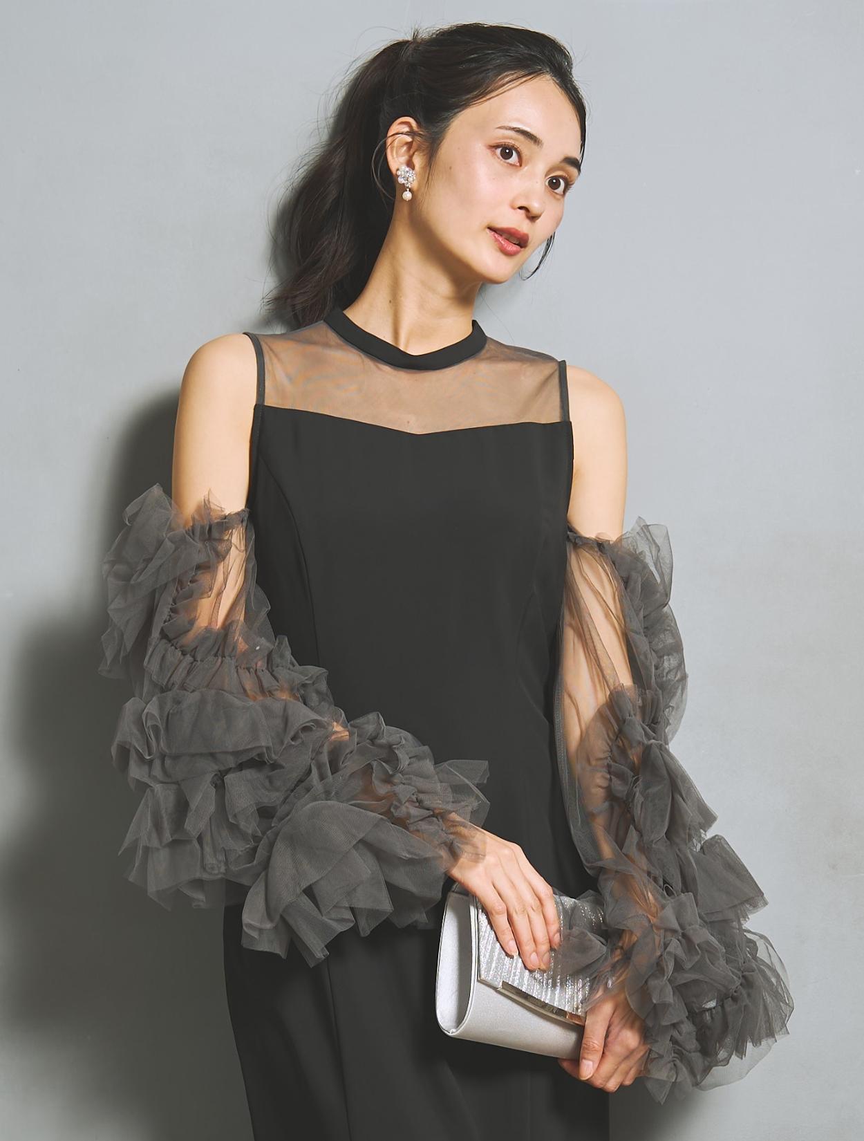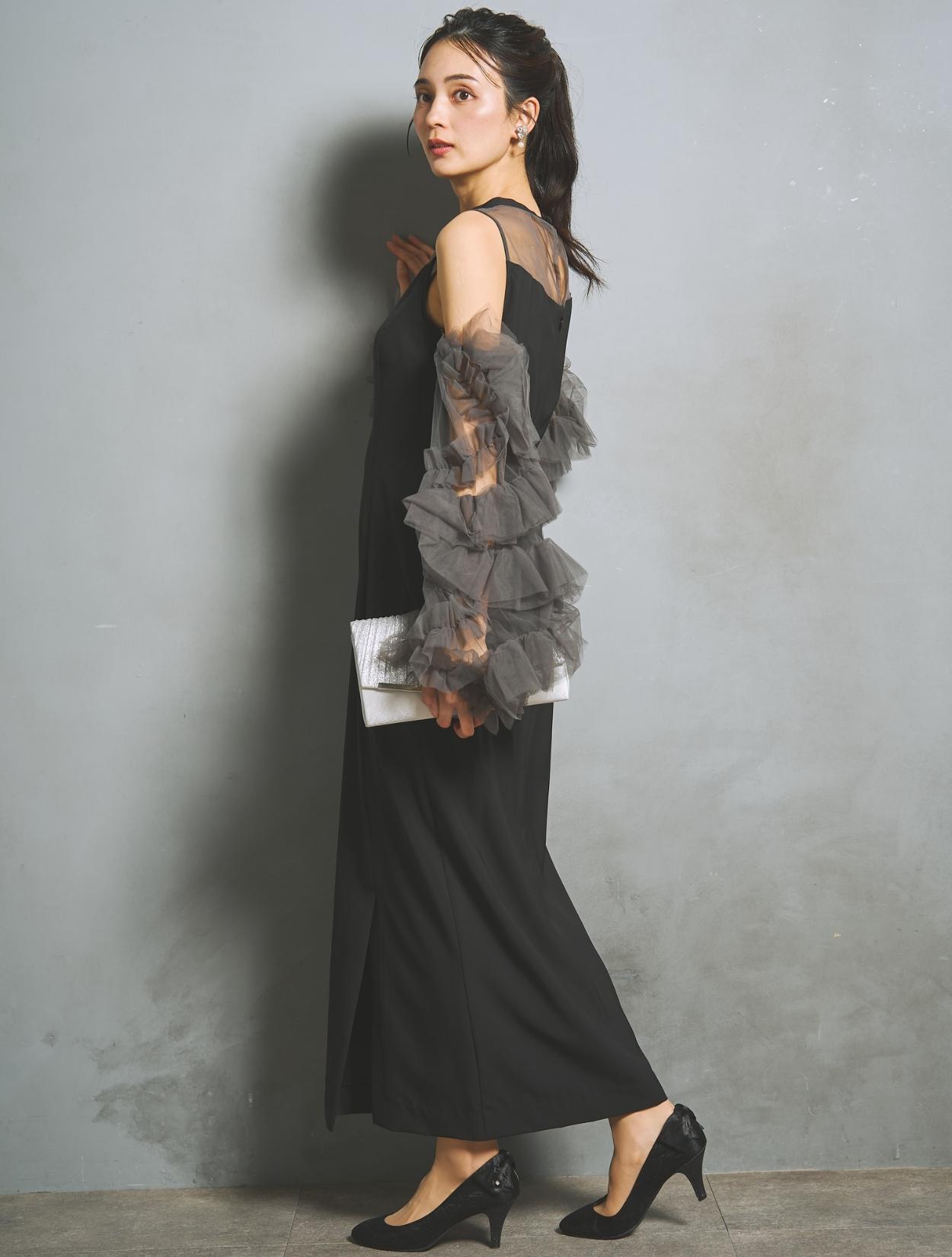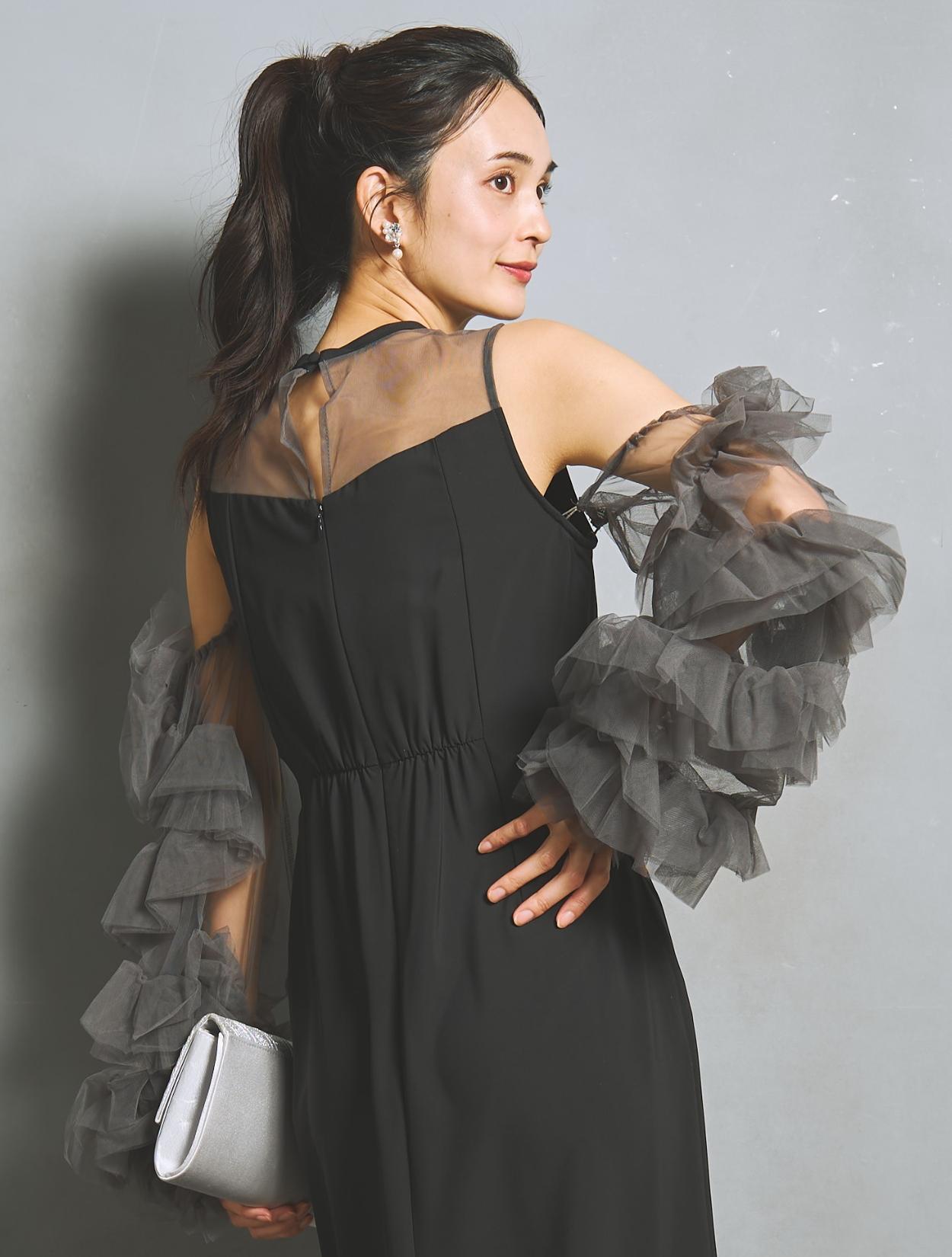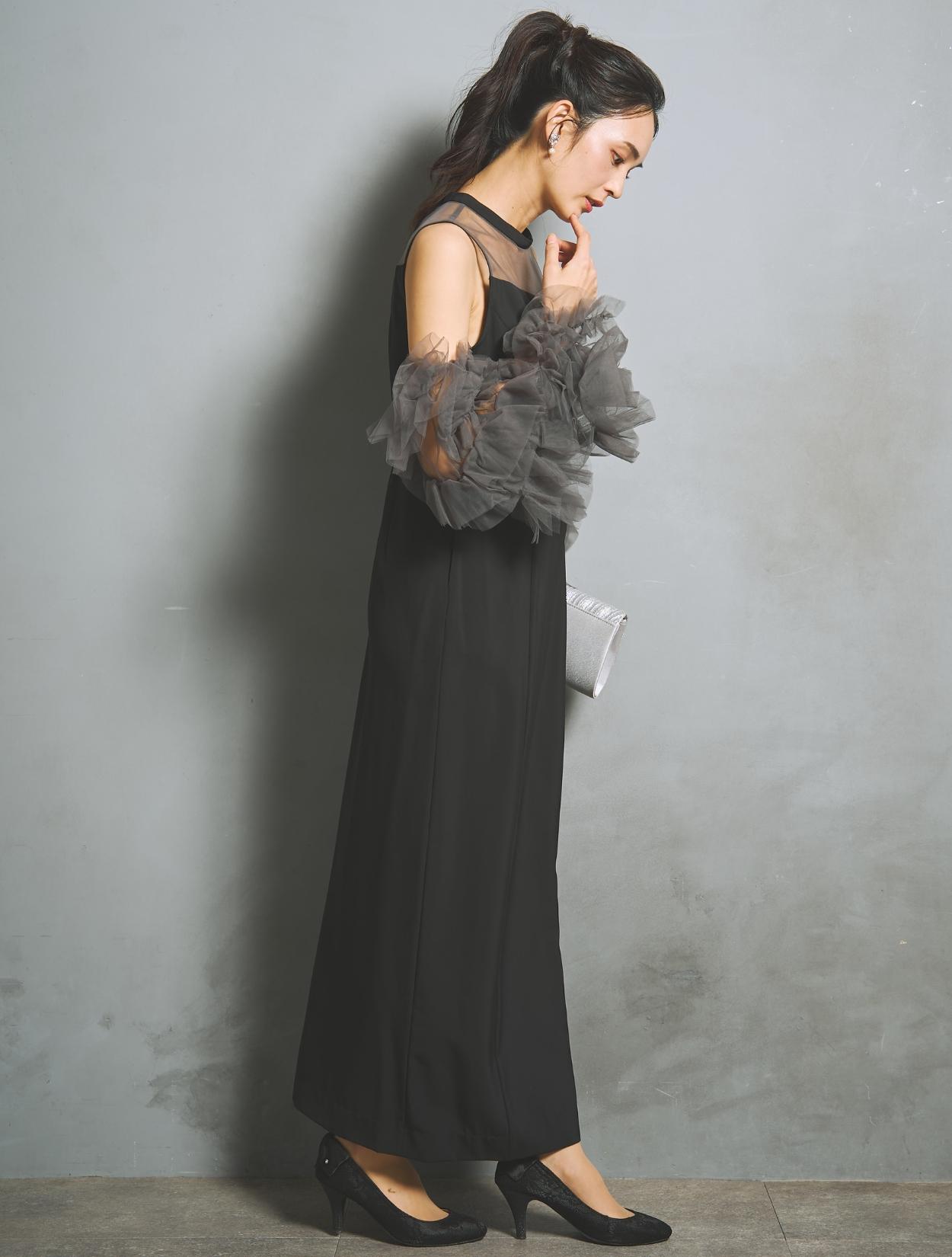 ブラックのワンピースに、炭黒のようなアッシュな雰囲気のボリュームチュールスリーブ。ブラックドレスでも異なる色味や素材で、メリハリと立体感がある着こなしができます。ブラックのチュールスリーブは、透け感とボリュームで大人っぽい華やかさを出してくれます。