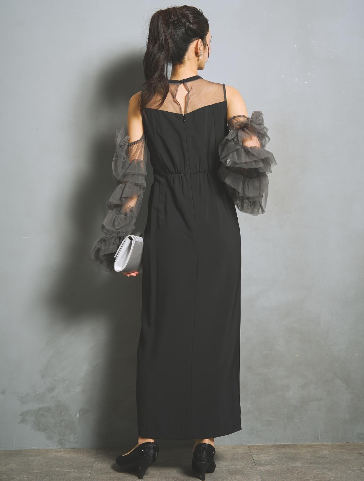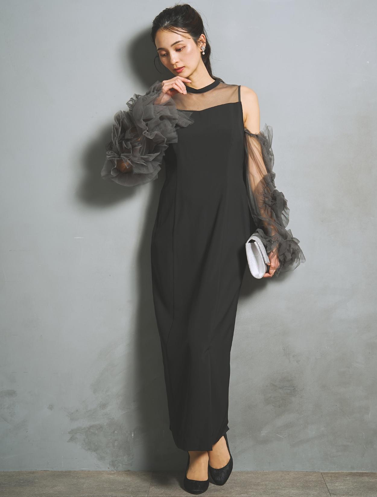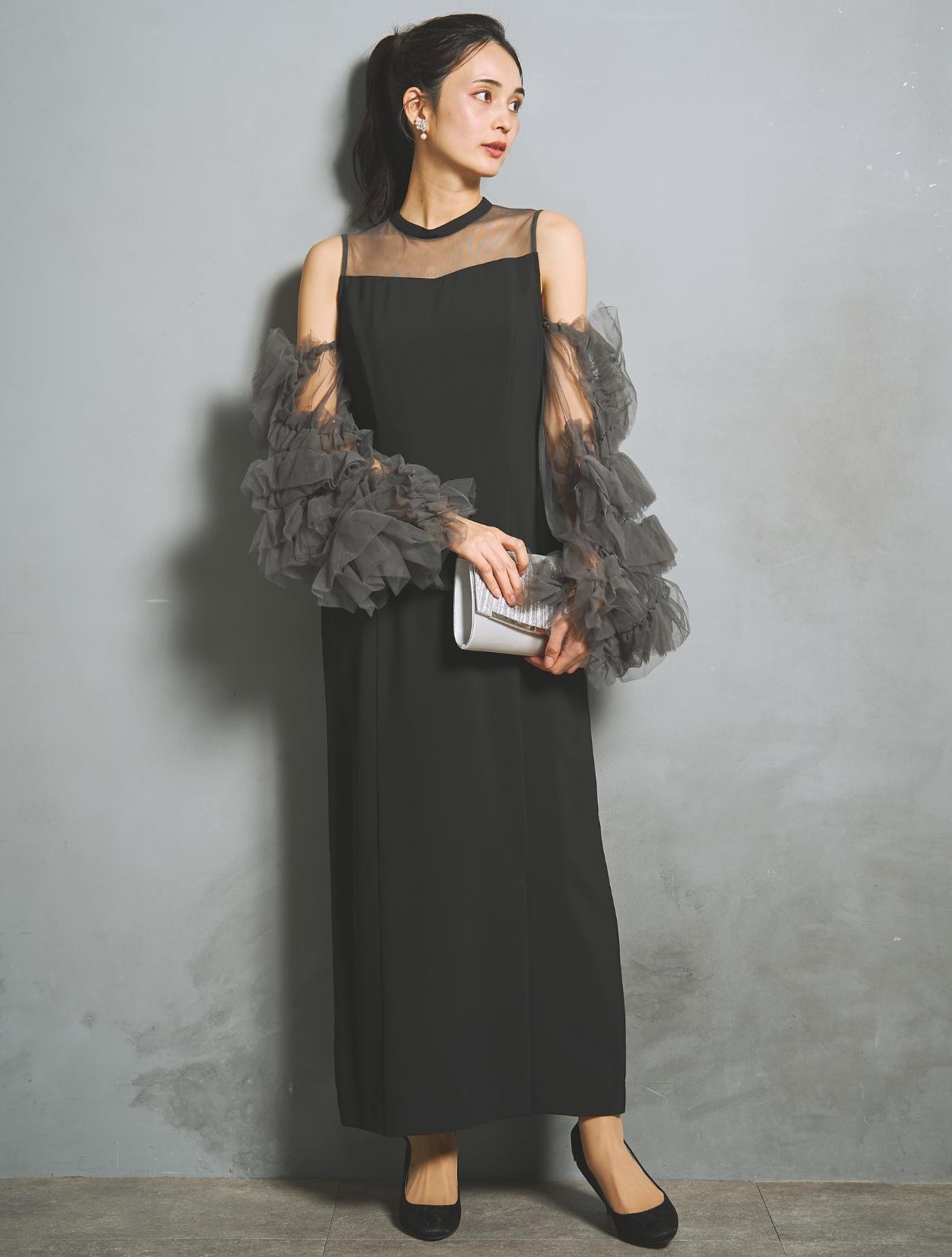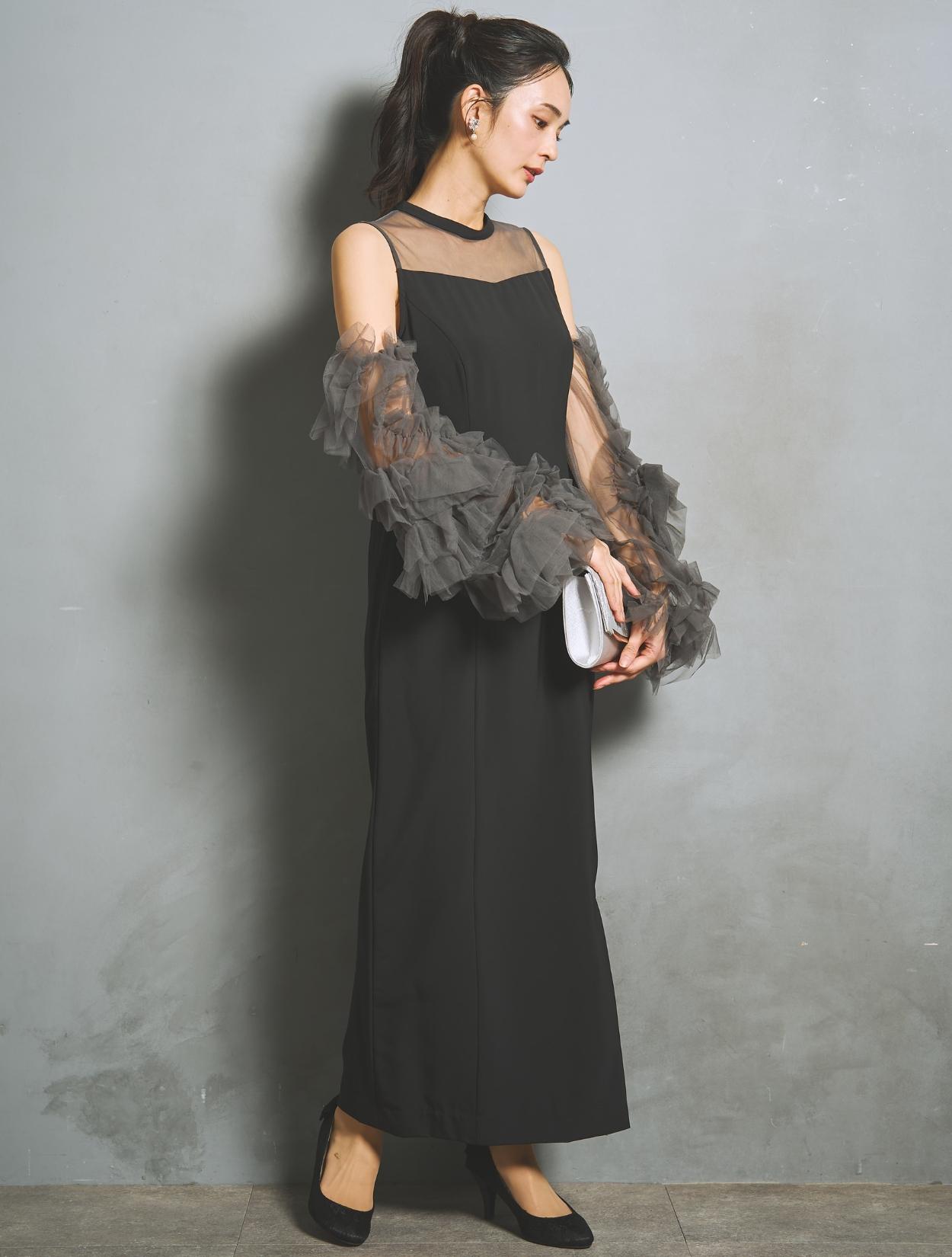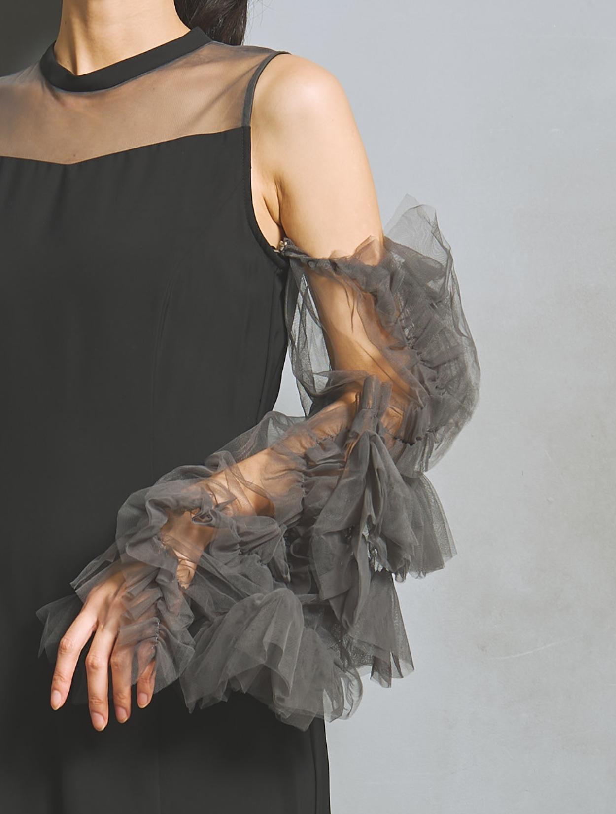 ブラックのワンピースに、炭黒のようなアッシュな雰囲気のボリュームチュールスリーブ。ブラックドレスでも異なる色味や素材で、メリハリと立体感がある着こなしができます。ブラックのチュールスリーブは、透け感とボリュームで大人っぽい華やかさを出してくれます。