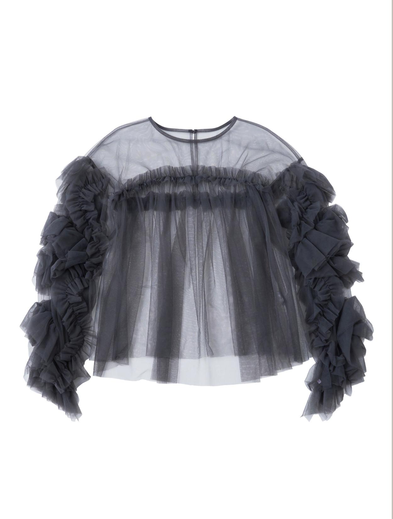 ウェーブ状に配置されたボリュームたっぷりのチュールフリルの袖は、デコラティブでシンプルなパンツドレスとの相性抜群。袖口にゴムが入っているので、お食事の時でも安心です。あえて袖をたくし上げて、さらにボリューミーな袖を楽しむのもおすすめの着こなし。オーバーサイズのデザインですが、軽くて透け感のある素材は着膨れせずに着られます。ブラウスの着丈は前後差があり、後ろ側はふんわりヒップが隠れる丈で安心感もあります。