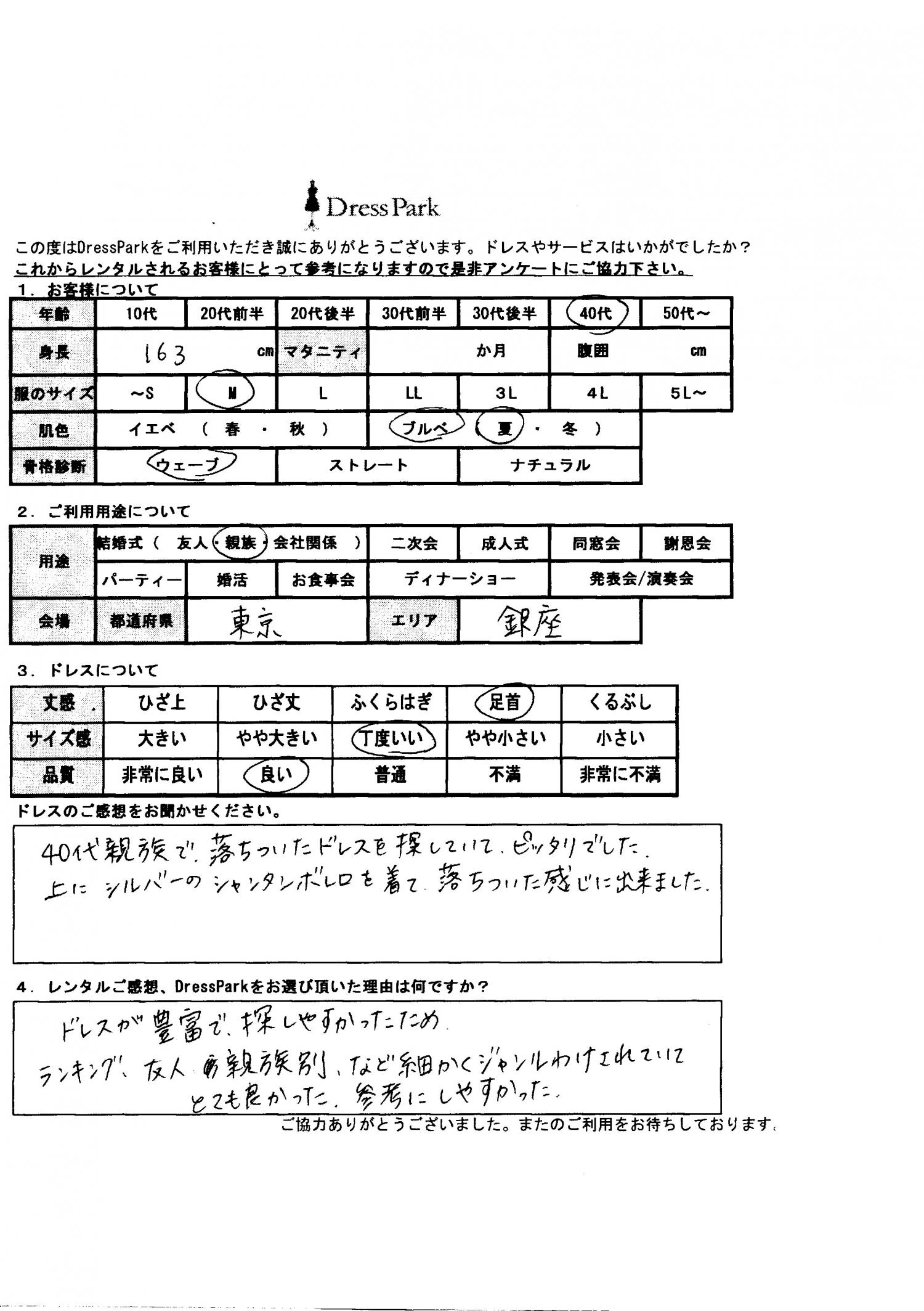40代親族で、落ち着いたドレスを探していてぴったりでした。上にシルバーのシャンタンボレロを着て、落ち着いた感じにできました。レンタルのご感想、