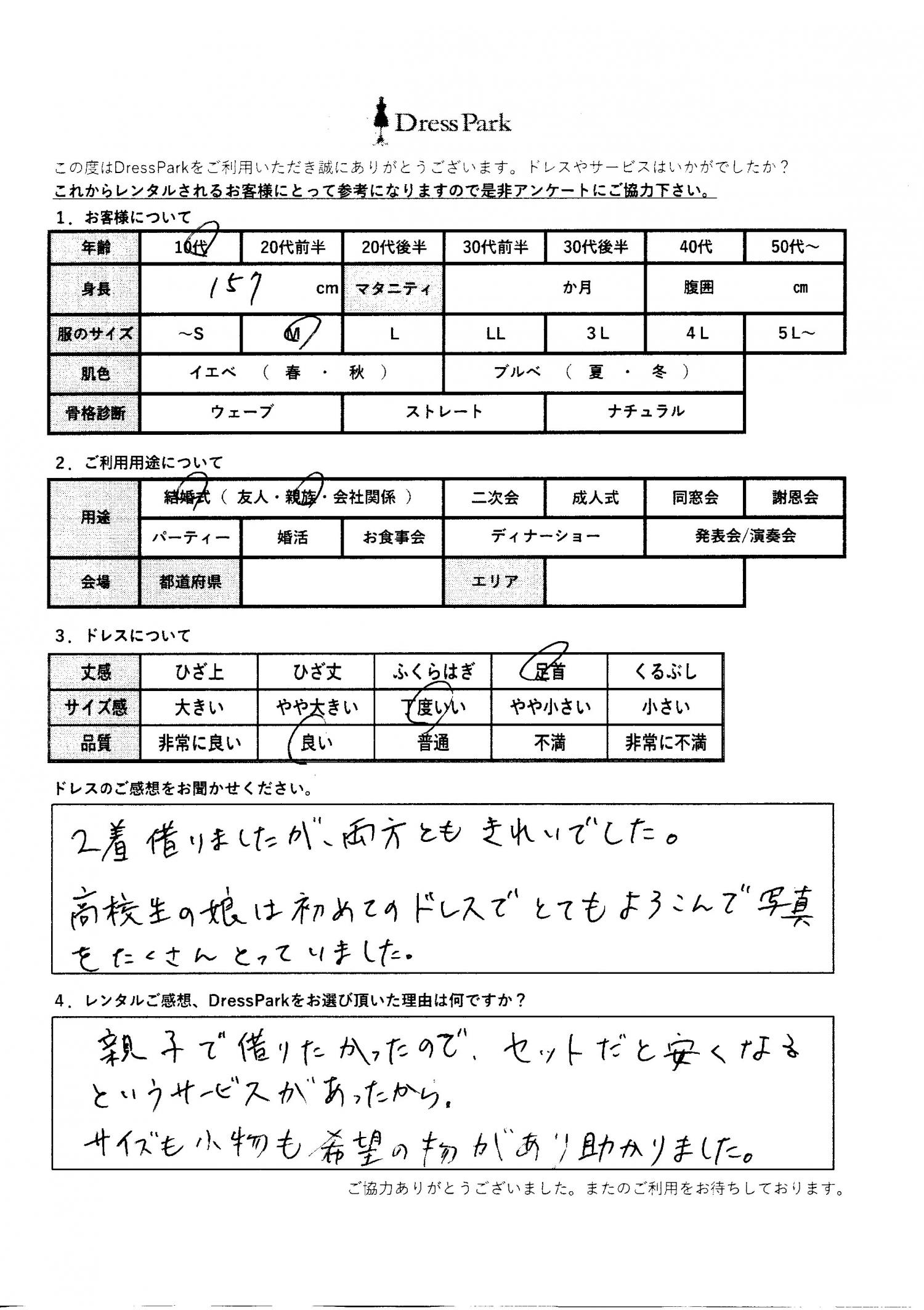 2着借りましたが、両方ともきれいでした。高校生の娘は初めてのドレスで、とても喜んで写真をたくさん撮っていました。