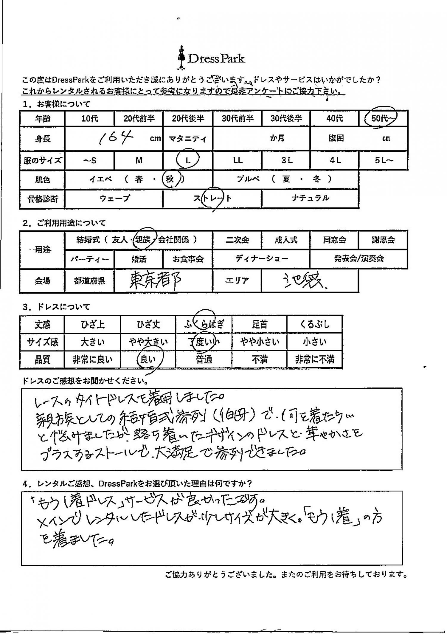 レースのタイトドレスを着用しました。親族としての結婚式参列(伯母)で何を着たら…と悩みましたが、落ち着いたデザインのドレスと華やかさをプラスするストールで大満足で参列できました。