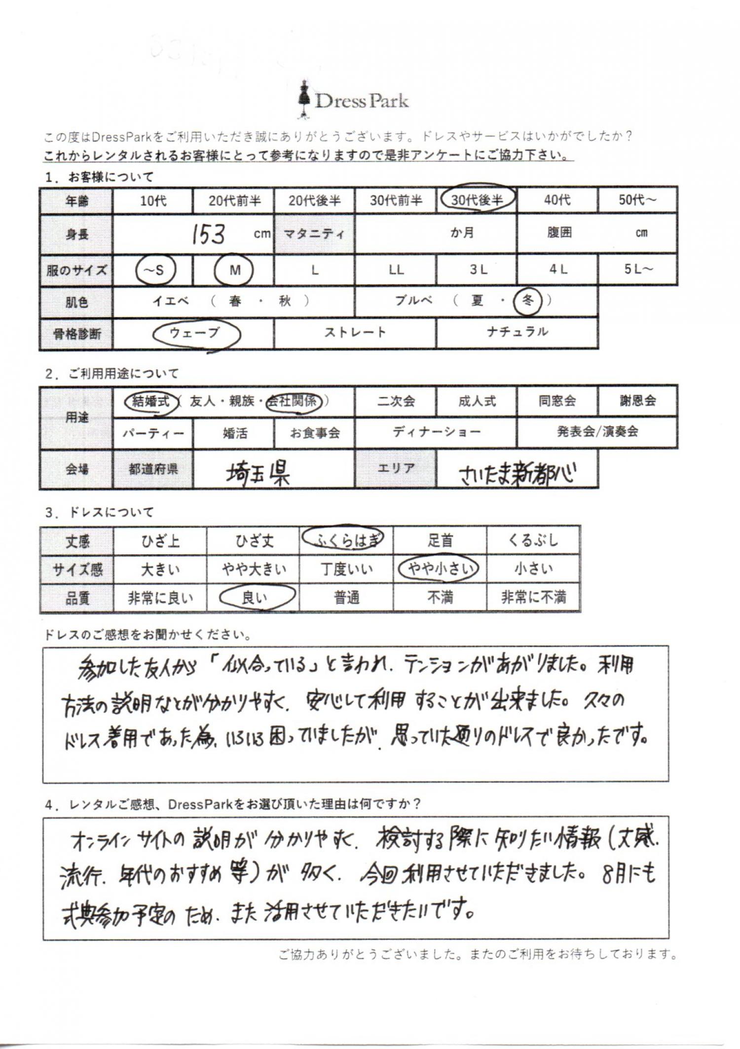 埼玉県 S.Y様153㎝ Mサイズ大宮・浦和