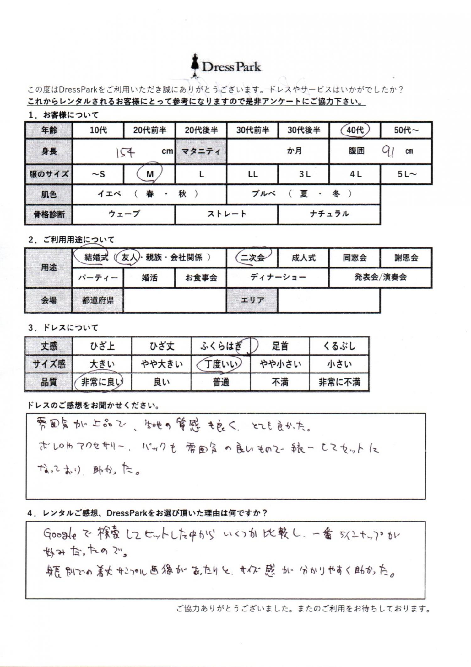 雰囲気が上品で、生地の質感も良くとても良かった。ボレロやアクセサリー・バッグも雰囲気の良いもので、統一したセットになっており助かった。レンタルのご感想、
