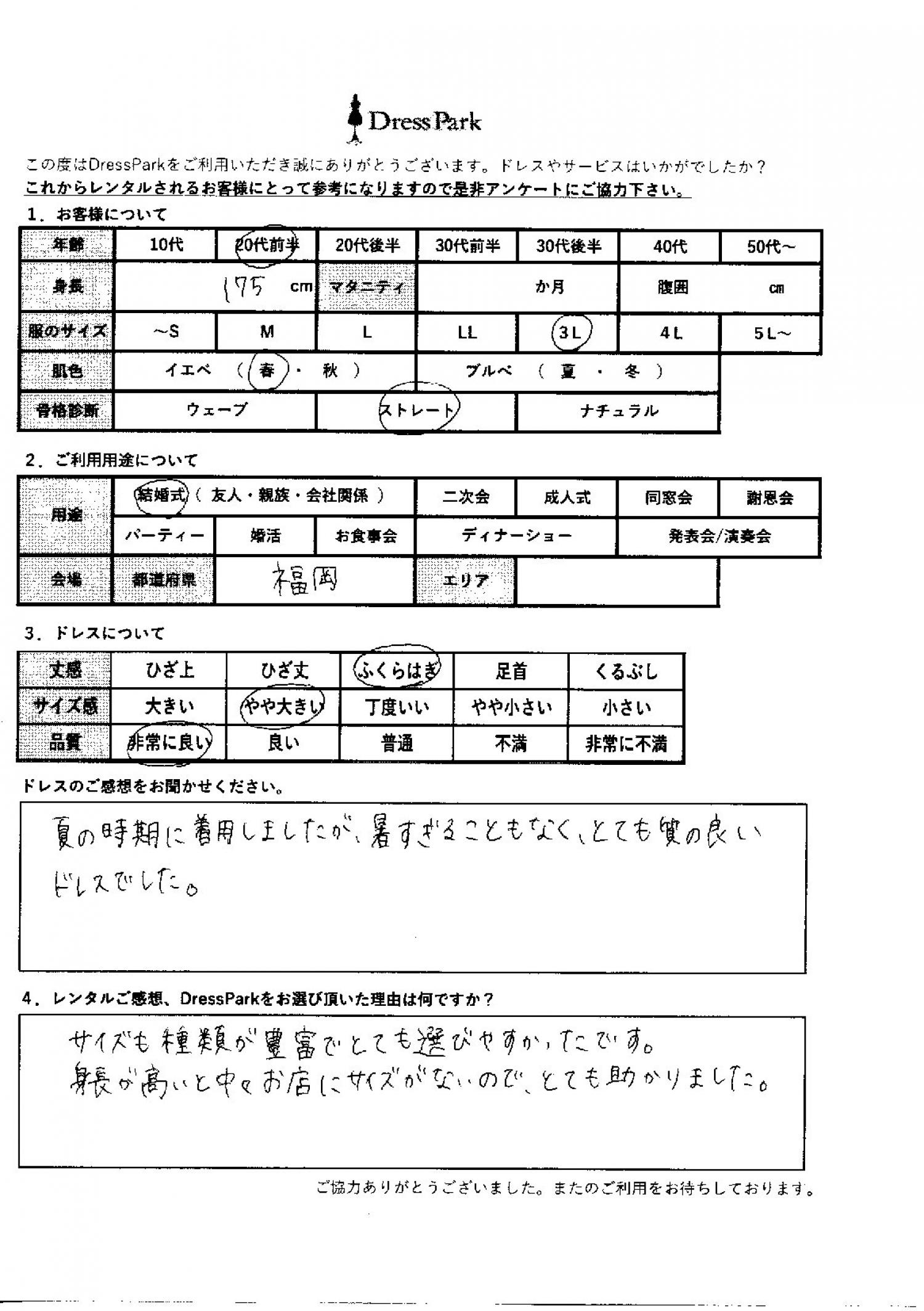 夏の時期に着用しましたが、暑過ぎることもなく、とても質の良いドレスでした。レンタルのご感想、