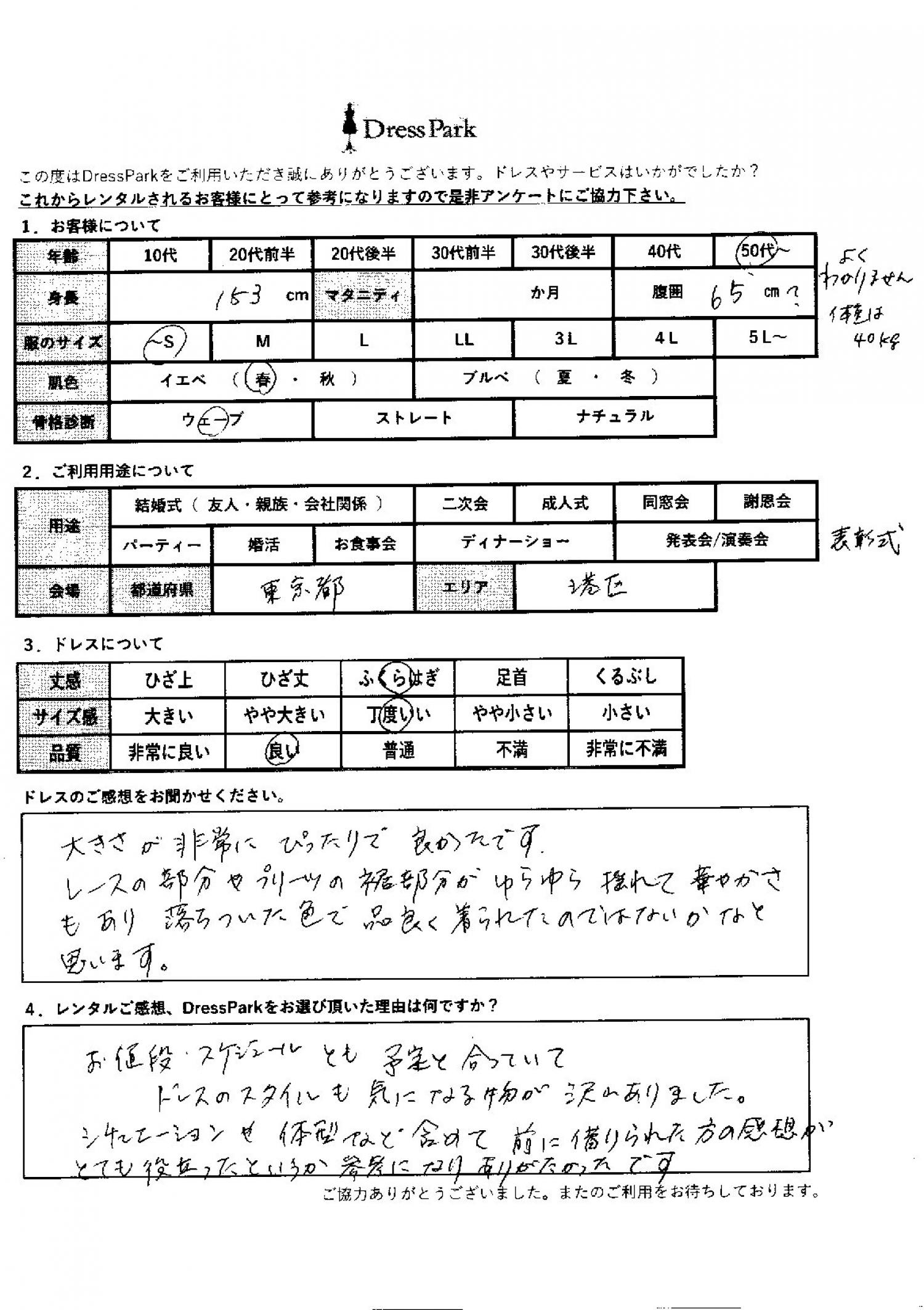 お値段、スケジュールとも予定と合っていて、ドレスのスタイルも気になるものがたくさんありました。シチュエーションや体型など含めて前に借りられた方の感想が、とても役立ったというか、参考になりありがたかったです。