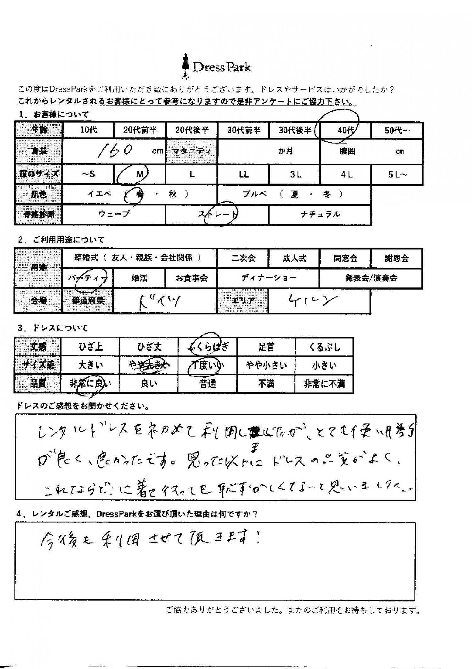 レンタルドレスを初めて利用しましたが、とても使い勝手が良く良かったです。思った以上にドレスの品質が良く、これならどこに来て行っても恥ずかしくないなと思いました。レンタルのご感想、