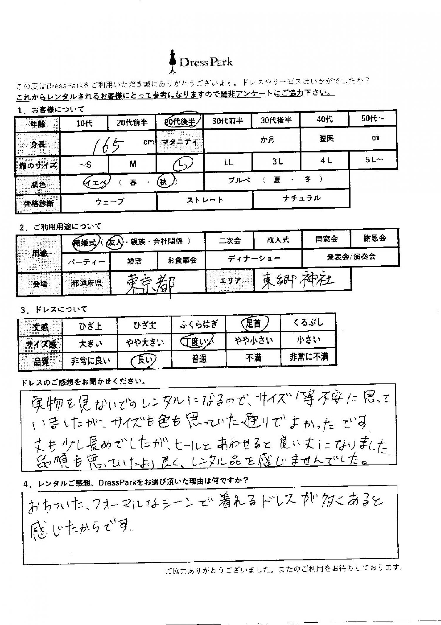 実物を見ないでのレンタルになるので、サイズ等不安に思っていましたが、サイズも色も思っていた通りでよかったです。丈も少し長めでしたが、ヒールを合わせると良い丈になりました。品質も思っていたより良く、レンタル品を感じませんでした。レンタルのご感想、