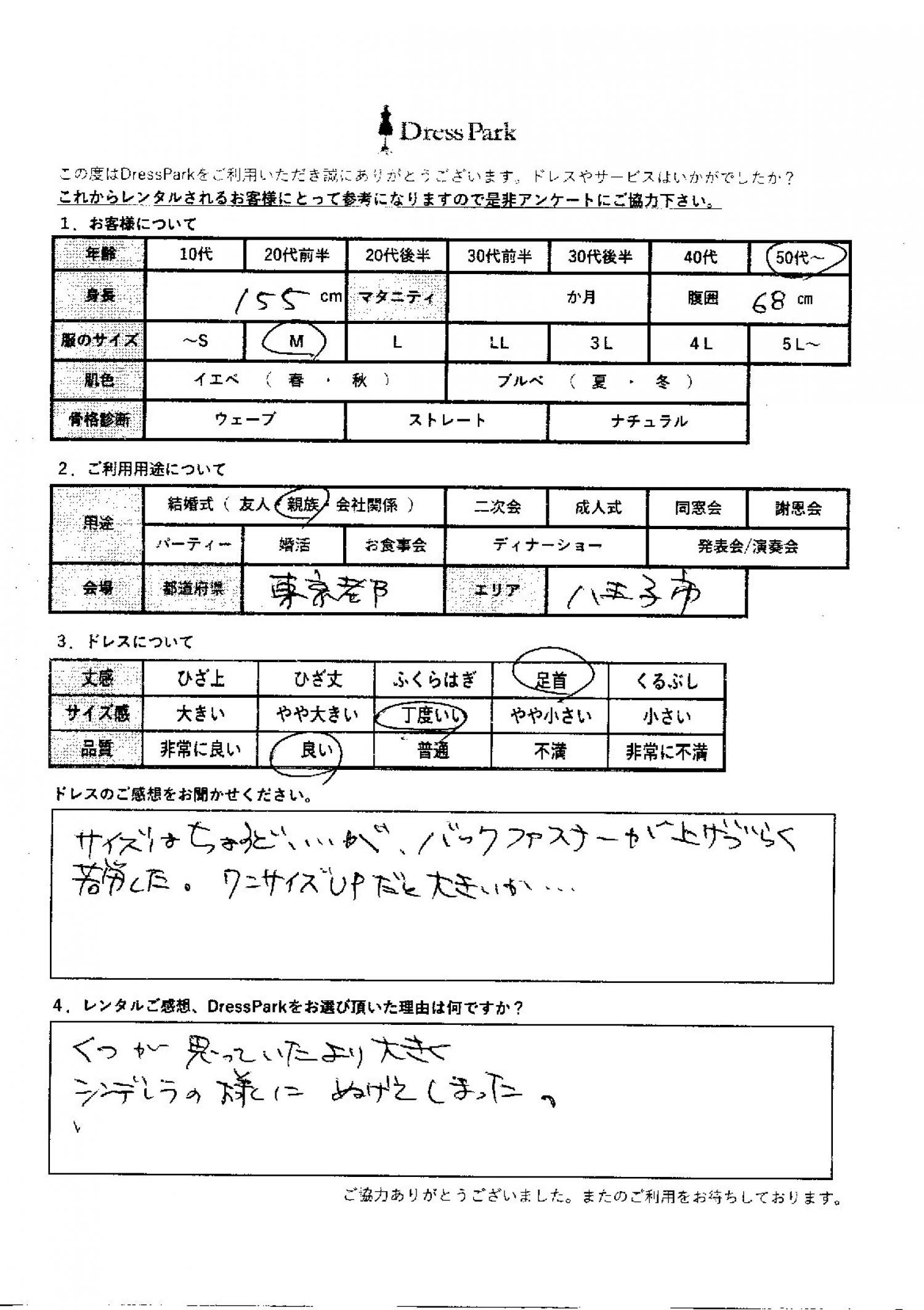 サイズはちょうど良いが、バックファスナーがあげづらく苦労した。ワンサイズアップだと大きいか…レンタルのご感想、