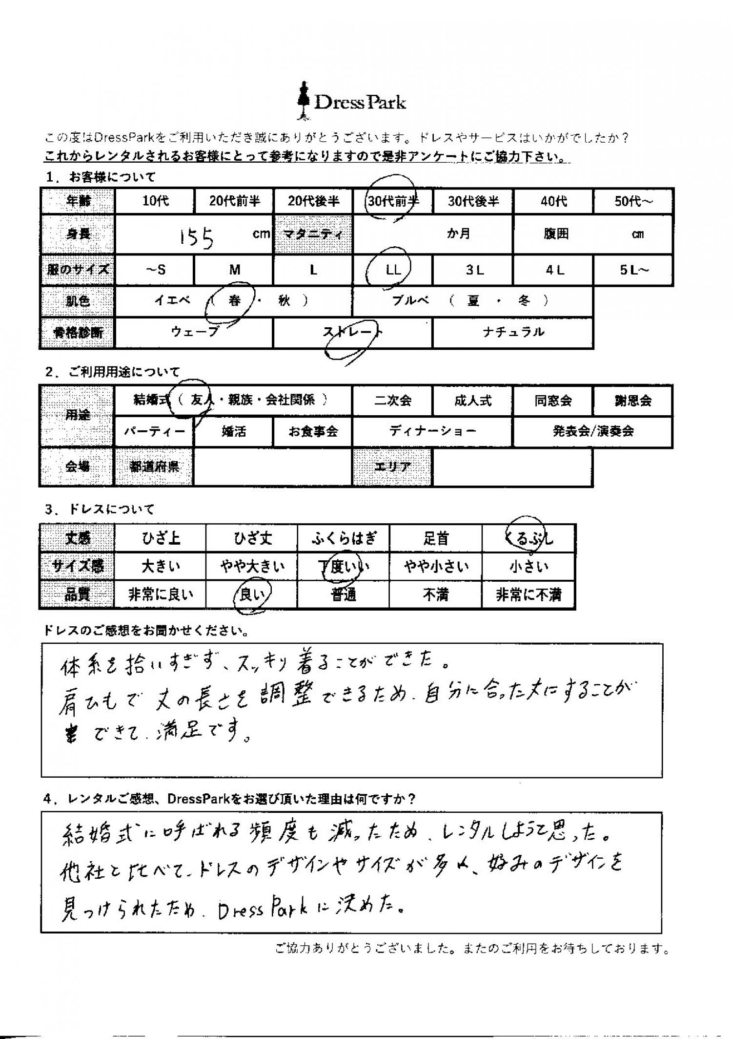 結婚式に呼ばれる頻度も減ったため、レンタルしようと思った。他社と比べてドレスのデザインやサイズが多め。好みのデザインを見つけられたためドレスパークに決めた。