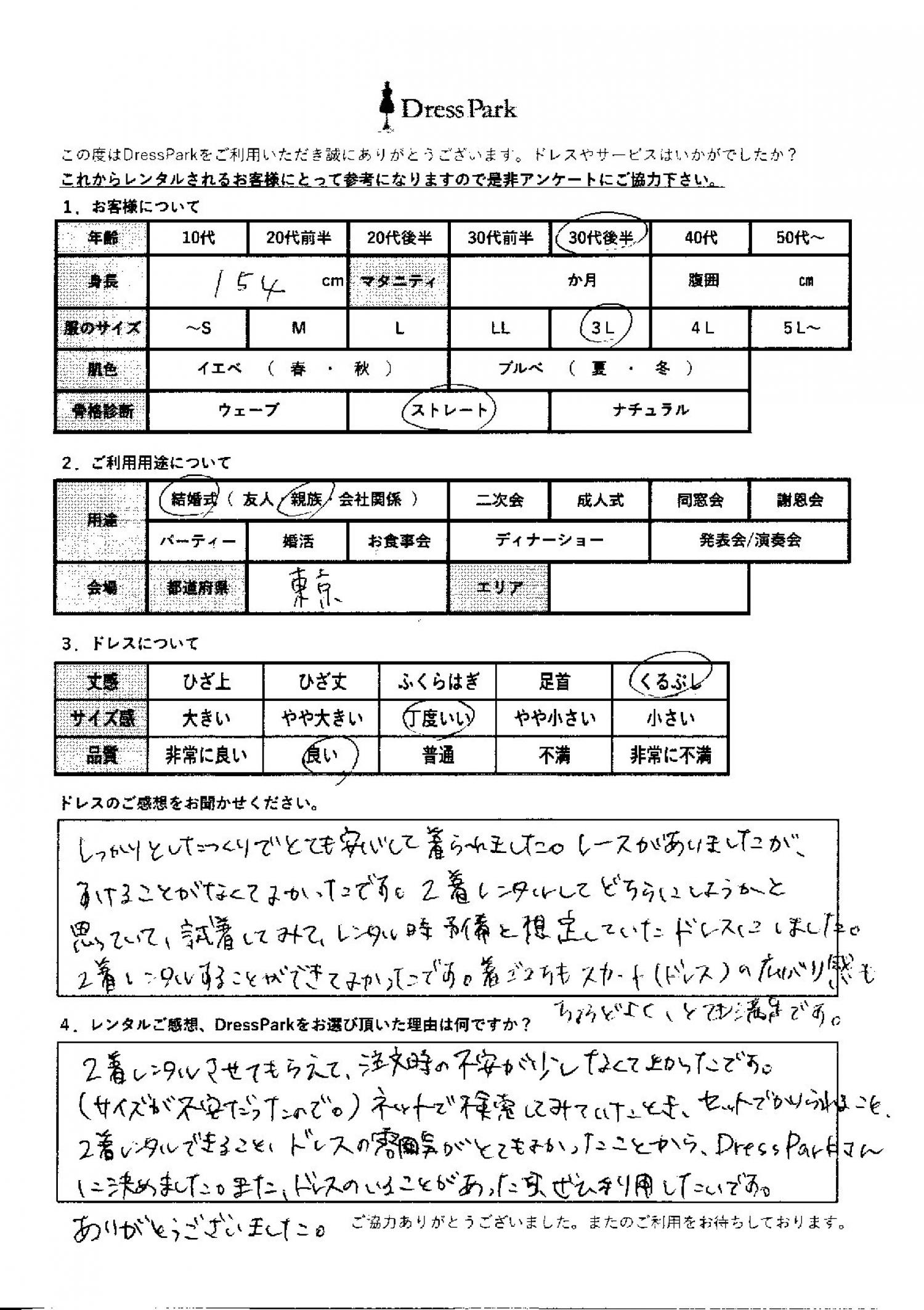 2着レンタルさせてもらえて、注文時の不安が少しなくてよかったです。(サイズが不安だったので)ネットで検索してみたとき、セットで借りられるとこ、2着レンタルできるとこ、ドレスの雰囲気がとても良かったことから、ドレスパークさんに決めました。またドレスのいることがあったら、ぜひ利用したいです。ありがとうございました。