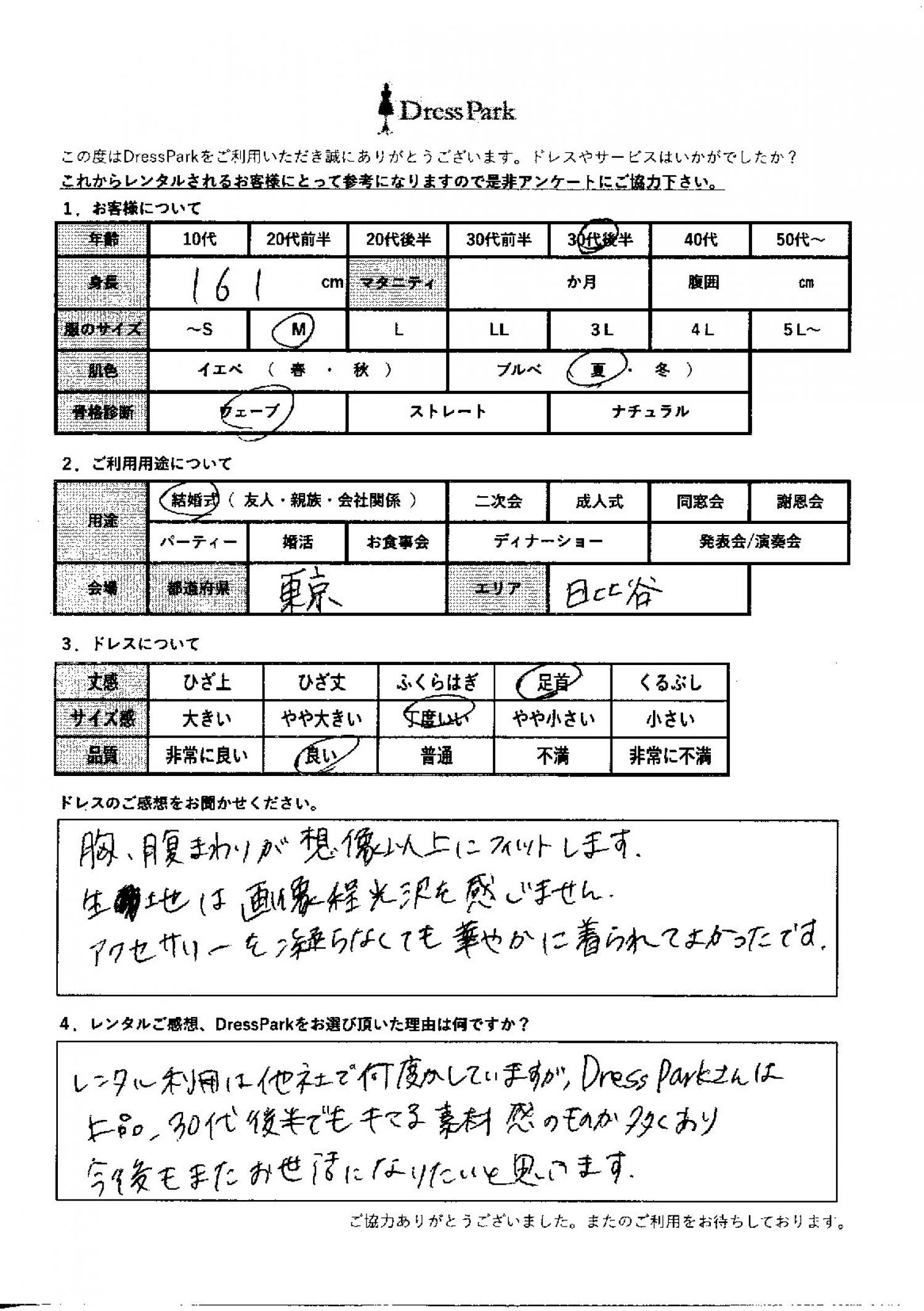 レンタル利用は他社で何度かしていますが、ドレスパークさんは上品、30代後半でもキマる素材感のものが多くあり、今後もまたお世話になりたいと思います。