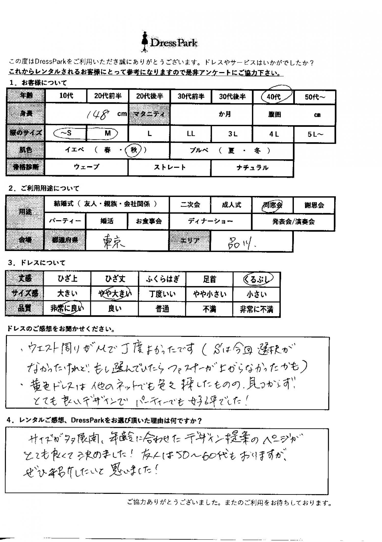 ウェスト周りがMでちょうど良かったです。(Sは今回選択がなかったけれど、もし選んでいたらファスナーが上がらなかったかも)黄色ドレスは、他のネットでもいろいろ探したものの見つからず、とても良いデザインでパーティーでも好評でした!レンタルのご感想、