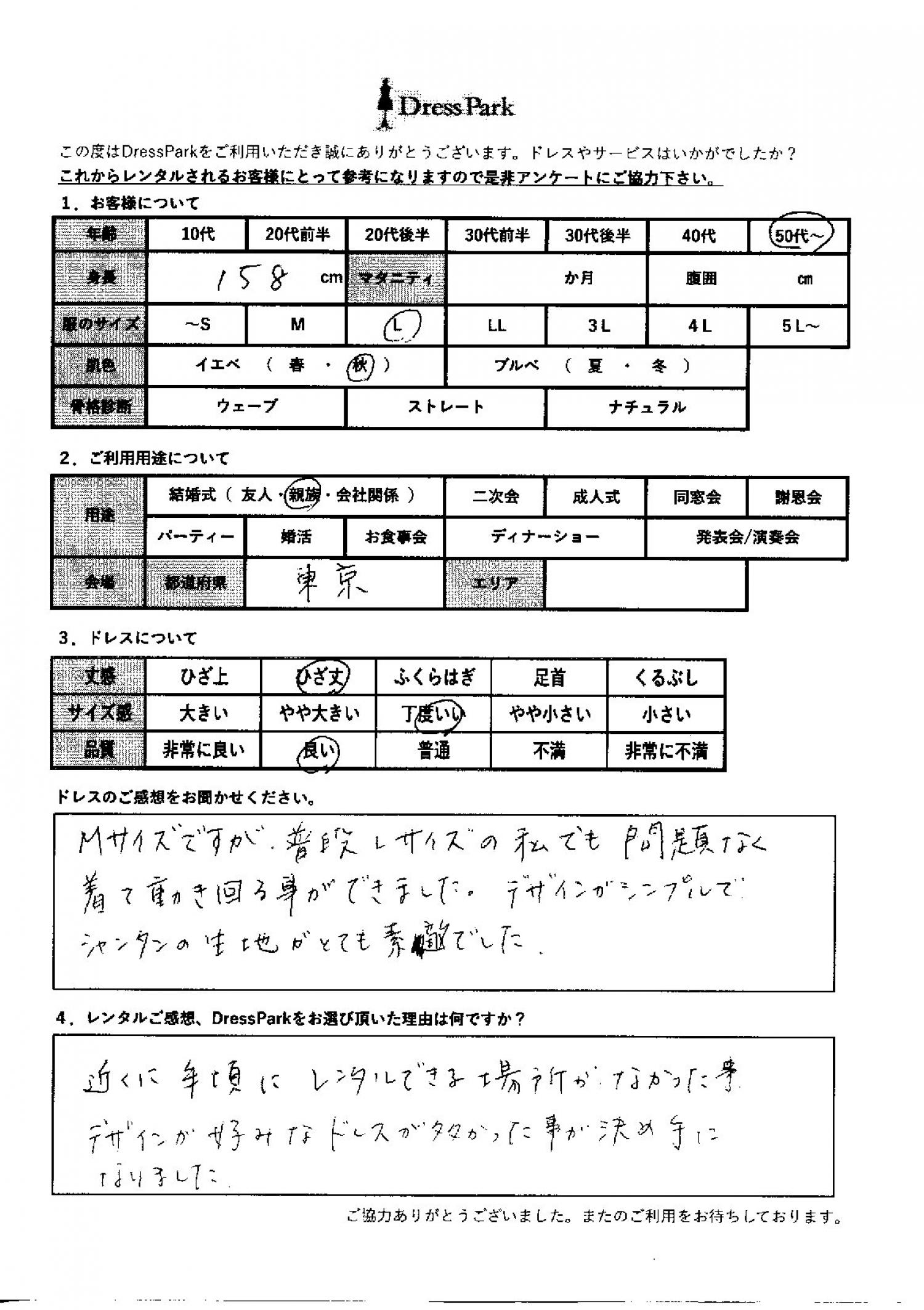 Mサイズですが、普段Lサイズの私でも問題なく着て動き回ることができました。デザインがシンプルでシャンタンの生地がとても素敵でした。レンタルのご感想、
