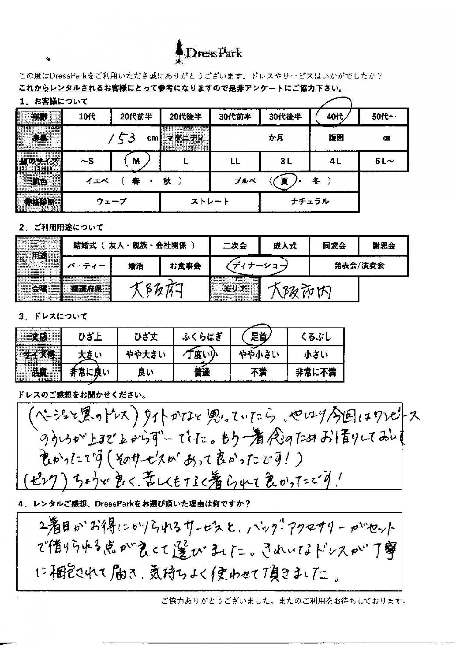 (ベージュと黒のドレス/DPSET0630)タイトかなと思っていたら、やはり今回はワンピースの後ろが上まで上がらずでした。もう1着そのためお借りしておいてよかったです。(そのサービスがあってよかったです!)(ピンク)ちょうど良く、苦しくもなく、着られてよかったです!