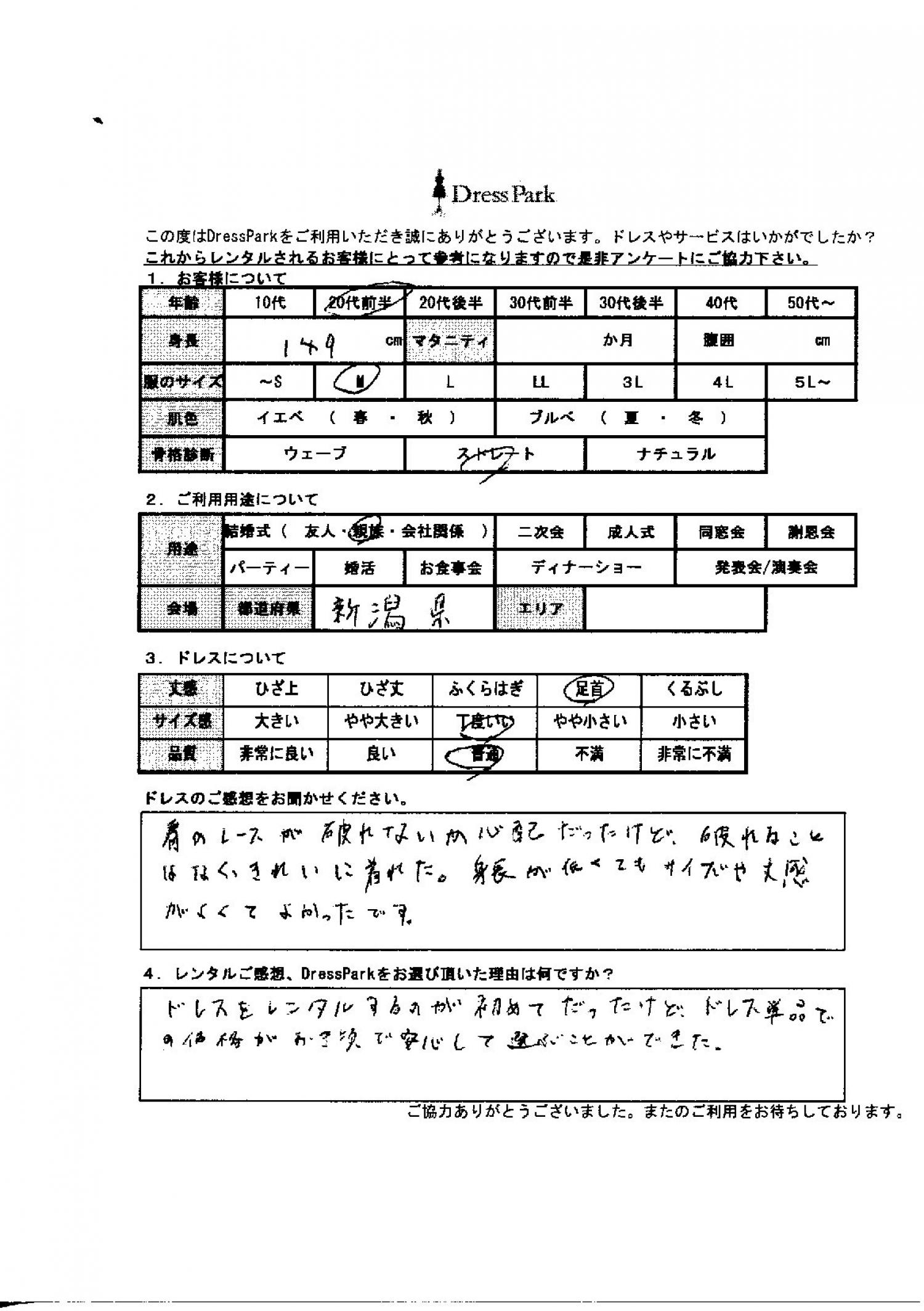 肩のレースが破れないか心配だったけど、破れる事はなくきれいに着られた。身長が低くてもサイズや丈感が良くて良かったです。レンタルのご感想、