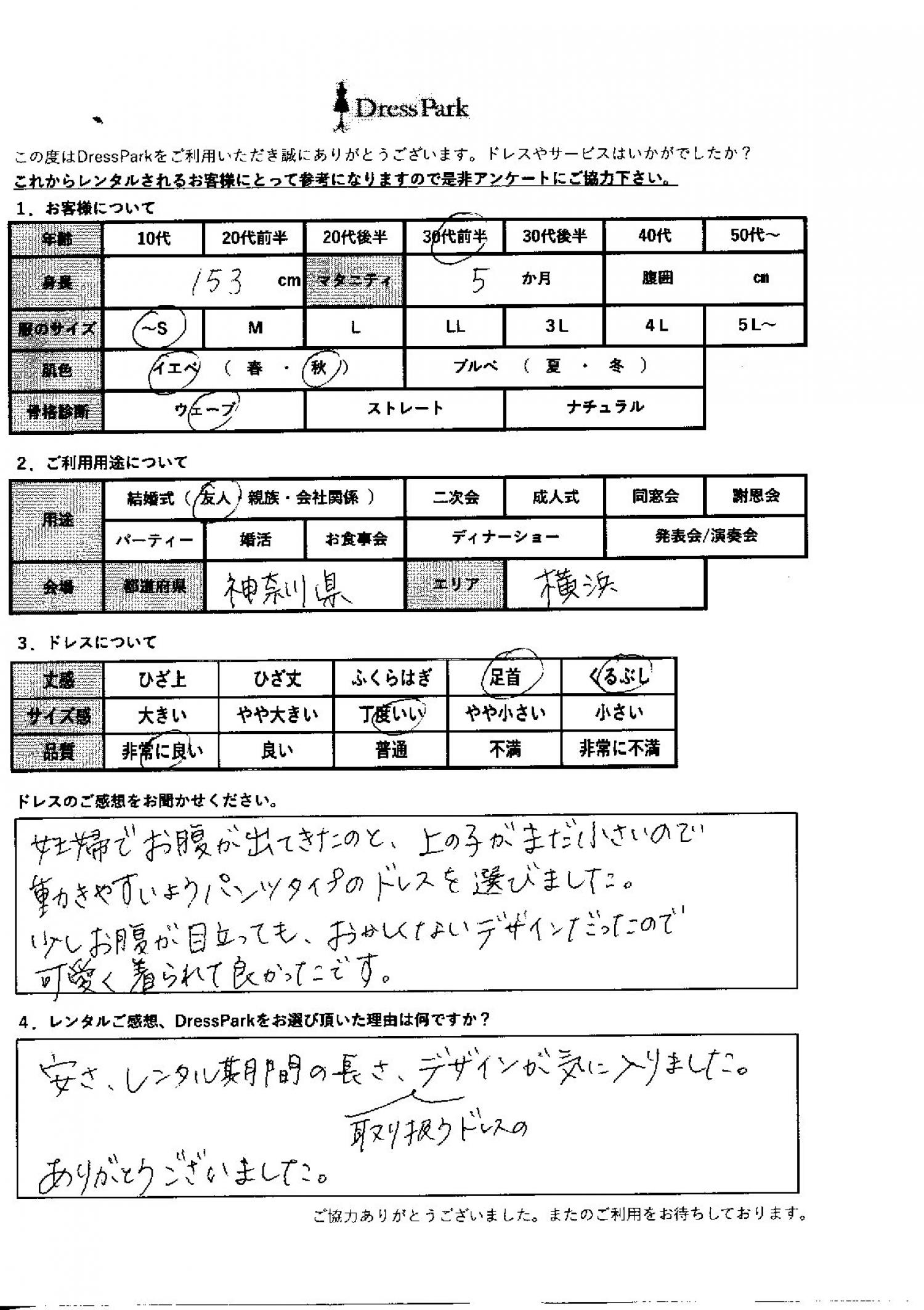 妊婦でお腹が出てきたのと、上の子がまだ小さいので、動きやすいようパンツタイプのドレスを選びました。少しお腹が目立ってもおかしくないデザインだったので、可愛く着られてよかったです。レンタルのご感想、